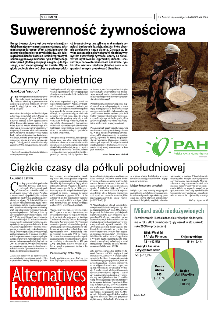 I| SUPLEMENT Le Monde diplomatique – PAŹDZIERNIK 2009 Suwerenność żywnościowa Kryzys żywnościowy jest bez wątpienia najbardziej dramatycznym przejawem globalnego załamania gospodarczego. W tej dziedzinie strat nie mierzy się górami straconych dolarów, ale dziesiątkami milionów ludzkich istnień zagrożonych śmiercią głodową i milionami tych, którzy chcąc uciec przed głodem podejmują emigrację do lepszego, choć nieprzyjaznego im świata. Klęska głodu pogłębia się choć obecny poziom produk- cji żywności wystarczyłby na wykarmienie populacji trzykrotnie liczniejszej niż ta, która obecnie zamieszkuje naszą planetę. Oznacza to, że winą za sytuację należy obarczyć nieefektywny system dystrybucji żywności oparty na całkowitym urynkowieniu jej produkcji i handlu. Liberalizacja pozwoliła koncernom opanować rynki rolne, narzucić biednym globalne ceny, a na gruntach rolnych produkować biopaliwa. Czyny nie obietnice Jean-Louis Vielajus* C zy wiecie jak Haitanka oszukuje głód? Je grudki ziemi. Codzienność wieśniaczki z Burkiny to gotowane w wodzie liście szczawiu z dodatkiem odrobiny mąki. Jej ciągły lęk to, „aby tylko dzieci miały co zjeść”. Obecnie na świecie jest miliard ludzi podobnych do tych dwóch kobiet. Muszą oni codziennie walczyć z głodem. Miliard czyli tyle co ludność Stanów Zjednoczonych i Unii Europejskiej razem wzięta. Kraje, które podczas krachu finansowego błyskawicznie zorganizowały i wpompowały w systemy finansowe wiele miliardów dolarów. Jeśli nawet notujemy obecnie wzrost liczby osób niedożywionych w krajach rozwiniętych, miliard głodujących pochodzi w znacznej mierze z krajów najbiedniejszych. Dzisiaj jest ich sto milionów więcej niż w 2008 r. Przypomnijmy, że w roku * Dyrektor Francuskiego Komitetu ds. Solidarności Międzynarodowej (CFSI). 2000 społeczność międzynarodowa zobowiązała się zmniejszyć o połowę proporcję głodujących w stosunku do liczby ludności świata do 2015 r. Czy warto wspominać o tym, że cel ten nie zostanie osiągnięty? Nie znaczy to jednak, że trwałe ograniczenie głodu nie jest możliwe. Aby tego dokonać trzeba spełnić trzy warunki. Po pierwsze musimy porzucić myśl, że kraje o rozwiniętym rolnictwie powinny wyżywić świat. Kraje te, w tym także Francja, powinny zająć się przede wszystkim promocją rolnictwa, które dostarczałoby zdrowe produkty żywnościowe w ilościach wystarczających dla obywateli i którego rentowność nie byłaby uzależniona od sprzedaży nadwyżki produktów na rynku światowym. Następnie należy zrozumieć, że kraje najuboższe mogą – one także – rozwijać u siebie rolnictwo zdolne do wykarmienia swoich mieszkańców. W tym kontekście kontynent afrykański posiada największą rezerwę ziemi uprawnej na świecie i możliwa jest tam – jeśli dostarczymy odpowiednie środki – produkcja znacznej ilości pożywienia. Do- wodem na to jest obecna rywalizacja krajów rozwiniętych i krajów arabskich o dzierżawę ogromnych powierzchni ziemi afrykańskiej w celu zapewnienia sobie bezpieczeństwa żywnościowego! Ponadto należy zmobilizować pomoc międzynarodową w celu przyciągnięcia inwestycji niezbędnych dla zrównoważonego rozwoju rolnictwa, które byłoby zdolne wyżywić ludność krajów najuboższych. Jeśli budżety narodowe tych krajów nie wystarczą, realizacja tego niezbędnego dla jakiegokolwiek postępu celu winna stać priorytetem społeczności międzynarodowej. Połączenie tych trzech warunków zapewni trwałe rozwiązanie żywnościowego dramatu. W imię zasady suwerenności żywnościowej od 50 lat udaje nam się, raz lepiej raz gorzej, zapewnić we Francji bezpieczeństwo żywnościowe dla znacznej większości naszych obywateli. W imię solidarności międzynarodowej działajmy na rzecz stworzenia takiej samej suwerenności w krajach uboższych. tłum. Janusz Kruszelnicki WWW.PAH.ORG.PL Ciężkie czasy dla półkuli południowej Laurence Estival C zas kryzysu winduje pod niebo statystyki dotyczące osób niedożywionych. W tej sytuacji podstawowym zadaniem stało się zwiększenie pomocy dla krajów Południa – a tymczasem kraje półkuli północnej mają problemy z dotrzymaniem obietnic, które złożyły do tej pory. W dniach 8-10 lipca tego roku we włoskim mieście L’Aquila odbyło się spotkanie państw członkowskich grupy G8 z przedstawicielami państw wschodzących oraz kilku krajów rozwijających się. Po spotkaniu podpisano „Deklarację dotyczącą bezpieczeństwa żywnościowego na świecie”. W ciągu najbliższych trzech lat zostanie uruchomionych 20 miliardów dolarów w odpowiedzi na kryzys żywnościowy, który dotknął szeregu państw Południa. To nowe „światowe partnerstwo” powinno pomóc przełożyć obietnice na język konkretów przy okazji Światowego Szczytu Żywnościowego, zaplanowanego na 16-18 listopada br. w Rzymie. Rok po zamieszkach wywołanych głodem po gwałtownym wzroście kursów surowców na światowym rynku (między końcem 2007 r. a kwietniem 2008 r.) wspólnota międzynarodowa znów stara się stanąć na wysokości zadania. Tymczasem w terenie sytuacja nie przestaje się pogarszać. Zniżka cen surowców po zeszłorocznym urodzaju (wciąż pozostają one jednak o 24% wyższe niż w 2006 r.), a także kryzys świa- WWW.ALTERNATIVES-ECONOMIQUES.FR towy zepchnęły kryzys żywnościowy na dalszy plan – dziś jednak problem ten powraca, i to w galopującym tempie. Organizacja Narodów Zjednoczonych ds. Wyżywienia i Rolnictwa (FAO) 19 czerwca br. opublikowała zatrważające liczby: w 2009 r. przekroczony zostanie próg miliarda osób głodujących na świecie – oznacza to wzrost o 100 milionów względem 2008 r. Liczba dotkniętych głodem mieszkańców wzrośnie o 10,5% w Azji, o 11,8% w Afryce (gdzie i tak niedożywiona jest niemal co trzecia osoba, 32%) i o 12,8% na Karaibach. Według przygotowanego przez agencję