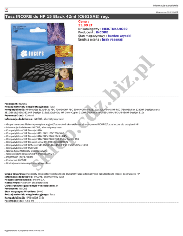 Informacje o produkcie Utworzono 02-03-2017 Tusz INCORE do HP 15 Black 42ml (C6615AE) reg. Cena : 23,99 zł .b iz .p l Nr katalogowy : MEICTKKAH030 Producent : INCORE Stan magazynowy : bardzo wysoki Średnia ocena : brak recenzji ● ● ● ● ● ● ● ● ● ● ● ● Grupa towarowa:Materiały eksploatacyjne\Tusze do drukarek\Tusze alternatywne INCORE\Tusze Incore do urządzeń HP Informacje dodatkowe:INCORE, alternatywny tusz Kompatybilność:HP Deskjet 810c Kompatybilność:HP Deskjet 812c/842c PSC 700/900 Kompatybilność:HP Deskjet 816c/825c/840c/843c/845c Kompatybilność:HP Deskjet 916c/920c/940c/ HP Color Copier 310 Kompatybilność:HP Deskjet seria 3810/3816/3820/3822 Kompatybilność:HP Officejet 5110/v30/v40/v45/HP PSC 750/950/Fax 1230 Kompatybilność:HP PSC 500 Nazwa typu:Materiały eksploatacyjne Okres rękojmi (gwarancji) w miesiącach:24 Pojemność (ml):42.0 ml Producent:INCORE Rodzaj materiału eksploatacyjnego:Tusz le p ● sk ● .c dz Producent: INCORE Rodzaj materiału eksploatacyjnego: Tusz Kompatybilność: HP Deskjet 812c/842c PSC 700/900HP PSC 500HP Officejet 5110/v30/v40/v45/HP PSC 750/950/Fax 1230HP Deskjet seria 3810/3816/3820/3822HP Deskjet 916c/920c/940c/ HP Color Copier 310HP Deskjet 816c/825c/840c/843c/845cHP Deskjet 810c Pojemność (ml): 42.0 ml Informacje dodatkowe: INCORE, alternatywny tusz Grupa towarowa: Materiały eksploatacyjne\Tusze do drukarek\Tusze alternatywne INCORE\Tusze Incore do drukarek HP Informacje dodatkowe: INCORE, alternatywny tusz Miejsce serwisowania: Incom S.A. Nazwa typu: Materiały eksploatacyjne Okres rękojmi (gwarancji) w miesiącach: 24 Producent: INCORE Stan magazynu Wrocław: 30.00 Rodzaj materiału eksploatacyjnego: Tusz Kompatybilność: HP Deskjet 810c Pojemność (ml): 42.0 ml Wygenerowano w programie www.oscGold.com