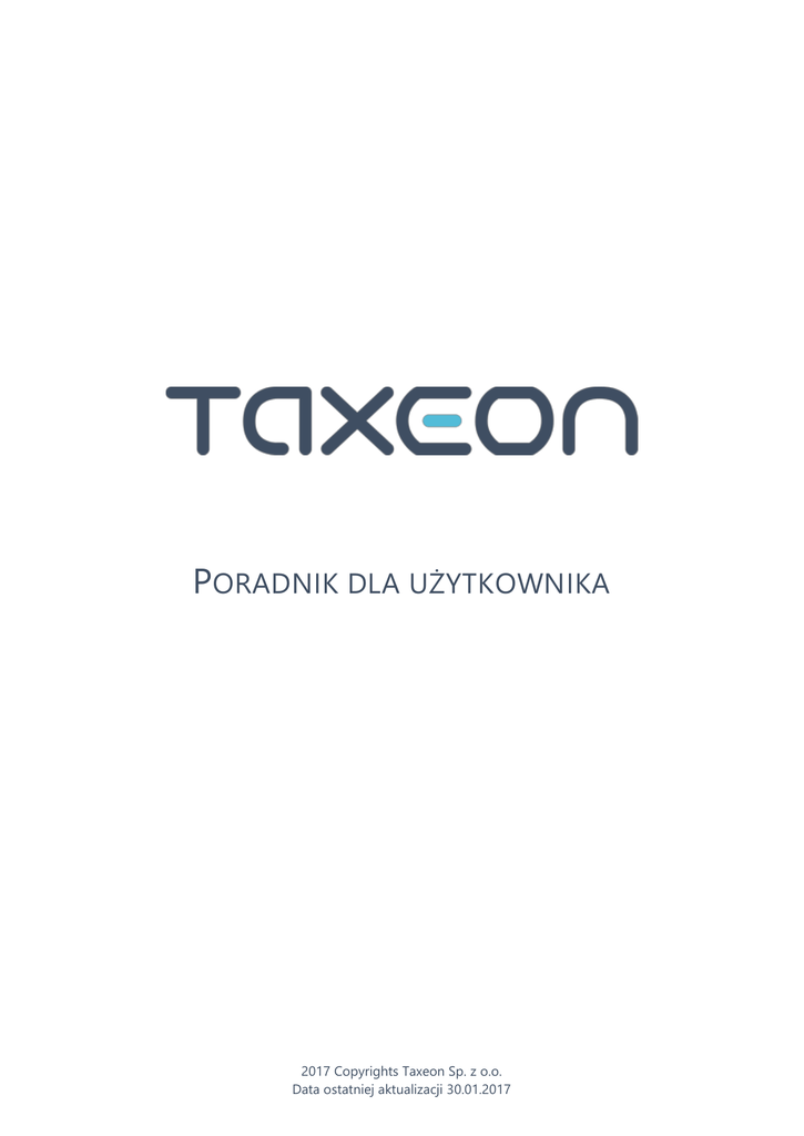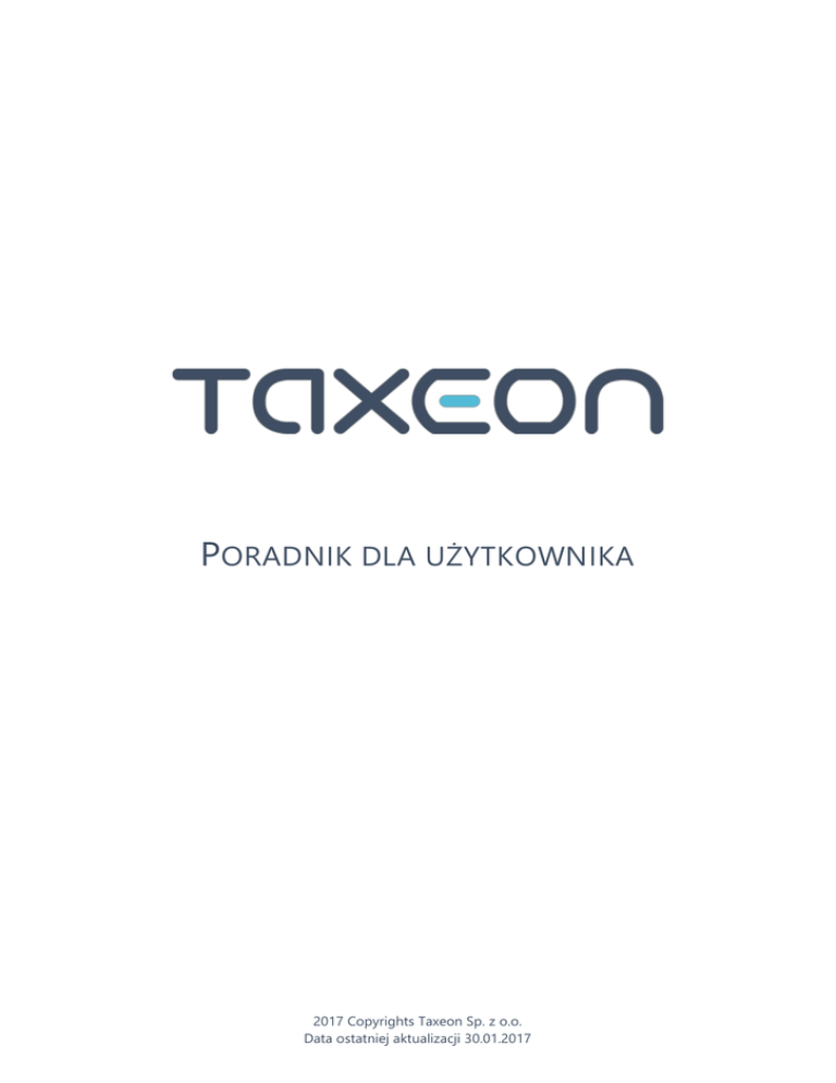 PORADNIK DLA UŻYTKOWNIKA 2017 Copyrights Taxeon Sp. z o.o. Data ostatniej aktualizacji 30.01.2017 SPIS TREŚCI Wstęp ..................................................................................................................................................................................................1 Część 1................................................................................................................................................................................................2 Podatek dochodowy ................................................................................................................................................................2 VAT ..................................................................................................................................................................................................8 ZUS ............................................................................................................................................................................................... 10 Samochód ................................................................................................................................................................................. 13 Zawieszenie działalności ...................................................................................................................................................... 15 Część 2............................................................................................................................................................................................. 16 Ustawienia ................................................................................................................................................................................. 16 Majątek ....................................................................................................................................................................................... 19 Wystawianie faktur i innych dokumentów przychodowych .................................................................................. 19 Wprowadzanie kosztów ....................................................................................................................................................... 21 Bilans otwarcia ......................................................................................................................................................................... 23 Rozliczenie okresu .................................................................................................................................................................. 24 Zaproszenie do kontaktu ......................................................................................................................................................... 25 TAXEON Poradnik dla użytkownika WSTĘP Przedstawiamy opracowanie zawierające zbiór porad dotyczących podstawowych kwestii związanych z prowadzeniem działalności gospodarczej i korzystaniem z programu dla samodzielnych przedsiębiorców TAXEON. Poradnik ten podzielony jest na dwie części: Pierwsza zawiera krótkie przypomnienie teoretycznych zagadnień związanych z najważniejszymi dla przedsiębiorcy sprawami, mianowicie podatkiem dochodowym, podatkiem VAT, składkami ZUS i rozliczaniem samochodu. Dla dociekliwych użytkowników jest źródłem informacji, z jakich danych i działań korzysta TAXEON do obliczania zaliczek na podatek dochodowy i składek ZUS. Druga część skupia się na objaśnieniu ustawień i działania programu TAXEON. TAXEON jest intuicyjny i prosty w obsłudze, dlatego poradnik skupia się tylko na tych elementach, które mogą budzić wątpliwości w związku z zastosowaniem określonych ustawień związanych z przepisami. Mamy nadzieję, że to opracowanie będzie dla Was źródłem cennych wskazówek i w chwilach wątpliwości będzie odpowiadało na Wasze pytania. Zespół TAXEON TAXEON Poradnik dla użytkownika 1/25 CZĘŚĆ 1 PODATEK DOCHODOWY NA ZASADACH OGÓLNYCH 18% dochodu do kwoty 85 528 zł, 32% nadwyżki dochodu powyżej kwoty 85 528 zł uwzględnianie ulg i przywilejów, np. kwota wolna od podatku Algorytm wyliczania zaliczki dla podatku na zasadach ogólnych, czyli według skali podatkowej: ustalenie wartości przychodu ze sprzedaży narastająco od początku roku (uwaga: przychód obejmuje również kwoty jeszcze nie uregulowane przez kontrahentów, na które zostały wystawione dokumenty sprzedaży), ustalenie wartości poniesionych kosztów narastająco od początku roku, ustalenie wartości dochodu poprzez odjęcie od przychodu kosztów jego uzyskania, ustalenie podstawy opodatkowania za dany okres – poprzez odjęcie od dochodu ulg i możliwych odliczeń (w tym zapłaconych składek za ubezpieczenie społeczne), straty ponoszonej w latach poprzednich, którą można odliczyć w tym roku (nie więcej niż 50% wykazanej straty), ustalenie wartości podatku dochodowego, korzystając ze skali podatkowej 18 i 32%, ustalenie zaliczki poprzez obniżenie podatku dochodowego o roczną kwotę zmniejszającą podatek, odliczenie wynikające z zapłaconej składki zdrowotnej i dotychczas zapłacone zaliczki. Uwaga: Składki na ubezpieczenie społeczne są w pełnej kwocie dopisywane do kosztów, obniżając dochód i co za tym idzie wysokość zaliczki na podatek dochodowy. Część składki na ubezpieczenie zdrowotne jest bezpośrednio odliczana od zaliczki na podatek dochodowy. Składka zdrowotna wynosi 9% podstawy wymiaru, podczas kiedy odliczeniu od podatku dochodowego podlega 7,75% wymiaru. Więcej na temat składek ZUS znajdziesz tutaj. W SKRÓCIE dochód = przychód należny – koszty podstawa opodatkowania = dochód – ulgi – odliczenia – straty podatek dochodowy = 18% lub 32% podstawy opodatkowania zaliczka = podatek dochodowy – roczna kwota zmniejszają