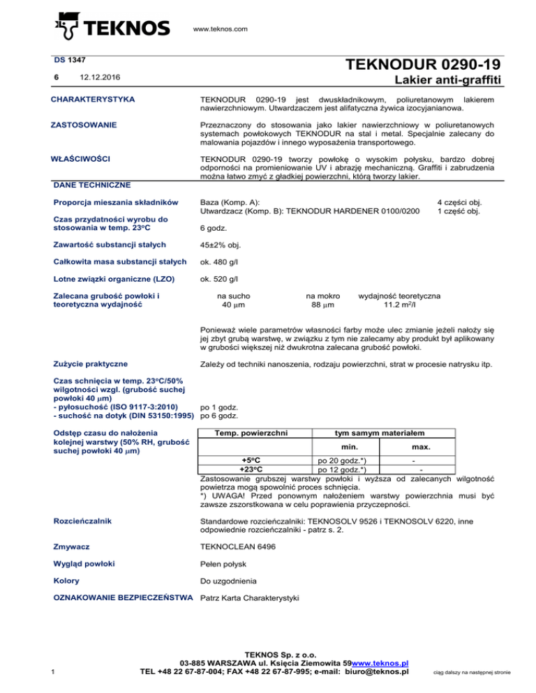 www.teknos.com DS 1347 6 TEKNODUR 0290-19 12.12.2016 Lakier anti-graffiti CHARAKTERYSTYKA TEKNODUR 0290-19 jest dwuskładnikowym, poliuretanowym lakierem nawierzchniowym. Utwardzaczem jest alifatyczna żywica izocyjanianowa. ZASTOSOWANIE Przeznaczony do stosowania jako lakier nawierzchniowy w poliuretanowych systemach powłokowych TEKNODUR na stal i metal. Specjalnie zalecany do malowania pojazdów i innego wyposażenia transportowego. WŁAŚCIWOŚCI TEKNODUR 0290-19 tworzy powłokę o wysokim połysku, bardzo dobrej odporności na promieniowanie UV i abrazję mechaniczną. Graffiti i zabrudzenia można łatwo zmyć z gładkiej powierzchni, którą tworzy lakier. DANE TECHNICZNE Proporcja mieszania składników Baza (Komp. A): Utwardzacz (Komp. B): TEKNODUR HARDENER 0100/0200 Czas przydatności wyrobu do stosowania w temp. 23oC 6 godz. Zawartość substancji stałych 45±2% obj. Całkowita masa substancji stałych ok. 480 g/l Lotne związki organiczne (LZO) ok. 520 g/l Zalecana grubość powłoki i teoretyczna wydajność na sucho 40 µm na mokro 88 µm 4 części obj. 1 część obj. wydajność teoretyczna 11.2 m2/l Ponieważ wiele parametrów własności farby może ulec zmianie jeżeli nałoży się jej zbyt grubą warstwę, w związku z tym nie zalecamy aby produkt był aplikowany w grubości większej niż dwukrotna zalecana grubość powłoki. Zużycie praktyczne Zależy od techniki nanoszenia, rodzaju powierzchni, strat w procesie natrysku itp. Czas schnięcia w temp. 23oC/50% wilgotności wzgl. (grubość suchej powłoki 40 µm) - pyłosuchość (ISO 9117-3:2010) po 1 godz. - suchość na dotyk (DIN 53150:1995) po 6 godz. Odstęp czasu do nałożenia kolejnej warstwy (50% RH, grubość suchej powłoki 40 µm) Temp. powierzchni tym samym materiałem min. max. o +5 C po 20 godz.*) +23oC po 12 godz.*) Zastosowanie grubszej warstwy powłoki i wyższa od zalecanych wilgotność powietrza mogą spowolnić proces schnięcia. *) UWAGA! Przed ponownym nałożeniem warstwy powierzchnia musi być zawsze zszorstkowana w celu poprawienia przyczepności. Rozcieńczalnik Standardowe rozcieńczalniki: TEKNOSOLV 9526 i TEKNOSOLV 6220, inne odpowiednie rozcieńczalniki - patrz s. 2. Zmywacz TEKNOCLEAN 6496 Wygląd powłoki Pełen połysk Kolory Do uzgodnienia OZNAKOWANIE BEZPIECZEŃSTWA Patrz Karta Charakterystyki 1 TEKNOS Sp. z o.o. 03-885 WARSZAWA ul. Księcia Ziemowita 59www.teknos.pl TEL +48 22 67-87-004; FAX +48 22 67-87-995; e-mail: [email protected] ciąg dalszy na następnej stronie TEKNODUR 0290-19 SPOSÓB STOSOWANIA Przygotowanie podłoża DS 1347-6 strona 2 Usunąć z podłoża wszelkie zanieczyszczenia, które mogą niekorzystnie wpływać na proces przygotowania podłoża i malowania. Usunąć również rozpuszczalne w wodzie sole stosując odpowiednie metody. Powierzchnię należy oczyścić zależnie od rodzaju podłoża, jak niżej: Powierzchnie malowane: Wszelkie zanieczyszczenia, które mogą niekorzystnie wpływać na nakładanie farby (np. tłuszcze i sole) usunąć. Powierzchnia musi być czysta i sucha. Stare, pomalowane powierzchnie, które przekroczyły maksymalny odstęp czasu do nałożenia kolejnej warstwy należy zszorstkować. Uszkodzone fragmenty pomalowanej powierzchni należy przygotować do ponownego malowania zgodnie z wymaganiami stawianymi przez rodzaj podłoża i sposób renowacji. Czas i miejsce przygotowywania powinny być dobrane tak, ażeby powierzchnia przed malowaniem nie była brudna i wilgotna. Przygotowanie wyrobu Przygotować tylko taką ilość lakieru, którą zużyje się w czasie krótszym niż czas przydatności mieszaniny do stosowania. Składniki, w prawidłowej proporcji, na krótko przed użyciem, należy dokładnie wymieszać w całej objętości zbiornika. Niedokładne wymieszanie lub nieprawidłowy stosunek składników są przyczyną nieprawidłowego utwardzania i pogorszenia się własności powłoki. Warunki podczas nakładania Powierzchnia do malowania musi być sucha. Temperatura otaczającego powietrza, malowanej powierzchni i farby powinna być wyższa niż +5°C, a wilgotność względna powietrza poniżej 80% zarówno podczas nakładania jak i w okresie schnięcia wyrobu. Dodatkowo, temperatura malowanej powierzchni oraz farby musi być wyższa niż +3oC powyżej punktu rosy otaczającego powietrza. UWAGA! Przed ponownym nałożeniem warstwy powierzchnia musi być zawsze zszorstkowana w celu poprawienia przyczepności. Nakładanie Farbę przed użyciem dokładnie wymieszać. Nanosić farbę natryskiem konwencjonalnym lub bezpowietrznym. Do natrysku bezpowietrznego zastosować dyszę o średnicy 0.011 - 0.013". Narzędzia malarskie i naczynia do mieszania farby umyć przed użyciem właściwym dla wyrobu rozcieńczalnikiem. Standardowe rozcieńczalniki: TEKNOSOLV 9526 i TEKNOSOLV 6220. Szybki rozcieńczalnik: TEKNOSOLV 9529, stosowany przy malowaniu powierzchni za pomocą natrysku metodą „mist coating”. dużych W razie konieczności farbę rozcieńczyć 10-30%. Nie należy używać uniwersalnych rozcieńczalników, ponieważ mogą one zawierać alkohole, które reagują z utwardzaczem. Zarówno utwardzacz jak i mieszanina zawiera izocyjaniany toteż zaleca się w czasie pracy i nanoszenia farby metodą natryskową stosowanie maski z dopływem świeżego powietrza. W przypadku prac krótkotrwałych i tymczasowych zaleca się stosowanie maski wyposażonej w filtr A2-P2. Chroniona wina być twarz i oczy. Utwardzacz otwierać ostrożnie ze względu na ryzyko wzrostu ciśnienia w puszce, w trakcie przechowywania. INFORMACJE DODATKOWE Data przydatności do użycia jest podana na etykiecie produktu. Przechowywać w chłodnym pomieszczeniu, w szczelnym opakowaniu. Utwardzacz reaguje z wilgocią z powietrza i dlatego musi być przechowywany w szczelnie zamkniętych naczyniach. Po otwarciu zaleca się zużyć utwardzacz w ciągu 14 dni. Dodatkowe informacje na temat przygotowania powierzchni można znaleźć w normie ISO 12944-4 i ISO 
