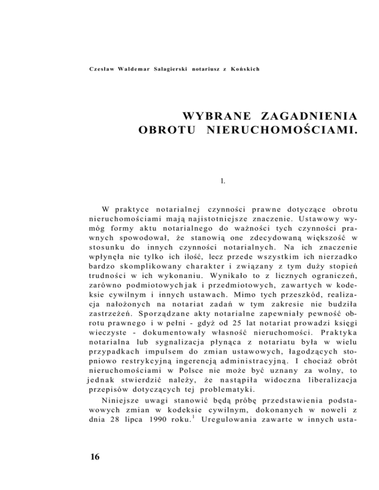 C z e s ł a w W a l d e m a r Salagierski notariusz z K o ń s k i c h WYBRANE ZAGADNIENIA OBROTU NIERUCHOMOŚCIAMI. 1. W p r a k t y c e n o t a r i a l n e j czynności p r a w n e dotyczące obrotu n i e r u c h o m o ś c i a m i m a j ą n a j i s t o t n i e j s z e znaczenie. U s t a w o w y wymóg formy a k t u n o t a r i a l n e g o do ważności tych czynności prawnych spowodował, że stanowią one zdecydowaną większość w s t o s u n k u do innych czynności n o t a r i a l n y c h . Na ich znaczenie wpłynęła nie tylko ich ilość, lecz przede w s z y s t k i m ich n i e r z a d k o bardzo s k o m p l i k o w a n y c h a r a k t e r i z w i ą z a n y z tym duży stopień t r u d n o ś c i w ich w y k o n a n i u . Wynikało to z licznych ograniczeń, zarówno podmiotowych j a k i przedmiotowych, z a w a r t y c h w kodeksie cywilnym i innych u s t a w a c h . Mimo tych przeszkód, realizacja nałożonych na n o t a r i a t z a d a ń w tym zakresie nie budziła zastrzeżeń. S p o r z ą d z a n e akty n o t a r i a l n e zapewniały pewność obrotu p r a w n e g o i w pełni - gdyż od 25 lat n o t a r i a t p r o w a d z i księgi wieczyste - d o k u m e n t o w a ł y własność nieruchomości. P r a k t y k a n o t a r i a l n a lub sygnalizacja p ł y n ą c a z n o t a r i a t u była w wielu p r z y p a d k a c h i m p u l s e m do z m i a n u s t a w o w y c h , łagodzących stopniowo r e s t r y k c y j n ą ingerencją a d m i n i s t r a c y j n ą . I chociaż obrót n i e r u c h o m o ś c i a m i w Polsce nie może być u z n a n y za wolny, to j e d n a k stwierdzić należy, że n a s t ą p i ł a widoczna liberalizacja przepisów dotyczących tej p r o b l e m a t y k i . N i n i e j s z e uwagi stanowić będą próbę p r z e d s t a w i e n i a podstawowych z m i a n w kodeksie cywilnym, d o k o n a n y c h w noweli z dnia 28 lipca 1990 roku. 1 U r e g u l o w a n i a z a w a r t e w innych usta- 16 W y b r a n e z a g a d n i e n i a obrotu n i e r u c h o m o ś c i a m i wach omówione zostaną tylko w tym zakresie, w j a k i m w i ą ż ą się z z a g a d n i e n i a m i , których dotyczy nowelizacja k.c. Dalszym, koniecznym ograniczeniem będzie zacieśnienie z a k r e s u wyłącznie do z a g a d n i e ń dotyczących obrotu cywilno - p r a w n e g o . I n n e zmiany k.c., n a w e t z w i ą z a n e z tą p r o b l e m a t y k ą , j a k np. z m i a n y w p r a w i e s p a d k o w y m , muszą zostać pominięte. Zmiany p r z e p i s ó w dotyczących obrotu n i e r u c h o m o ś c i a m i są bardzo szerokie, dlatego też opracowanie to nie może być szczegółową ich analizą. P o d s t a w o w y m jego celem j e s t p r z y d a t n o ś ć dla p r a k t y k i n o t a r i a l n e j . Zostaną więc p r z e d s t a w i o n e lub co najm n i e j z a s y g n a l i z o w a n e , problemy n a j i s t o t n i e j s z e , n i e r z a d k o kont r o w e r s y j n e . Zdanie autora będzie mogło posłużyć do pogłębionych d y s k u s j i nad poszczególnymi z a g a d n i e n i a m i , a te winny doprowadzić do w y p r a c o w a n i a j e d n o l i t e j p r a k t y k i notarialnej. II Zmiany w k.c. w p r o w a d z o n e nowelą lipcową są bez w ą t p i e n i a n a j b a r d z i e j r a d y k a l n e i głębokie od chwili jego w y d a n i a . Dotyczą wielu obszarów u r e g u l o w a ń p r a w n y c h z a w a r t y c h w tej u s t a w i e , dlatego też określenie h i e r a r c h i i n a j i s t o t n i e j s z y c h z nich będzie z pewnością p r z y d a t n e dla p r a k t y k i . Należy zgodzić się z J. Broiem, który wśród n a j w a ż n i e j s z y c h z m i a n w y m i e n i a : 2 a) w p r o w a d z e n i e zasady równości wobec p r a w a wszystkich podmiotów cywilnoprawnych, b) zniesienie typów i form własności i zróżnicowania ochrony własności p r z e j a w i a j ą c e j się w szczególnej ochronie własności społecznej, c) osłabienie zasady n o m i n a l i z m u i przywrócenie zasady r e b u s sic stantibus. Na p o c z ą t e k należy poświęcić kilka u w a g z m i a n o m przepisów k.c. z z a k r e s u zobowiązań, które będą miały istotne znaczenie przy s p o r z ą d z a n i u u m ó w sprzedaży nieruchomości. Dotyczą one n a j b a r d z i e j k r y t y k o w a n y c h w okresie ostatnich kilku lat uregulow a ń cywilnoprawnych, tj. zasady n o m i n a l i z m u i b r a k u klauzuli r e b u s sic s t a n t i b u s . 17 R E J E N T Nr 2 - c z e r w i e c 1991 r. T r w a j ą c a od dłuższego czasu wysoka inflacja spowodowała, że dłużnicy zobowiązani do świadczenia zwracali wierzycielom kwoty zgodne co p r a w d a z ich wysokością n o m i n a l n ą , j e d n a k bardzo zaniżone w s t o s u n k u do wartości realnej. Odbywało się to z pow a ż n y m p o k r z y w d z e n i e m wierzycieli, k t ó r e m u nie były w stanie zapobiec w y r a ź n i e podwyższone odsetki u s t a w o w e . Dla p r a k t y k i n o t a r i a l n e j z a s a d a n o m i n a l i z m u miała bardzo n i e k o r z y s t n e znaczenie, gdyż istotnie ograniczała wiarygodność a k t u n o t a r i a l n e go, ponieważ zainteresowani dokumentujący obrót n i e r u c h o m o ś c i a m i we właściwej formie a k t u n o t a r i a l n e g o uregulowania dotyczące zapłaty reszty ceny określali w innych niż notarialne dokumentach. Lipcowa nowela przepisów k.c. uchyliła art. 358 § 2 tej u s t a w y oraz a r t y k u ł y 1, 3 i 5 d e k r e t u z dnia 27 lipca 1949 r. o z a c i ą g a n i u nowych i określeniu wysokości nie u m o r z o n y c h zobowiązań, które określały zasadę n o m i n a l i z m u w systemie p r a w a polskiego. Nie oznacza to j e d n a k , że n o m i n a l i z m został w zupełności wyelim i n o w a n y . U s t a w o d a w c a w odrębnym przepisie art. 358 k.c. poddał tę zasadę istotnym ograniczeniom. Zgodnie z tym przepisem zobowiązanie, którego p r z e d 