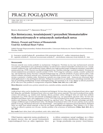prace poglądowe Polim. Med. 2013, 43, 3, 183–189 ISSN 0370-–0747 © Copyright by Wroclaw Medical University Benita KostrzewaB, D, Zbigniew RybakA, C, E, F Rys historyczny, teraźniejszość i przyszłość biomateriałów wykorzystywanych w sztucznych zastawkach serca History, Present and Future of Biomaterials Used for Artificial Heart Valves Zakład Chirurgii Eksperymentalnej i Badania Biomateriałów, Uniwersytet Medyczny im. Piastów Śląskich we Wrocławiu, Wrocław, Polska A – koncepcja i projekt badania; B – gromadzenie i/lub zestawianie danych; C – analiza i interpretacja danych; D – napisanie artykułu; E – krytyczne zrecenzowanie artykułu; F – zatwierdzenie ostatecznej wersji artykułu; G – inne Streszczenie Sztuczne zastawki serca można podzielić na mechaniczne i biologiczne. Wyróżnia się trzy typy mechanicznych zastawek serca: kulowe, jednodyskowe oraz z podwójnym dyskiem. Są wykonywane z różnych materiałów: mechaniczne m.in. z metali, ceramiki i polimerów (np.: stali nierdzewnej, tytanu, silikonu oraz węgla pyrolitycznego), biologiczne natomiast z materiałów syntetycznych (np.: PTFE i Dacron) oraz tkanek biologicznych (np.: osierdzia wołowego i zastawek świńskich). Wyróżnia się również implantowane przezskórnie zastawki aortalne (TAVI). TAVI mogą być wykonane z metalu, ceramiki i polimerów (np.: stali nierdzewnej, tytanu, Dacronu) i materiału biologicznego (np.: zastawek świńskich). W pracy opisano zalety i wady różnych rodzajów sztucznych zastawek serca. Żywotność mechanicznych zastawek serca to 20–30 lat i mogą być wykorzystywane u pacjentów w każdym wieku. Mechaniczne zastawki serca mają również wady – konieczne jest stosowanie leków antykoagulacyjnych w celu zapobiegania zakrzepicy. Biologiczne zastawki serca są wykonywane z naturalnego materiału, dlatego nie potrzebują przedłużonego leczenia antykoagulacyjnego. Ich żywotność to 10–15 lat, dlatego są zalecane pacjentom po 40. roku życia. Inny problem to występowanie zwapniania (Polim. Med. 2013, 43, 3, 183–189). Słowa kluczowe: zastawki serca, protezy zastawek serca, zastawka aortalna, zastawka mitralna. Abstract Artificial heart valves can be classified into mechanical and biological. We have three types of mechanical heart valves: caged ball, tilting disc and bileaflet. Mechanical heart valves are made from various materials. They may be produced from metals, ceramics and polymers, e.g.: stainless steel, titanium, silicone, pyrolytic carbon. Biological valves are made from synthetic components (e.g.: PTFE, Dacron) and materials of biological origin (e.g.: cow pericardium, pig heart valve). We have also identified transcatheter aortic valve implantation (TAVI). TAVI may be produced from metals, ceramics and polymers (e.g.: stainless steel, titanium, Dacron) and biological material (e.g.: pig heart valve). This paper describes advantages and disadvantages of different types of artificial heart valves. The lifespan of mechanical valves is 20–30 years and they can be used for patients of any age. Mechanical valves have also disadvantages – anticoagulants are required to prevent thrombosis. Biological valves are made from natural materials, so they do not require prolonged anticoagulation. Their lifetime is 10–15 years, so they are offered to patients over 40 years. Another problem is the occurrence of calcification (Polim. Med. 2013, 43, 3, 183–189). Key words: heart valves, heart valve prosthesis, aortic valve, mitral valve. Układ krążenia najprościej można przedstawić jako mięsień sercowy oraz sieć naczyń krwionośnych rozprowadzających krew po całym organizmie. Serce to dobrze umięśniony narząd znajdujący się w klatce piersiowej w worku osierdziowym. Składa się z prawego i lewego przedsionka oraz prawej i lewej komory. 184 B. Kostrzewa, Z. Rybak Mięsień ten jest „przyczepiony” do szkieletu włóknistego, który tworzą cztery zespolone ze sobą pierścienie otaczające ujścia przedsionkowo-komorowe oraz ujścia aorty i pnia płucnego. W pierścieniach tych znajdują się zastawki serca i pni tętniczych, które zapewniają odpływ i dopływ krwi do poszczególnych struktur serca i całego organizmu [1, 2]. W sercu można wyróżnić 4 zastawki: trójdzielną, mitralną, aortalną i pnia płucnego [2]. Zastawka trójdzielna (przedsionkowo-komorowa prawa), zbudowana zazwyczaj z 3 płatków jest odpowiedzialna za zapobieganie cofaniu się krwi z prawej komory do prawego przedsionka. Prawidłowo zamknięta zastawka trójdzielna umożliwia skierowanie krwi z komory prawej do pnia płucnego. Zastawka mitralna (dwudzielna, przedsionkowo-komorowa lewa) zapobiega cofaniu się krwi z lewej komory do lewego przedsionka. Składa się z 2 płatków: przedniego i tylnego, połączonych spoidłami: bocznym i przyśrodkowym. Zastawka aortalna zapobiega cofaniu się krwi z aorty do lewej komory. Wyróżnia się fazę skurczu i rozkurczu zastawki. W fazie skurczu, kiedy zastawka dwudzielna jest zamknięta, płatki zastawki aorty rozstępują się w kierunku ściany aorty i krew jest wyrzucana do aorty. Przy rozkurczu cofająca się krew wypełnia płatki półksiężycowate, powodując ich automatyczne zamknięcie oraz szczelne dociśnięcie brzegów do siebie. Zastawka pnia płucnego zapobiega cofaniu się krwi z pnia płucnego do prawej komory. Faza skurczowa i rozkurczowa działa podobnie jak w przypadku zastawki mitralnej i aortalnej. a) c) b) d) Podział sztucznych zastawek serca Sztuczne zastawki serca są implantami wszczepianymi w miejsce zmienionej chorobowo naturalnej zastawki serca. Obecnie używa się głównie dwóch typów sztucznych zastawek: mechanicznych i biologicznych. Struktura zastawki biologicznej jest podobna do naturalnej, zastawki mechaniczne charakteryzują się natomiast prostszą budową. Najczęściej uszkodzoną zastawką jest mitralna, rzadziej aortalna. W związku z bardzo dużym ryzykiem,