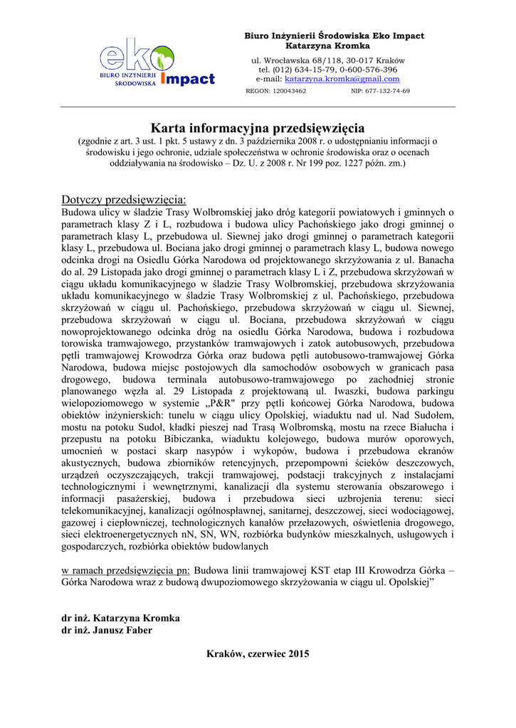 Biuro Inżynierii Środowiska Eko Impact Katarzyna Kromka ul. Wrocławska 68/118, 30-017 Kraków tel. (012) 634-15-79, 0-600-576-396 e-mail: [email protected] REGON: 120043462 NIP: 677-132-74-69 Karta informacyjna przedsięwzięcia (zgodnie z art. 3 ust. 1 pkt. 5 ustawy z dn. 3 października 2008 r. o udostępnianiu informacji o środowisku i jego ochronie, udziale społeczeństwa w ochronie środowiska oraz o ocenach oddziaływania na środowisko – Dz. U. z 2008 r. Nr 199 poz. 1227 późn. zm.) Dotyczy przedsięwzięcia: Budowa ulicy w śladzie Trasy Wolbromskiej jako dróg kategorii powiatowych i gminnych o parametrach klasy Z i L, rozbudowa i budowa ulicy Pachońskiego jako drogi gminnej o parametrach klasy L, przebudowa ul. Siewnej jako drogi gminnej o parametrach kategorii klasy L, przebudowa ul. Bociana jako drogi gminnej o parametrach klasy L, budowa nowego odcinka drogi na Osiedlu Górka Narodowa od projektowanego skrzyżowania z ul. Banacha do al. 29 Listopada jako drogi gminnej o parametrach klasy L i Z, przebudowa skrzyżowań w ciągu układu komunikacyjnego w śladzie Trasy Wolbromskiej, przebudowa skrzyżowania układu komunikacyjnego w śladzie Trasy Wolbromskiej z ul. Pachońskiego, przebudowa skrzyżowań w ciągu ul. Pachońskiego, przebudowa skrzyżowań w ciągu ul. Siewnej, przebudowa skrzyżowań w ciągu ul. Bociana, przebudowa skrzyżowań w ciągu nowoprojektowanego odcinka dróg na osiedlu Górka Narodowa, budowa i rozbudowa torowiska tramwajowego, przystanków tramwajowych i zatok autobusowych, przebudowa pętli tramwajowej Krowodrza Górka oraz budowa pętli autobusowo-tramwajowej Górka Narodowa, budowa miejsc postojowych dla samochodów osobowych w granicach pasa drogowego, budowa terminala autobusowo-tramwajowego po zachodniej stronie planowanego węzła al. 29 Listopada z projektowaną ul. Iwaszki, budowa parkingu wielopoziomowego w systemie „P&R" przy pętli końcowej Górka Narodowa, budowa obiektów inżynierskich: tunelu w ciągu ulicy Opolskiej, wiaduktu nad ul. Nad Sudołem, mostu na potoku Sudoł, kładki pieszej nad Trasą Wolbromską, mostu na rzece Białucha i przepustu na potoku Bibiczanka, wiaduktu kolejowego, budowa murów oporowych, umocnień w postaci skarp nasypów i wykopów, budowa i przebudowa ekranów akustycznych, budowa zbiorników retencyjnych, przepompowni ścieków deszczowych, urządzeń oczyszczających, trakcji tramwajowej, podstacji trakcyjnych z instalacjami technologicznymi i wewnętrznymi, kanalizacji dla systemu sterowania obszarowego i informacji pasażerskiej, budowa i przebudowa sieci uzbrojenia terenu: sieci telekomunikacyjnej, kanalizacji ogólnospławnej, sanitarnej, deszczowej, sieci wodociągowej, gazowej i ciepłowniczej, technologicznych kanałów przełazowych, oświetlenia drogowego, sieci elektroenergetycznych nN, SN, WN, rozbiórka budynków mieszkalnych, usługowych i gospodarczych, rozbiórka obiektów budowlanych w ramach przedsięwzięcia pn: Budowa linii tramwajowej KST etap III Krowodrza Górka – Górka Narodowa wraz z budową dwupoziomowego skrzyżowania w ciągu ul. Opolskiej” dr inż. Katarzyna Kromka dr inż. Janusz Faber Kraków, czerwiec 2015 Karta informacyjna przedsięwzięcia: „Budowa linii tramwajowej KST etap III Krowodrza Górka – Górka Narodowa wraz z budową dwupoziomowego skrzyżowania w ciągu ul. Opolskiej” Spis treści Rodzaj, skala i usytuowanie przedsięwzięcia ................................................................................................. 3 1.1. Rodzaj i skala przedsięwzięcia .............................................................................................................. 3 1.2. Kwalifikacja przedsięwzięcia ................................................................................................................ 6 1.3. Usytuowanie przedsięwzięcia ................................................................................................................ 7 2. Powierzchnia zajmowanej nieruchomości, a także obiektu budowlanego oraz dotychczasowy sposób ich wykorzystania i pokrycie szatą roślinną ................................................................................................................ 10 2.1. Powierzchnia zajmowanej nieruchomości i obiektów budowlanych ................................................... 10 2.2. Dotychczasowy sposób wykorzystania terenu ..................................................................................... 10 2.3. Kolizje i wyburzenia ............................................................................................................................ 12 2.3.1. Kolizje z infrastrukturą ............................................................................................................... 12 2.3.2. Wyburzenia obiektów kubaturowych ......................................................................................... 12 2.4. Pokrycie szatą roślinną ........................................................................................................................ 13 2.5. Wstępne rozpoznanie przyrodnicze terenu lokalizacji przedsięwzięcia .............................................. 13 3. Rodzaj technologii ........................................................................................................................................ 15 3.1. Parametry projektowanej linii tramwajowej ........................................................................................ 15 3.2. Parametry projektowanych odcinków drogowych:.............................................................................. 15 3.3. Konstrukcja nawierzchni ..................................................................................................................... 16 3.4. Obiekty inżynierskie ............................................................................................................................ 18 3.5. Budynek terminalu auto