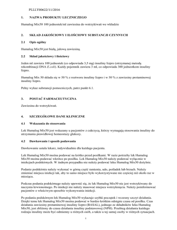 PLLLY00622/11/2016 1. NAZWA PRODUKTU LECZNICZEGO Humalog Mix50 100 jednostek/ml zawiesina do wstrzykiwań we wkładzie 2. SKŁAD JAKOŚCIOWY I ILOŚCIOWY SUBSTANCJI CZYNNYCH 2.1 Opis ogólny Humalog Mix50 jest białą, jałową zawiesiną. 2.2 Skład jakościowy i ilościowy Jeden ml zawiera 100 jednostek (co odpowiada 3,5 mg) insuliny lizpro (otrzymanej metodą rekombinacji DNA E.coli). Każdy pojemnik zawiera 3 ml, co odpowiada 300 jednostkom insuliny lizpro. Humalog Mix 50 składa się w 50 % z roztworu insuliny lizpro i w 50 % z zawiesiny protaminowej insuliny lizpro. Pełny wykaz substancji pomocniczych, patrz punkt 6.1. 3. POSTAĆ FARMACEUTYCZNA Zawiesina do wstrzykiwań. 4. SZCZEGÓŁOWE DANE KLINICZNE 4.1 Wskazania do stosowania Lek Humalog Mix50 jest wskazany u pacjentów z cukrzycą, którzy wymagają stosowania insuliny do utrzymania prawidłowej homeostazy glukozy. 4.2 Dawkowanie i sposób podawania Dawkowanie ustala lekarz, indywidualnie dla każdego pacjenta. Lek Humalog Mix50 można podawać na krótko przed posiłkami. W razie potrzeby lek Humalog Mix50 można podawać wkrótce po posiłku. Lek Humalog Mix50 należy podawać wyłącznie w iniekcjach podskórnych. W żadnym przypadku nie należy podawać leku Humalog Mix50 dożylnie. Podanie podskórnie należy wykonać w górną część ramienia, udo, pośladek lub brzuch. Należy zmieniać miejsca iniekcji tak, aby to samo miejsce było wykorzystywane nie częściej niż około raz w miesiącu. Podczas podania podskórnego należy upewnić się, że lek Humalog Mix50 nie jest wstrzykiwany do naczynia krwionośnego. Po iniekcji nie należy masować miejsca wstrzyknięcia. Należy poinformować pacjentów o właściwym sposobie wykonywania iniekcji. Po podaniu podskórnym lek Humalog Mix50 wykazuje szybki początek i wczesny szczyt działania. Dzięki temu lek Humalog Mix50 można podawać w bardzo krótkim odstępie czasu od posiłku. Czas działania zawiesiny protaminowej insuliny lizpro (BASAL), jednego ze składników leku Humalog Mix50, jest zbliżony do czasu działania insuliny podstawowej (NPH). Przebieg działania każdego rodzaju insuliny może być odmienny u różnych osób, a także u tej samej osoby w różnych sytuacjach. 1 Podobnie jak w przypadku wszystkich innych rodzajów insuliny, czas działania leku Humalog Mix50 zależy od wielkości dawki, miejsca iniekcji, ukrwienia, temperatury i aktywności fizycznej. 4.3 Przeciwwskazania Nadwrażliwość na insulinę lizpro lub na którąkolwiek substancję pomocniczą. Hipoglikemia. 4.4 Specjalne ostrzeżenia i środki ostrożności dotyczące stosowania W żadnym przypadku nie należy podawać leku Humalog Mix50 dożylnie. Zmianę typu lub marki stosowanej u pacjenta insuliny należy przeprowadzać pod ścisłym nadzorem lekarza. Zmiana mocy, marki (producenta), typu (krótkodziałająca, NPH, lente itp.), pochodzenia (insulina zwierzęca, ludzka, analog insuliny ludzkiej) i (lub) metody produkcji (rekombinacja DNA lub insulina pochodzenia zwierzęcego) może spowodować konieczność modyfikacji dawki. Sytuacje, które mogą spowodować zmianę lub osłabienie wczesnych objawów ostrzegawczych hipoglikemii: długotrwała cukrzyca, intensywna insulinoterapia, neuropatia cukrzycowa, przyjmowanie niektórych leków, np. beta-adrenolityków. Niektórzy pacjenci, u których po zmianie insuliny pochodzenia zwierzęcego na insulinę ludzką wystąpiła hipoglikemia, zgłaszali, że wczesne objawy ostrzegawcze hipoglikemii były słabiej wyrażone lub zupełnie inne niż odczuwane w przypadku stosowania poprzedniej insuliny. Niewyrównana hipoglikemia lub hiperglikemia może prowadzić do utraty przytomności, śpiączki lub zgonu. Stosowanie nieodpowiednich dawek lub przerwanie leczenia, zwłaszcza w przypadku cukrzycy insulinozależnej, może prowadzić do hiperglikemii i kwasicy ketonowej – stanów, które potencjalnie mogą być śmiertelne. W przypadku zaburzenia czynności nerek zapotrzebowanie na insulinę może być zmniejszone. W przypadku zaburzenia czynności wątroby, ze względu na ograniczenie zdolności wątroby do glukoneogenezy i osłabienie procesu rozkładu insuliny, zapotrzebowanie na insulinę może być zmniejszone. Jednakże, u pacjentów z przewlekłymi zaburzeniami czynności wątroby wzrost oporności na insulinę może spowodować zwiększenie zapotrzebowania organizmu na insulinę. Zapotrzebowanie na insulinę może być zwiększone podczas choroby lub zaburzeń emocjonalnych. Modyfikacja dawki może być również konieczna w przypadku, gdy pacjenci podejmują bardziej intensywny wysiłek fizyczny lub zmieniają sposób odżywiania. Ćwiczenia wykonywane bezpośrednio po posiłku mogą zwiększyć prawdopodobieństwo hipoglikemii. Podanie insuliny lizpro dzieciom poniżej 12 lat można rozważyć jedynie, gdy spodziewane są większe korzyści niż w przypadku stosowania insuliny krótkodziałającej. Jednoczesne stosowanie produktu Humalog Mix50 z pioglitazonem: Zgłaszano przypadki niewydolności serca w czasie jednoczesnego stosowania insuliny i pioglitazonu, szczególnie u pacjentów z czynnikami ryzyka niewydolności serca. Należy o tym pamiętać przed zastosowaniem leczenia skojarzonego insuliną Humalog Mix50 z pioglitazonem. W przypadku leczenia skojarzonego należy obserwować, czy u pacjentów nie występują objawy przedmiotowe i podmiotowe niewydolności serca, zwiększenie masy ciała i obrzęki. Jeśli wystąpi nasilenie objawów ze strony układu krążenia, należy przerwać stosowanie pioglitazonu. 2 Instrukcja użycia i postępowania Aby uniknąć ewentualnego przeniesienia chorób, każdy wkład może być używany tylko przez jedną osobę, nawet, gdy igła na wstrzykiwaczu została zmieniona. 4.5 Interakcje z innymi produktami leczniczymi i inne rodzaje interakcji Zapotrzebowanie na insulinę może wzrosnąć pod wpływem substancji o działaniu hiperglikemizującym, takich jak doustne środki antykoncepcyjne, ko