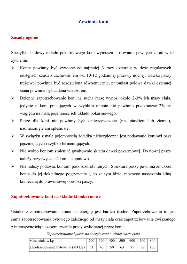 Żywienie koni Zasady ogólne Specyfika budowy układu pokarmowego koni wymusza stosowanie pewnych zasad w ich żywieniu. Konie powinny być żywione co najmniej 3 razy dziennie w dość regularnych odstępach czasu z zachowaniem ok. 10-12 godzinnej przerwy nocnej. Dawka paszy treściwej powinna być rozdzielona równomiernie, natomiast połowa dawki dziennej siana powinna być zadana wieczorem. Dzienne zapotrzebowanie koni na suchą masę wynosi około 2-3% ich masy ciała, jedynie u koni pracujących w szybkim tempie nie powinno przekraczać 2% ze względu na małą pojemność ich układu pokarmowego. Pasze dla koni nie powinny być zanieczyszczone (np. piaskiem lub ziemią), nadmarznięte ani spleśniałe. W związku z małą pojemnością żołądka niebezpieczne jest podawanie koniowi pasz pęczniejących i szybko fermentujących. Nie wolno koniom zmieniać gwałtownie składu dawki pokarmowej. Do nowej paszy należy przyzwyczajać konia stopniowo. Nie należy podawać koniom pasz rozdrobnionych. Struktura paszy powinna zmuszać konia do jej dokładnego pogryzienia i, co za tym idzie, mocnego nasączenia śliną konieczną do prawidłowej obróbki paszy. Zapotrzebowanie koni na składniki pokarmowe Ustalenie zapotrzebowania konia na energię jest bardzo trudne. Zapotrzebowanie to jest sumą zapotrzebowania bytowego zależnego od masy ciała oraz zapotrzebowania związanego z intensywnością i czasem trwania pracy wykonanej przez konia. Zapotrzebowanie bytowe na energię koni o różnej masie ciała Masa ciała w kg 200 300 400 500 600 700 800 Zapotrzebowanie bytowe w (MJ ES) 31 43 50 63 75 88 100 W związku z trudnością w ustaleniu zapotrzebowania na energię w zależności od obciążenia pracą najczęściej przyjmuje się wzrost tego zapotrzebowania w stosunku do potrzeb bytowych: przy pracy lekkiej o 25%, przy pracy średniej o 25-50%, a przy pracy ciężkiej ponad 50%. Koń wykorzystuje następujące źródła energii: skrobię, włókno, tłuszcze oraz w pewnym stopniu białko. Żywienie różnych grup koni Żywienie ogierów Poza sezonem rozpłodowym ogiery żywimy w zależności od masy ciała i rodzaju wykonywanej pracy. W sezonie rozpłodowym obok zwiększonych (o około 15%) potrzeb energetycznych ogiery mają także większe zapotrzebowanie na białko, składniki mineralne i witaminy. Wartość biologiczna podawanego białka ma duży wpływ na jakość nasienia toteż przy intensywnym użytkowaniu rozpłodowym stosuje się dodatek białka zwierzęcego (mleko, jaja kurze). W okresie jesienno zimowym ogiery powinny otrzymywać 2-3 kg marchwi, ok. 0,5 kg kiełków jęczmiennych (witamina E), a w okresie letnim niewielki dodatek zielonki. Żywienie klaczy źrebnych W okresie do 8 miesiąca ciąży dawkę pokarmową układamy w zależności od masy ciała i ilości wykonywanej pracy. Klacze nie mogą być zapasione, jak również nadmiernie wychudzone. Klacze źrebne powinny otrzymywać pasze smaczne, łatwo strawne o działaniu dietetycznym. W ostatnich dniach przed porodem należy ograniczyć o 1/3 ilość dostarczanych składników pokarmowych, szczególnie pasz mlekopędnych, aby nie dopuścić do przedwczesnego uruchomienia produkcji mleka, a tym samym do stanów zapalnych wymienia. Żywienie klaczy karmiących Ich potrzeby pokarmowe są największe w pierwszych trzech miesiącach laktacji. W tym okresie produkcja mleka u klaczy gorącokrwistych i prymitywnych wynosi około 3% masy ciała, a u klaczy zimnokrwistych do 4%. W drugiej połowie laktacji mleczność zmniejsza się do około 2% masy ciała. W szczytowym okresie laktacji klacze gorącokrwiste dają ok. 18-20 I mleka, zimnokrwiste ok. 25 I, a klacze prymitywne ok. 15 I. W okresie letnim dobre pastwisko pokrywa potrzeby białkowe, natomiast energię należy uzupełnić przez podanie pasz treściwych oraz 2-3 kg siana. Żywienie młodzieży Bezpośrednio po urodzeniu jedynym pokarmem źrebaka jest mleko matki. Dokarmianie źrebiąt rozpoczynamy od 4-6 tygodnia wówczas, gdy zaczynają się interesować pokarmem podawanym matkom. Paszę treściwą (owies gnieciony z dodatkiem otrąb pszennych) i siano podajemy do woli. Pod koniec okresu ssania źrebię powinno otrzymywać 3-4 kg pasz treściwych i 2-4 kg siana. Po odsądzeniu w okresie żywienia zimowego źrebięta powinny otrzymywać paszę treściwą o zawartości ok. 12% białka ogólnego strawnego, siano i dodatek marchwi. W okresie letnim odsadki powinny maksymalnie korzystać z pastwiska, które uzupełniamy paszą treściwą w ilości 3- -5 kg oraz niewielkim dodatkiem siana. W żywieniu letnim roczniaków i dwulatków przy dobrym pastwisku dawkę pasz treściwych można ograniczyć do 2-3 kg. W okresie zimowym dzienne dawki pasz treściwych muszą wynosić 4-5 kg a dawki siana 5-7 kg. Szczególnie intensywnego żywienia wymagają młode konie pełnej krwi angielskiej. Żywienie koni użytkowanych wierzchowo Dawki pokarmowe dla tych koni muszą charakteryzować się: dużą zawartością łatwo przyswajalnej energii strawnej, koncentracją składników pokarmowych, (sucha masa dawki nie powinna przekraczać 2% masy ciała), zawartością 6-7 g białka og. str. o dobrej wartości biologicznej na 1 MJ energii strawnej, pokryciem zapotrzebowania na składniki mineralne i witaminy. Zapotrzebowanie na energię zależy od intensywności treningu i startów w gonitwach oraz od indywidualnego wykorzystania paszy. Koniom takim, zależnie od masy ciała i obciążenia pracą, należy dostarczyć 7 do 10 kg paszy treściwej oraz 6-8 kg siana łąkowego. W okresie zimy konie te powinny otrzymywać 2-3 kg marchwi. Żywienie koni roboczych Zapotrzebowanie na paszę dla koni roboczych zależy od masy ciała oraz rodzaju i ilości wykonywanej pracy. Praktyczną oceną prawidłowości żywienia koni roboczych jest ich kondycja. Jeśli koń roboczy nie traci na masie ciała w ciągu miesiąca więcej niż 3% dawkę należy uznać za wystarczającą. Pojenie koni Zapotrzeb