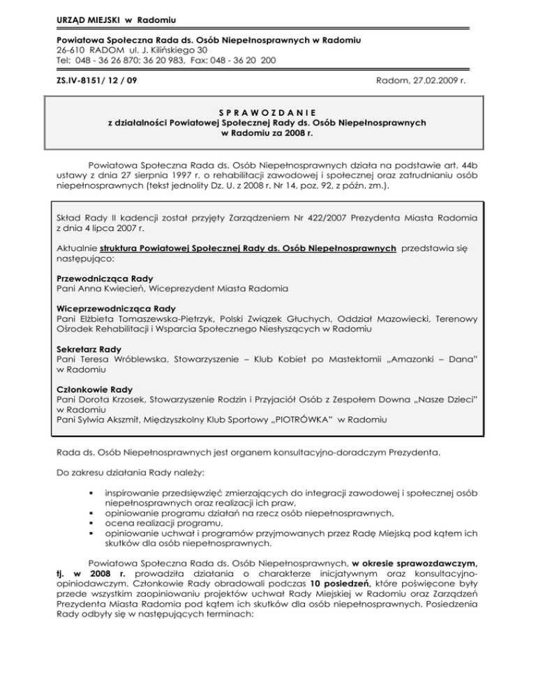 URZĄD MIEJSKI w Radomiu Powiatowa Społeczna Rada ds. Osób Niepełnosprawnych w Radomiu 26-610 RADOM ul. J. Kilińskiego 30 Tel: 048 - 36 26 870; 36 20 983, Fax: 048 - 36 20 200 ZS.IV-8151/ 12 / 09 Radom, 27.02.2009 r. SPRAWOZDANIE z działalności Powiatowej Społecznej Rady ds. Osób Niepełnosprawnych w Radomiu za 2008 r. Powiatowa Społeczna Rada ds. Osób Niepełnosprawnych działa na podstawie art. 44b ustawy z dnia 27 sierpnia 1997 r. o rehabilitacji zawodowej i społecznej oraz zatrudnianiu osób niepełnosprawnych (tekst jednolity Dz. U. z 2008 r. Nr 14, poz. 92, z późn. zm.). Skład Rady II kadencji został przyjęty Zarządzeniem Nr 422/2007 Prezydenta Miasta Radomia z dnia 4 lipca 2007 r. Aktualnie struktura Powiatowej Społecznej Rady ds. Osób Niepełnosprawnych przedstawia się następująco: Przewodnicząca Rady Pani Anna Kwiecień, Wiceprezydent Miasta Radomia Wiceprzewodnicząca Rady Pani Elżbieta Tomaszewska-Pietrzyk, Polski Związek Głuchych, Oddział Mazowiecki, Terenowy Ośrodek Rehabilitacji i Wsparcia Społecznego Niesłyszących w Radomiu Sekretarz Rady Pani Teresa Wróblewska, Stowarzyszenie – Klub Kobiet po Mastektomii „Amazonki – Dana” w Radomiu Członkowie Rady Pani Dorota Krzosek, Stowarzyszenie Rodzin i Przyjaciół Osób z Zespołem Downa „Nasze Dzieci” w Radomiu Pani Sylwia Akszmit, Międzyszkolny Klub Sportowy „PIOTRÓWKA” w Radomiu Rada ds. Osób Niepełnosprawnych jest organem konsultacyjno-doradczym Prezydenta. Do zakresu działania Rady należy: inspirowanie przedsięwzięć zmierzających do integracji zawodowej i społecznej osób niepełnosprawnych oraz realizacji ich praw, opiniowanie programu działań na rzecz osób niepełnosprawnych, ocena realizacji programu, opiniowanie uchwał i programów przyjmowanych przez Radę Miejską pod kątem ich skutków dla osób niepełnosprawnych. Powiatowa Społeczna Rada ds. Osób Niepełnosprawnych, w okresie sprawozdawczym, tj. w 2008 r. prowadziła działania o charakterze inicjatywnym oraz konsultacyjnoopiniodawczym. Członkowie Rady obradowali podczas 10 posiedzeń, które poświęcone były przede wszystkim zaopiniowaniu projektów uchwał Rady Miejskiej w Radomiu oraz Zarządzeń Prezydenta Miasta Radomia pod kątem ich skutków dla osób niepełnosprawnych. Posiedzenia Rady odbyły się w następujących terminach: -2Sprawozdanie z działalności Powiatowej Społecznej Rady ds. Osób Niepełnosprawnych w Radomiu za 2008 r. 23.01.2008 r. 19.02.2008 r. 18 i 28.03.2008 r. 24.06.2008 r. 01 i 09.10.2008 r. 17.11.2008 r. 01 i 18.12.2008 r. W porównaniu z rokiem poprzednim działania Rady, ilość przeprowadzonych posiedzeń w roku 2008 pozostaje na tym samym poziomie. W 2008 roku Rada podjęła 19 uchwał, dot. następujących kwestii: Uchwała Nr 1/2008 z dnia 23.01.2008 r. dot. opinii do projektu uchwały Rady Miejskiej w Radomiu w sprawie podziału zaliczki z Państwowego Funduszu Rehabilitacji Osób Niepełnosprawnych na realizację bieżących zadań przez powiat w 2008 r.; Uchwała Nr 2/2008 z dnia 19.02.2008 r. dot. opinii do projektu uchwały Rady Miejskiej w Radomiu w sprawie podziału środków Państwowego Funduszu Rehabilitacji Osób Niepełnosprawnych na realizację zadań przez powiat w 2008 r.; Uchwała Nr 3/2008 z dnia 19.02.2008 r. dot. opinii do projektu Zarządzenia Prezydenta Miasta Radomia w sprawie ustalenia listy przedmiotów i limitu cen w ramach likwidacji barier w komunikowaniu się, technicznych i w sprzęcie rehabilitacyjnym oraz katalogu zawierającego wykaz urządzeń, materiałów budowlanych, robót lub innych czynności z zakresu likwidacji barier architektonicznych i technicznych; Uchwała Nr 4/2008 z dnia 18.03.2008 r. dot. opinii w zakresie projektu Uchwały Rady Miejskiej w Radomiu w sprawie przyjęcia „Samorządowego Programu Na Rzecz Osób Niepełnosprawnych Miasta Radomia na lata 2008 – 2013”; Uchwała Nr 5/2008 z dnia 18.03.2008 r. dot. opinii do projektu uchwały Rady Miejskiej w Radomiu w sprawie zmiany podziału środków Państwowego Funduszu Rehabilitacji Osób Niepełnosprawnych na realizację zadań przez powiat w 2008 r.; Uchwała Nr 6/2008 z dnia 18.03.2008 r. dot. opinii do Wniosku Gminy Miasta Radomia do programu PFRON pn. „Program wyrównywania różnic między regionami” – Obszar D; Uchwała Nr 7/2008 z dnia 18.03.208 r. dot. opinii do Wniosku Gminy Miasta Radomia do programu PFRON pn. „Program wyrównywania różnic między regionami” – obszar D; Uchwała Nr 8/2008 z dnia 18.03.2008 r. dot. opinii do Wniosku Gminy Miasta Radomia do programu PFRON pn. „Program wyrównywania różnic między regionami” – obszar D; Uchwała Nr 9/2008 z dnia 18.03.2008 r. dot. opinii do projektu uchwały zmieniającej Uchwałę Nr 128/2007 Rady Miejskiej w Radomiu z dnia 11.06.2007 r. w sprawie ustalenia strefy płatnego parkowania (…); Uchwała Nr 10/2008 z dnia 24.06.2008 r. dot. opinii do projektu uchwały Rady Miejskiej w Radomiu w sprawie zmiany podziału środków Państwowego Funduszu Rehabilitacji Osób Niepełnosprawnych na realizację zadań przez powiat w 2008 r.; Uchwała Nr 11/2008 z dnia 01.10.2008 r. dot. opinii do projektu uchwały Rady Miejskiej w Radomiu w sprawie zmiany podziału środków Państwowego Funduszu Rehabilitacji Osób Niepełnosprawnych na realizację zadań przez powiat w 2008 r.; Uchwała Nr 12/2008 z dnia 01.10.2008 r. dot. opinii do projektu uchwały Rady Miejskiej w Radomiu w sprawie określenia przepisów porządkowych związanych z przewozem osób i bagażu środkami komunikacji miejskiej w granicach administracyjnych Gminy Miasta Radomia, sposobu ustalania wysokości opłat dodatkowych z tytułu przewozu -3Sprawozdanie z działalności Powiatowej Społecznej Rady ds. Osób Niepełnosprawnych w Radomiu za 2008 r. osób, zabranych ze sobą do przewozu rzeczy i zwierząt oraz wysokości opłaty manipulacyjnej; Uchwała Nr 13/2008 z dnia 09.10.2008 r. dot. opinii do projektu uchwały Rady 