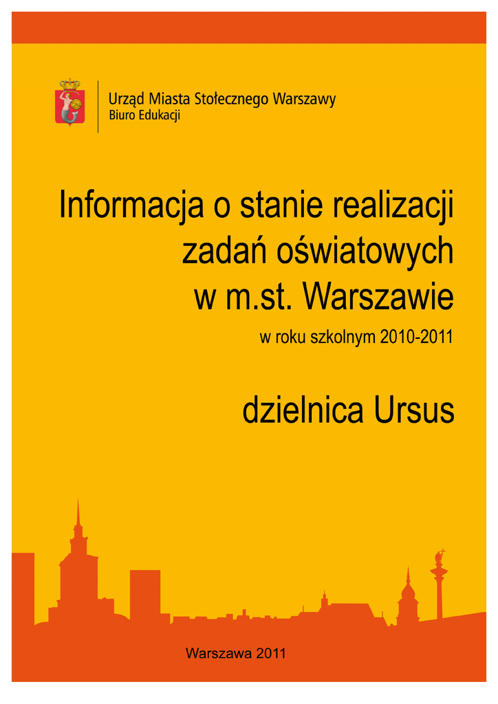 Informacja o stanie realizacji zadań oświatowych w dzielnicy Ursus m. st. Warszawy w roku szkolnym 2010/2011 Spis treści 1. Wprowadzenie ................................................................................................................................. 7 2. Jednostki systemu oświaty nadzorowane przez dzielnicę – podsumowanie .................................. 8 1. Informacje ogólne, specyfika jednostek ....................................................................................... 8 a. Przedszkola i inne formy wychowania przedszkolnego ........................................................... 8 b. Szkoły podstawowe .................................................................................................................. 9 c. Gimnazja................................................................................................................................. 10 d. Licea ogólnokształcące .......................................................................................................... 12 e. Szkoły zawodowe ................................................................................................................... 12 f. Pozostałe jednostki (w tym placówki wychowania pozaszkolnego i poradnie psychologicznopedagogiczne) ............................................................................................................................ 13 2. Własne programy nauczania, innowacje i eksperymenty pedagogiczne .................................. 13 a. Przedszkola i inne formy wychowania przedszkolnego ......................................................... 13 b. Szkoły podstawowe ................................................................................................................ 17 c. Gimnazja................................................................................................................................. 19 d. Licea ogólnokształcące .......................................................................................................... 21 e. Szkoły zawodowe ................................................................................................................... 21 f. Pozostałe jednostki (w tym placówki wychowania pozaszkolnego i poradnie psychologicznopedagogiczne) ............................................................................................................................ 21 3. Zajęcia dodatkowe ..................................................................................................................... 22 a. Przedszkola i inne formy wychowania przedszkolnego ......................................................... 22 b. Szkoły podstawowe ................................................................................................................ 24 c. Gimnazja................................................................................................................................. 27 d. Licea ogólnokształcące .......................................................................................................... 30 e. Szkoły zawodowe ................................................................................................................... 31 f. Pozostałe jednostki (w tym placówki wychowania pozaszkolnego i poradnie psychologicznopedagogiczne) ............................................................................................................................ 31 4. Osiągnięcia ................................................................................................................................ 32 a. Przedszkola i inne formy wychowania przedszkolnego ......................................................... 32 b. Szkoły podstawowe ................................................................................................................ 35 c. Gimnazja................................................................................................................................. 38 d. Licea ogólnokształcące .......................................................................................................... 42 e. Szkoły zawodowe ................................................................................................................... 44 f. Pozostałe jednostki (w tym placówki wychowania pozaszkolnego i poradnie psychologicznopedagogiczne) ............................................................................................................................ 44 5. Projekty unijne, współpraca międzynarodowa ........................................................................... 45 a. Przedszkola i inne formy wychowania przedszkolnego ......................................................... 45 b. Szkoły podstawowe ................................................................................................................ 45 c. Gimnazja................................................................................................................................. 45 d. Licea ogólnokształcące .......................................................................................................... 45 e. Szkoły zawodowe ................................................................................................................... 45 3/74 Informacja o stanie realizacji zadań oświatowych w dzielnicy Ursus m. st. Warszawy w roku szkolnym 2010/2011 f. Pozostałe jednostki (w tym placówki wychowania pozaszkolnego i poradnie psychologicznopedagogiczne) ............................................................................................................................ 46 6. Zasiłki szkolne, stypendia socjalne ............................................................................................ 46 a. Przedszkola i inne formy wychowania przedszkolnego.......................................................... 46 b. Szkoły podstawowe ........................