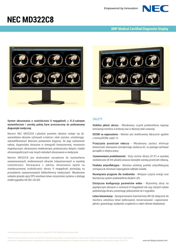 NEC MD322C8 8MP Medical Certified Diagnostic Display System obrazowania o rozdzielczości 8 megapikseli, z 31,5-calowym wyświetlaczem i szeroką paletą barw przeznaczony do podstawowej diagnostyki medycznej Monitor NEC MD322C8 z płaskim panelem idealnie nadaje się do wyświetlania obrazów cyfrowych w kolorze i skali szarości, umożliwiając wykwalifikowanym lekarzom postawienie diagnozy. Do jego zastosowań należą: diagnostyka obrazowa w tomografii komputerowej, rezonansie magnetycznym, obrazowaniu molekularnym, przetwarzaniu danych z badań ultrasonograficznych oraz innych metodach obrazowania w medycynie. Monitor MD322C8 jest doskonałym narzędziem do wyświetlania zaawansowanych, renderowanych obrazów trójwymiarowych w wysokiej rozdzielczości. Rozwiązania z zakresu obrazowania oparte na standaryzowanej rozdzielczości obrazu 8 megapikseli pozwalają na prowadzenie zaawansowanych telekonferencji medycznych. Wbudowane unikalne gniazdo opcji OPS umożliwia łatwe rozszerzenie systemu o obsługę źródeł sygnałów HD-SDI i 3G-SDI. ZALETY Stabilna jakość obrazu - Wbudowany czujnik podświetlenia reguluje luminancję monitora w krótszej oraz w dłuższej skali czasowej. DICOM na wyposażeniu - Monitor jest skalibrowany fabrycznie zgodnie z normą DICOM, część 14. Przejrzysta przestrzeń robocza - Wbudowany zasilacz eliminuje konieczność stosowania zewnętrznego zasilacza AC, co pomaga zachować porządek w miejscu pracy. Zaawansowana produktywność - Duży rozmiar obrazu (31,5") w wysokiej rozdzielczości (8 mln pikseli) oznacza niezwykle szeroką przestrzeń roboczą. Powłoka antyrefleksyjna - Warstwa unikalnej powłoki antyrefleksyjnej zmniejsza do minimum nieprzyjemne odblaski światła. Rozwiązania przyjazne dla środowiska - Mniejsze zużycie energii oraz bezrtęciowy system podświetlenia diodami LED. Elastyczna konfiguracja parametrów wideo - Wyświetlaj obraz na pojedynczym obszarze o rozmiarze 8 megapikseli lub użyj różnych trybów podzielonego ekranu, prezentując jednocześnie do 4 sygnałów. Łatwa konserwacja - Oprogramowanie GammaComp MD QA dołączone do monitora umożliwia łatwe kalibrowanie, konserwowanie i zapewnianie jakości, gwarantując wydajność urządzenia w całym okresie eksploatacji. Prawa autorskie do niniejszego dokumentu są przy © copyright 2015 NEC Display Solutions Europe GmbH. Wszelkie prawa zastrzeżone na rzecz ich właścicieli. Wszystkie nazwy sprzętu i oprogramowania to nazwy własne marek i/lub zastrzeżonych znaków towarowych odpowiednich producentów. Wszystkie specyfikacje mogą podlegać zmianom bez uprzedniego powiadamiania. Zastrzega się możliwość wystąpienia błędów i niekompletności danych. 06.07.2015 www.nec-display-solutions.com NEC MD322C8 - Dane techniczne Rodzaj panelu TFT IPS z podświetleniem W-LED Wielkość ekranu [cale/cm] 31.5 / 80.1 Proporcje obrazu 16:9 Rozmiar plamki [mm] 0.182 x 0.182 Luminancja [cd/m²] 200 (po kalibracji); 350 (max) Kontrast 1000:1 Kąty widzenia [°] 176 poziomo / 176 pionowo (CR 10:1) Czas reakcji [ms] 24 (tr - tf) Reprodukcja barw 10-bitowa (1021 odcieni szarości na wejście R G B) z maks. 1,06 mld barw Programowalna korekcja gamma 14-bitowa Fabryczna kalibracja 200 cd/m² dla poziomu bieli; Korekcja gamma zgodnie z normą DICOM, część 14 Częstotliwość pozioma [kHz] 31.5 - 133.2 Częstotliwość pionowa [Hz] 24 - 120 Rozdzielczość optymalna 3840 x 2160 przy 60 Hz Obsługiwane rozdzielczości 3840 x 2160 (24/25/30/60 Hz); 1920 x 1080 (24/25/30/50/60/75/85/100/120 Hz) MOŻLIWOŚCI PODŁĄCZANIA Cyfrowe 2 x DisplayPort; 2x DVI-D (Dual Link); 4 x HDMI PARAMETRY ELEKTRYCZNE Pobór mocy [W] 95 (wysyłka) Tryb Power Save [W] <5 Zasilanie 1.51 A/0.6 A; 100-120 V/220-240 V; internal power supply Temperatura otoczenia podczes pracy [°C] +5 do +35 Wilgotność otoczenia podczas pracy [%] 30 do 80 Regulacja wysokości[mm] 150 Pochylenie ekranu w pionie [°] -5 to 30 Obrót ekranu w poziomie [°] -45 to +45 Wymiary [mm] 744.8 x 468.4 x 301.6 Waga [kg] 20.5 Mocowanie VESA [mm] 100 x 100; 200 x 100 Cechy Specjalne 14-bitowa korekcja gamma; Czujnik podświetlenia; Digital Uniformity Control - Wyrównywanie jednorodności podświetlenia ekranu; Szybki test DICOM; Test DICOM; Wbudowany czujnik natężenia oświetlenia w otoczeniu Złącze Kensington tak Plug and Play VESA DDC2B Zawartość opakowania Continental and UK power cord; Skrócona instrukcja obsługi Kabel sygnałowy: 1 x DVI-D; 2 x DisplayPort; USB Bezpieczeństwo i ergonomia AAPM-TG18; CCC; CE-MDD (EN60601-1, EN60601-1-2); DIN V 6868-57 / DIN 6868-157 (for Fluoroscopy and CT); EAC; FDA510 (k); JESRAX0093; RoHS; WEEE Gwarancja 3 lata (w tym na podświetlenie ekranu); opcjonalne przedłużenie gwarancji na 4. i 5. rok Różne karty sterownika monitora AMD; Nvidia Oprogramowanie GammaCompMD QA Opcje Przyrząd kalibracyjny (MDSVSENSOR3) WYŚWIETLACZ CZĘSTOTLIWOŚĆ SYNCHRONIZACJI ROZDZIELCZOŚĆ WARUNKI OTOCZENIA ERGONOMIA PARAMETRY MECHANICZNE DODATKOWE FUNKCJE KONFIGURACJE SYSTEMU Rejestracja wyrobu medycznego ma istotne znaczenie dla zachowania zgodności z obowiązkowymi przepisami UE dotyczącymi systemu monitorowania bezpieczeństwa medycznego. Ponadto rejestracja produktu gwarantuje uzyskanie najlepszego wsparcia posprzedażnego oraz najkorzystniejszych warunków gwarancji. Prosimy o rejestrację wyrobu medycznego firmy NEC na stronie http://medical.nec-display-solutions.com/medregistration Deklaracja CE-MDD jest zgodna z dyrektywą europejską nr 93/42/EWG (dyrektywa o wyrobach medycznych). Systemy monitorów NEC serii MD są zarejestrowane jako wyroby medyczne w DIMDI oraz pomyślnie przeszły wstępną kwalifikację pod kątem badań dopuszczających na mocy niemieckiego rozporządzenia dotyczącego promieniowania rentgenowskiego zgodnie z normą DIN 6868-157.