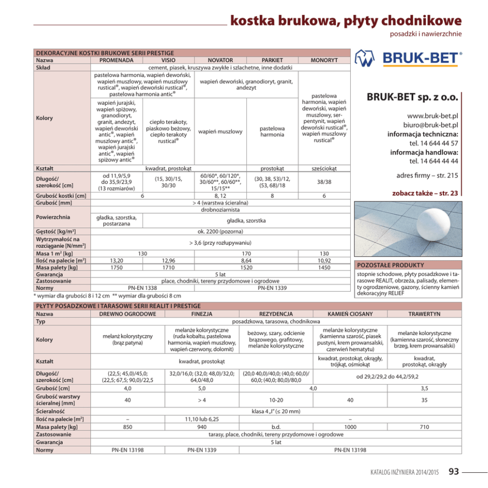 kostka brukowa, płyty chodnikowe posadzki i nawierzchnie DEKORACYJNE KOSTKI BRUKOWE SERII PRESTIGE Nazwa Skład Kolory Kształt Długość/ szerokość [cm] Grubość kostki [cm] Grubość [mm] Powierzchnia PROMENADA VISIO NOVATOR PARKIET cement, piasek, kruszywa zwykłe i szlachetne, inne dodatki pastelowa harmonia, wapień dewoński, wapień muszlowy, wapień muszlowy wapień dewoński, granodioryt, granit, rustical®, wapień dewoński rustical®, andezyt pastelowa harmonia antic® wapień jurajski, wapień spiżowy, granodioryt, ciepło terakoty, granit, andezyt, wapień dewoński piaskowo beżowy, pastelowa wapień muszlowy ciepło terakoty antic®, wapień harmonia muszlowy antic®, rustical® wapień jurajski antic®, wapień spiżowy antic® kwadrat, prostokąt prostokąt od 11,9/5,9 60/60*, 60/120*, (15, 30)/15, (30, 38, 53)/12, do 35,9/23,9 30/60**, 60/60**, 30/30 (53, 68)/18 (13 rozmiarów) 15/15** 6 8, 12 8 > 4 (warstwa ścieralna) drobnoziarnista gładka, szorstka, gładka, szorstka postarzana ok. 2200 (pozorna) MONORYT BRUK-BET sp. z o.o. pastelowa harmonia, wapień dewoński, wapień muszlowy, serpentynit, wapień dewoński rustical®, wapień muszlowy rustical® www.bruk-bet.pl [email protected] informacja techniczna: tel. 14 644 44 57 informacja handlowa: tel. 14 644 44 44 sześciokąt adres firmy – str. 215 38/38 zobacz także – str. 23 6 Gęstość [kg/m3] Wytrzymałość na > 3,6 (przy rozłupywaniu) rozciąganie [N/mm2] 130 170 Masa 1 m2 [kg] Ilość na palecie [m2] 13,20 12,96 8,64 Masa palety [kg] 1750 1710 1520 Gwarancja 5 lat Zastosowanie place, chodniki, tereny przydomowe i ogrodowe Normy PN-EN 1338 PN-EN 1339 * wymiar dla grubości 8 i 12 cm ** wymiar dla grubości 8 cm 130 10,92 1450 POZOSTAŁE PRODUKTY stopnie schodowe, płyty posadzkowe i tarasowe REALIT, obrzeża, palisady, elementy ogrodzeniowe, gazony, ścienny kamień dekoracyjny RELIEF PŁYTY POSADZKOWE I TARASOWE SERII REALIT I PRESTIGE Nazwa Typ Kolory DREWNO OGRODOWE FINEZJA melanż kolorystyczny (brąz patyna) melanże kolorystyczne (ruda kobaltu, pastelowa harmonia, wapień muszlowy, wapień czerwony, dolomit) Kształt Długość/ szerokość [cm] Grubość [cm] Grubość warstwy ścieralnej [mm] Ścieralność Ilość na palecie [m2] Masa palety [kg] Zastosowanie Gwarancja Normy REZYDENCJA posadzkowa, tarasowa, chodnikowa beżowy, szary, odcienie brązowego, grafitowy, melanże kolorystyczne kwadrat, prostokąt (22,5; 45,0)/45,0; (22,5; 67,5; 90,0)/22,5 4,0 32,0/16,0; (32,0; 48,0)/32,0; 64,0/48,0 5,0 40 >4 KAMIEŃ CIOSANY TRAWERTYN melanże kolorystyczne (kamienna szarość, piasek pustyni, krem prowansalski, czerwień hematytu) melanże kolorystyczne (kamienna szarość, słoneczny brzeg, krem prowansalski) kwadrat, prostokąt, okrągły, trójkąt, ośmiokąt kwadrat, prostokąt, okrągły (20,0 40,0)/40,0; (40,0; 60,0)/ 60,0; (40,0; 80,0)/80,0 od 29,2/29,2 do 44,2/59,2 4,0 10-20 3,5 40 35 klasa 4 „I” (≤ 20 mm) – 850 PN-EN 13198 11,10 lub 6,25 – 940 b.d. 1000 tarasy, place, chodniki, tereny przydomowe i ogrodowe 5 lat PN-EN 1339 PN-EN 13198 710 Katalog Inżyniera 2014/2015 93