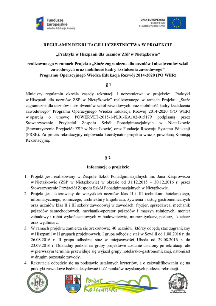 REGULAMIN REKRUTACJI I UCZESTNICTWA W PROJEKCIE „Praktyki w Hiszpanii dla uczniów ZSP w Nietążkowie” realizowanego w ramach Projektu „Staże zagraniczne dla uczniów i absolwentów szkół zawodowych oraz mobilność kadry kształcenia zawodowego” Programu Operacyjnego Wiedza Edukacja Rozwój 2014-2020 (PO WER) §1 Niniejszy regulamin określa zasady rekrutacji i uczestnictwa w projekcie: „Praktyki w Hiszpanii dla uczniów ZSP w Nietążkowie” realizowanego w ramach Projektu „Staże zagraniczne dla uczniów i absolwentów szkół zawodowych oraz mobilność kadry kształcenia zawodowego” Programu Operacyjnego Wiedza Edukacja Rozwój 2014-2020 (PO WER) w oparciu o umowę POWERVET-2015-1-PL01-KA102-015179 podpisaną przez Stowarzyszenie Przyjaciół Zespołu Szkół Ponadgimnazjalnych w Nietążkowie (Stowarzyszenie Przyjaciół ZSP w Nietążkowie) oraz Fundację Rozwoju Systemu Edukacji (FRSE). Za proces rekrutacyjny odpowiada koordynator projektu wraz z powołaną Komisją Rekrutacyjną. §2 Informacje o projekcie 1. Projekt jest realizowany w Zespole Szkół Ponadgimnazjalnych im. Jana Kasprowicza w Nietążkowie (ZSP w Nietążkowie) w okresie od 31.12.2015 – 30.12.2016 r. przez Stowarzyszenie Przyjaciół Zespołu Szkół Ponadgimnazjalnych w Nietążkowie. 2. Projekt jest skierowany do wszystkich uczniów klas II i III technikum hotelarskiego, informatycznego, rolniczego, architektury krajobrazu, żywienia i usług gastronomicznych oraz uczniów klas II i III szkoły zawodowej w zawodach: fryzjer, sprzedawca, mechanik pojazdów samochodowych, mechanik-operator pojazdów i maszyn rolniczych, monter zabudowy i robót wykończeniowych w budownictwie, murarz-tynkarz, piekarz, kucharz oraz wędliniarz. 3. W ramach projektu zamierza się zrekrutować 40 uczniów, którzy odbędą staż zagraniczny w Hiszpanii w II grupach projektowych. I grupa odbędzie staż w Sewilli od 1.08.2016 r. do 26.08.2016 r. II grupa odbędzie staż w miejscowości Ubeda od 29.08.2016 r. do 23.09.2016 r. Dokładny podział na grupy projektowe zostanie ustalony po rekrutacji, ale w pierwszym terminie przewiduje się wyjazd grupy hotelarsko-gastronomicznej, natomiast w drugim pozostałe zawody. 4. Rekrutacja odbędzie się na podstawie ustalonych kryteriów, a o zakwalifikowaniu się na praktyki zawodowe będzie decydować ilość punktów uzyskanych podczas rekrutacji. 5. Udział w projekcie jest dla uczestników bezpłatny – mają oni zapewnione wyżywienie, nocleg, dojazd na i z praktyk, podróż do oraz z Hiszpanii. Jedynym wydatkiem jest kieszonkowe wydawane na własne potrzeby. §3 Zasady rekrutacji uczestników projektu 1. 2. 3. 4. Rekrutacja prowadzona będzie przez Komisję Rekrutacyjną w Zespole Szkół Ponadgimnazjalnych im. Jana Kasprowicza w Nietążkowie w składzie: Arleta Adamczak-Puk- dyrektor ZSP w Nietążkowie Edyta Baranowska – koordynator projektu, członek Stowarzyszenia Przyjaciół ZSP w Nietążkowie, nauczyciel języka angielskiego i hiszpańskiego w ZSP w Nietążkowie Małgorzata Dąbrowska – skarbnik Stowarzyszenia ZSP w Nietążkowie, nauczyciel chemii w ZSP w Nietążkowie Joanna Kozak – nauczyciel przedmiotów zawodowych w ZSP w Nietążkowie Terminy składania dokumentów rekrutacyjnych przez wszystkich zainteresowanych uczniów: od 25.01.2016 r. do 11.02.2016 r. Aby wziąć udział w rekrutacji zainteresowany uczeń składa w sekretariacie szkoły komplet wypełnionych dokumentów, które stanowią załączniki do niniejszego regulaminu i będą dostępne na stronie internetowej stowarzyszenia, szkoły oraz w sekretariacie: Kwestionariusz zgłoszeniowy (Załącznik 1) Zgoda- oświadczenie rodziców lub prawnych opiekunów (Załącznik 2) Podczas rekrutacji obowiązują następujące kryteria wg ważności: a) technikum- średnia ocen ucznia z przedmiotów zawodowych w I semestrze roku szkolnego 2015/2016 większa niż 3,00 (średnia większa niż 3,00 – 1 pkt, 4,00 – 2 pkt, 5,00 – 3 pkt, 6,00 – 4 pkt) b) szkoła zawodowa- ocena z ostatniego okresu praktyk zawodowych większa niż dostateczna (dostateczna – 1 pkt, dobra – 2 pkt, bardzo dobra – 3 pkt, celująca – 4 pkt) c) ocena z zachowania nie gorsza niż dobra (dobra – 1 pkt, bardzo dobra – 2 pkt, wzorowa – 3 pkt) d) ocena z języka obcego (dopuszczająca – 0 pkt, dostateczna – 1 pkt, dobra – 2 pkt, bardzo dobra – 3 pkt, celująca – 4 pkt) e) wysokość dochodów netto na członka rodziny (poniżej 500 zł netto – 3 pkt, od 500 zł netto do 1000 zł netto – 2 pkt, od 1000 zł netto do 1500 zł netto – 1 pkt, powyżej 1500 zł – 0 pkt Maksymalna ilość punktów do zdobycia to 14 punktów. W przypadku uzyskania przez uczniów równej punktacji kryteria rozstrzygające to niższy dochód, dalej wyższa średnia 5. 6. 7. 8. ocen z przedmiotów zawodowych, a w dalszej kolejności ocena z języka obcego oraz z zachowania. Zostanie także utworzona lista rezerwowa uczniów. Posiedzenia Komisji Rekrutacyjnej będą protokołowane i podpisane przez wszystkich członków Komisji Rekrutacyjnej. Ilość zdobytych przez kandydatów punktów, ostateczna lista zakwalifikowanych kandydatów oraz lista rezerwowa uczniów zostaną opublikowane na stronie szkoły oraz na tablicy ogłoszeń w budynkach szkoły. W przypadku rezygnacji lub wykluczenia ucznia z listy zakwalifikowanych do projektu na jego miejsce wchodzi uczeń znajdujący się na pozycji pierwszej listy rezerwowej. W kwestiach spornych uczeń może się odwołać na piśmie do Komisji Rekrutacyjnej w ciągu 5 dni od daty opublikowania listy kandydatów. W kwestiach spornych decydujący głos ma koordynator projektu. §4 Prawa i obowiązki uczestnika projektu 1. 2. Uczestnik projektu ma prawo do: a) rzetelnej informacji na temat projektu b) bezpłatnego udziału w zajęciach przygotowawczych oraz udziału w praktykach zagranicznych c) korzystania ze wszystkich form wsparcia oferowanych w ramach projektu d) otrzymani
