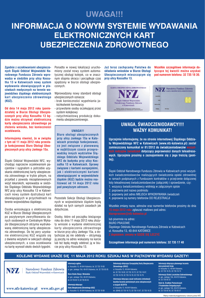 INFORMACJA O NOWYM SYSTEMIE WYDAWANIA ELEKTRONICZNYCH KART UBEZPIECZENIA ZDROWOTNEGO Zgodnie z oczekiwaniami ubezpieczonych Śląski Oddział Wojewódzki Naro do we go Fun du szu Zdro wia wpro wadza w siedzibie przy ulicy Kossutha 13 w Ka to wi cach no wy sy stem wy da wa nia obo wią zu ją cych w pla cówkach medycznych na terenie województwa śląskiego elektronicznych kar t ubez pie cze nia zdro wot ne go (KUZ). Od dnia 14 maja 2012 roku (poniedzia łek) w Biu rze Ob słu gi Ubez pie czonych przy ulicy Kossutha 13 będzie moż na otrzy mać elek tro nicz ną kar tę ubezpieczenia zdrowotnego po złożeniu wniosku, bez konieczności oczekiwania. Informujemy również, że w związku z tym od 11 maja 2012 roku przestaje funkcjonować Biuro Obsługi Ubezpieczonych przy ulicy Jankego 15a. Ślą ski Od dział Wo je wódz ki NFZ, wy chodząc naprzeciw oczekiwaniom pacjentów i sygnałom o potrzebie uzyskania elektronicznej kar ty ubezpieczenia zdrowotnego w trybie pilnym, na przykład z powodu niezaplanowanych wizyt lekarskich, wprowadza w siedzibie Śląskiego Oddziału Wojewódzkiego NFZ przy ulicy Kossutha 13 w Katowicach no wy sy stem dy stry bu cji kar t obowiązujących w przychodniach na terenie województwa śląskiego. Oso ba wnio sku ją ca o elek tro nicz ną KUZ w Biurze Obsługi Ubezpieczonych po po zy tyw nym zwe ry fi ko wa niu da nych osobowych w Centralnym Wykazie Ubezpieczonych otrzyma wydrukowaną elektroniczną kar tę ubezpieczenia zdrowotnego. Do tej pory uzyskanie elek tro nicz nej KUZ wią za ło się z dwiema wizytami w sekcjach obsługi ubezpieczonych, a czas oczekiwania na kar tę wynosił około dwóch tygodni. Po nad to w no wej lo ka li za cji uru cho mio ny zo stał no wy sy stem au to ma tycznej obsługi kolejek, co w znacznym stopniu skraca i porządkuje czas spę dzo ny w biu rze ob słu gi ubez pie czonych. Już te raz za chę ca my Pań stwa do składania wniosków w Biurze Obsługi Ubez pie czo nych miesz czą cym się przy ulicy Kossutha 13. Wszelkie szczegółowe informacje doty czą ce tej kwe stii moż na uzy skać pod numerem telefonu: 32 735 18 30. Wprowadzony nowy standard obsługi ubezpieczonych oznacza: - brak ko niecz no ści wy peł nia nia ja kichkolwiek formularzy - przywołanie osoby oczekującej przez system kolejkowy - na tych mia sto wą pro duk cję do ku mentu ubezpieczeniowego. UWAGA!!! Biu ro ob słu gi ubez pie czo nych przy ulicy Jankego 15a w Katowicach przestaje funkcjonować, co jest zwią za ne z pla no wa ną w naj bliż szym cza sie prze pro wadz ką in nych wy dzia łów Ślą skiego Oddziału Wojewódzkiego NFZ do budynku przy ulicy Kossutha 13 w Katowicach. Sprawy związane z kartami europejskimi, jak i elek tro nicz ny mi kar ta mi obowiązującymi w województwie śląskim (KUZ) będzie można reali zo wać od 14 ma ja 2012 ro ku pod powyższym adresem. Pozostałe Sekcje Obsługi Ubezpieczonych w wo je wódz twie ślą skim bę dą działać na tych samych zasadach jak dotychczas. Oso by, któ re od po cząt ku bie żą ce go roku do dnia 11 maja 2012 roku złożyły wnio ski o wy da nie elek tro nicz nej kar ty ubez pie cze nia zdro wot ne go w biurze przy ulicy Jankego 15a, a dotychczas jej nie odebrały – otrzymają ją pocztą na adres wskazany na karcie lub też będą mogły odebrać ją w biurze przy ulicy Kossutha 13. UWAGA, ŚWIADCZENIODAWCY!!!! WAŻNY KOMUNIKAT! Uprzejmie informujemy, że na stronie internetowej Śląskiego Oddziału Wojewódzkiego NFZ w Katowicach (www.nfz-katowice.pl) został zamieszczony komunikat nr 81/2012 do świadczeniodawców wszystkich rodzajów świadczeń dotyczący poprawności danych teleadresowych. Uprzejmie prosimy o zaznajomienie się z jego treścią (poniżej). Śląski Oddział Narodowego Funduszu Zdrowia w Katowicach prosi wszystkich świadczeniodawców realizujących świadczenia opieki zdrowotnej w ramach podpisanych z Funduszem kontraktów o przejrzenie dołączonej listy teleadresowej świadczeniodawców (załącznik) i sprawdzenie, czy: 1. wszyscy świadczeniodawcy widnieją w załączonym spisie 2. poprawna jest nazwa podmiotu 3. poprawny jest adres MIEJSCA WYKONYWANIA świadczeń 4. poprawne są numery telefonów DO REJESTRACJI Wszelkie zmiany nazw, adresów oraz numerów telefonów prosimy do dnia 15 maja 2012 roku zgłaszać mailowo pod adres: [email protected] lub pisemnie na adres: BIURO PRASOWE Śląskiego Oddziału Narodowego Funduszu Zdrowia w Katowicach ul. Kossutha 13, 40-844 KATOWICE Z dopiskiem: zmiany w GDZIE SIĘ LECZYĆ Szczegółowe informacje pod numerem telefonu: 32 735 17 40 KOLEJNE WYDANIE UKAŻE SIĘ 11 MAJA 2012 ROKU. SZUKAJ NAS W PIĄTKOWYM WYDANIU GAZETY! Informacja ogólna ul. Kossutha 13, 40-844 Katowice, tel. 32 735 19 00 ul. gen. Jankego 15A, 40-615 Katowice, tel. 32 735 05 05 Biuro Działu Skarg i Wniosków ul. gen. Jankego 15A, 40-615 Katowice, tel. 32 735 05 13; 32 735 05 45 www.nfz-katowice.pl www.nfz.gov.pl Informacja dotycząca Karty Ubezpieczenia Zdrowotnego (KUZ) ul. Kossutha 13, 40-844 Katowice, tel. 32 735 18 00 IInformacja dotycząca Europejskiej Karty Ubezpieczenia Zdrowotnego (EKUZ) ul. Kossutha 13, 40-844 Katowice; tel. 32 735 18 82; 32 735 18 72; 32 735 18 87; 32 735 18 78; 32 735 16 78; 32 735 16 79 Informacja dotycząca zasad rozliczania (refundacji) kosztów leczenia poniesionych przez ubezpieczonych w krajach UE/EFTA ul. Kossutha 13, 40-844 Katowice, tel. (0048) 32 735 16 73, 32 735 15 67, 32 735 16 25 Informacja dotycząca planowego leczenia poza granicami kraju ul. Kossutha 13, 40-844 Katowice, tel. 32 735 16 25, 32 735 16 73 Informacja Działu Lecznictwa Uzdrowiskowego ul. gen. Jankego 15A, 40-615 Katowice, tel. 32 735 05 22 Dział ds. Środków Pomocniczych i Przedmiotów Ortopedycznych ul. gen. Jankego 15A, 40-615 Katowice, tel. 32 735 05 56, 32 735 05 57 Płatny materiał przygotowany i zlecony przez NFZ