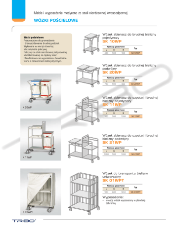 Meble i wyposażenie medyczne ze stali nierdzewnej kwasoodpornej wózki pościelowe Wózki pościelowe Przeznaczone do gromadzenia i transportowania brudnej pościeli. Wykonane w wersji otwartej lub zamykane pokrywą. Pokrywy ze stali nierdzewnej satynowanej lub lakierowanej na żądany kolor. Standardowo na wyposażeniu bawełniane worki z oznaczeniem kolorystycznym. Wózek zbieracz do brudnej bielizny pojedynczy SK 10WP Wymiary gabarytowe L B H 400 500 950 Typ SK 10WP Wózek zbieracz do brudnej bielizny podwójny SK 20WP Wymiary gabarytowe L B H 700 500 950 Typ SK 20WP Wózek zbieracz do czystej i brudnej bielizny pojedynczy K 20WP SK 11WP Wymiary gabarytowe L B H 900 500 1300 Typ SK 11WP Wózek zbieracz do czystej i brudnej bielizny podwójny SK 21WP Wymiary gabarytowe L B H 1300 500 1300 Typ SK 21WP K 11WP Wózek do transportu bielizny uniwersalny SK 01WPT Wymiary gabarytowe L B H 900 600 1650 Wyposażenie: Typ SK 01WPT – w opcji wózek wyposażony w plandekę ochronną K 01WPT