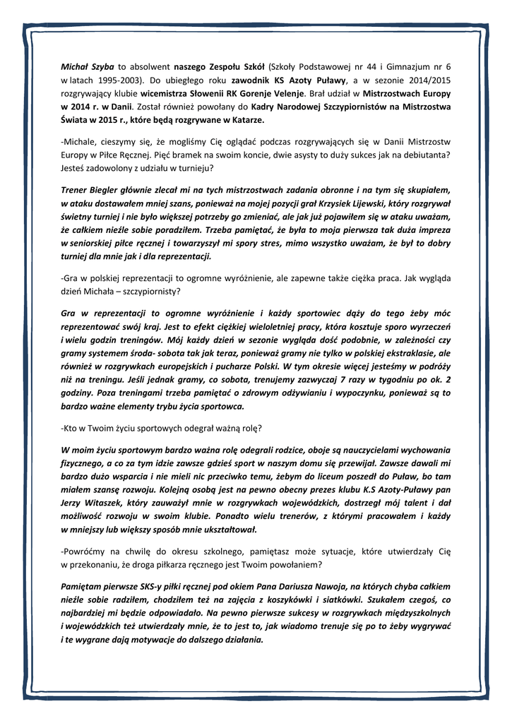 Michał Szyba to absolwent naszego Zespołu Szkół (Szkoły Podstawowej nr 44 i Gimnazjum nr 6 w latach 1995-2003). Do ubiegłego roku zawodnik KS Azoty Puławy, a w sezonie 2014/2015 rozgrywający klubie wicemistrza Słowenii RK Gorenje Velenje. Brał udział w Mistrzostwach Europy w 2014 r. w Danii. Został również powołany do Kadry Narodowej Szczypiornistów na Mistrzostwa Świata w 2015 r., które będą rozgrywane w Katarze. -Michale, cieszymy się, że mogliśmy Cię oglądać podczas rozgrywających się w Danii Mistrzostw Europy w Piłce Ręcznej. Pięć bramek na swoim koncie, dwie asysty to duży sukces jak na debiutanta? Jesteś zadowolony z udziału w turnieju? Trener Biegler głównie zlecał mi na tych mistrzostwach zadania obronne i na tym się skupiałem, w ataku dostawałem mniej szans, ponieważ na mojej pozycji grał Krzysiek Lijewski, który rozgrywał świetny turniej i nie było większej potrzeby go zmieniać, ale jak już pojawiłem się w ataku uważam, że całkiem nieźle sobie poradziłem. Trzeba pamiętać, że była to moja pierwsza tak duża impreza w seniorskiej piłce ręcznej i towarzyszył mi spory stres, mimo wszystko uważam, że był to dobry turniej dla mnie jak i dla reprezentacji. -Gra w polskiej reprezentacji to ogromne wyróżnienie, ale zapewne także ciężka praca. Jak wygląda dzień Michała – szczypiornisty? Gra w reprezentacji to ogromne wyróżnienie i każdy sportowiec dąży do tego żeby móc reprezentować swój kraj. Jest to efekt ciężkiej wieloletniej pracy, która kosztuje sporo wyrzeczeń i wielu godzin treningów. Mój każdy dzień w sezonie wygląda dość podobnie, w zależności czy gramy systemem środa- sobota tak jak teraz, ponieważ gramy nie tylko w polskiej ekstraklasie, ale również w rozgrywkach europejskich i pucharze Polski. W tym okresie więcej jesteśmy w podróży niż na treningu. Jeśli jednak gramy, co sobota, trenujemy zazwyczaj 7 razy w tygodniu po ok. 2 godziny. Poza treningami trzeba pamiętać o zdrowym odżywianiu i wypoczynku, ponieważ są to bardzo ważne elementy trybu życia sportowca. -Kto w Twoim życiu sportowych odegrał ważną rolę? W moim życiu sportowym bardzo ważna rolę odegrali rodzice, oboje są nauczycielami wychowania fizycznego, a co za tym idzie zawsze gdzieś sport w naszym domu się przewijał. Zawsze dawali mi bardzo dużo wsparcia i nie mieli nic przeciwko temu, żebym do liceum poszedł do Puław, bo tam miałem szansę rozwoju. Kolejną osobą jest na pewno obecny prezes klubu K.S Azoty-Puławy pan Jerzy Witaszek, który zauważył mnie w rozgrywkach wojewódzkich, dostrzegł mój talent i dał możliwość rozwoju w swoim klubie. Ponadto wielu trenerów, z którymi pracowałem i każdy w mniejszy lub większy sposób mnie ukształtował. -Powróćmy na chwilę do okresu szkolnego, pamiętasz może sytuacje, które utwierdzały Cię w przekonaniu, że droga piłkarza ręcznego jest Twoim powołaniem? Pamiętam pierwsze SKS-y piłki ręcznej pod okiem Pana Dariusza Nawoja, na których chyba całkiem nieźle sobie radziłem, chodziłem też na zajęcia z koszykówki i siatkówki. Szukałem czegoś, co najbardziej mi będzie odpowiadało. Na pewno pierwsze sukcesy w rozgrywkach międzyszkolnych i wojewódzkich też utwierdzały mnie, że to jest to, jak wiadomo trenuje się po to żeby wygrywać i te wygrane dają motywacje do dalszego działania. -Którego z nauczycieli naszego Zespołu Szkół wspominasz najczęściej i dlaczego? Okres podstawówki i gimnazjum zawsze wspominam bardzo dobrze, masę różnych wspomnień związanych z kolegami i koleżankami z klasy jak i nauczycielami. Z grona pedagogicznego ciepło wspominam wszystkich nauczycieli szczegolnie zaś ówczesną wychowawczynie panią Barbarę Turską-Paprzycką, nie zawsze byłem grzecznym i wzorowym uczniem, ale szybko udawało się rozwiązywać jakieś drobne problemy i myślę, że ciepło wspomina naszą klasę. Nauczycielem, który zapadł mocniej w pamięć jest też Dariusz Nawój głównie przez to, że to on uczył mnie podstaw piłki ręcznej i potrafił tak prowadzić zajęcia, że chciało się na nie przychodzić i trenować. -Jakie predyspozycje trzeba posiadać, aby mieć szansę rozwoju w tej dyscyplinie sportowej? Główną cecha w sporcie musi być na pewno wytrwałość, w sporcie nie widać efektów z dnia na dzień i bez wytrwałości nie osiągnie się z sukcesu. Cechy, które mogą się przydać akurat w piłce ręcznej to dobra koordynacja ruchowa, wzrost na pewno też jest dość ważny, chociaż nie najważniejszy, atutem jest też na pewno leworęczność. No i trzeba lubić tak kontaktowe sporty, bo na boisku nie jest łatwo. -Wskazówki, rady dla młodych ludzi, którzy marzą o karierze piłkarza ręcznego? Jeśli ktoś zaczyna przygodę z piłką ręczna powinien być gotowy na ciężką pracę. Potrzebna jest też systematyczność i wytrwałość, musi to również sprawiać radość, nie można robić czegoś wbrew sobie. Bardzo ważna jest też nauka i wykształcenie, ponieważ życie nie kończy się na sporcie a sport kończy się jak ktoś będzie miał szczęście w wieku 35 lat. -Dziękujemy, że znalazłeś dla nas czas. Życzymy wielu emocjonujących chwil na parkiecie i jak najmniej kontuzji. Dziękuję bardzo. Michał Szyba udzielił mam wywiadu 21.02.2014 r.