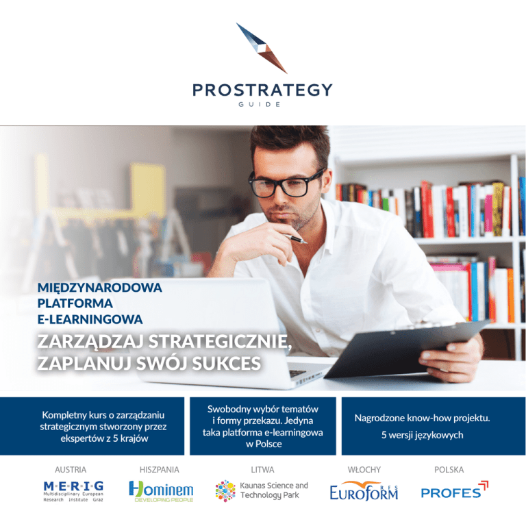 MIĘDZYNARODOWA PLATFORMA E-LEARNINGOWA ZARZĄDZAJ STRATEGICZNIE, ZAPLANUJ SWÓJ SUKCES Kompletny kurs o zarządzaniu strategicznym stworzony przez ekspertów z 5 krajów AUSTRIA HISZPANIA Swobodny wybór tematów i formy przekazu. Jedyna taka platforma e-learningowa w Polsce LITWA Nagrodzone know-how projektu. 5 wersji językowych WŁOCHY POLSKA KORZYŚCI Z UDZIAŁU W E-KURSIE NAUKA ZARZĄDZANIA STRATEGICZNEGO NIGDY NIE BYŁA TAK PROSTA! O PROJEKCIE Planowanie Strategiczne jest najważniejszym wskaźnikiem procesów innowacyjnych i rozwojowych, drogą do zrównoważonego wzrostu i wzmocnienia profilu firmy. Strategiczne planowanie zapewnia przewagę konkurencyjną i pozwala nie tylko na adekwatne reagowanie na zmiany rynkowe, ale także na przygotowywanie średnio i długookresowych koncepcji wejścia na nowe rynki i rozwijania nowych modeli biznesowych. Jest również niezbędne do zachowania wysokiego poziomu innowacyjności w organizacji i utrzymania stanowisk pracy. Co warto zaznaczyć – strategiczne zarządzanie nie jest przeznaczone wyłącznie dla dużych korporacji zatrudniających liczną rzeszę ekspertów. W 2008 roku austriacki instytut MERIG, specjalizujący się w prowadzeniu działań na rzecz MŚP, otrzymał za „Strategy Train” prestiżową nagrodę dla najlepszego projektu realizowanego w ramach Transferu Innowacji programu Leonardo da Vinci. Nasz projekt, PRO-STRATEGY Dołączenie do platformy e-learningowej sprawia, że zarówno firma, jak i menedżerowie/właściciele odnoszą szereg korzyści: ›› Obszerna wiedza zebrana na 30 kartach tematycznych. Każda karta zawiera wideo-wykład, opis narzędzia, interaktywne zadania oraz studium przypadku. ›› Ścieżka edukacyjna dostosowana do potrzeb użytkownika. Swobodny wybór tematyki i formy przekazu. Guide, w sposób innowacyjny adaptuje i rozwija „Strategy Train”, czyniąc wiedzę z zakresu strategicznego zarządzania szeroko dostępną dla wszystkich MŚP. ›› Dostęp w każdym miejscu i każdym czasie z dowolnego urządzenia mobilnego. O PLATFORMIE PRO-LEARNING.PL ›› Know How projektu Strategy Train, uznanego za najlepszy projekt realizowany w ramach Transferu Innowacji programu Leonardo da Vinci. Międzynarodowa współpraca zaowocowała stworzeniem produktu w postaci platformy e-learningowej, która pozwala na elastyczne pozyskiwanie wiedzy z zakresu zarządzania strategicznego. Platforma zawiera kompletny kurs podzielony na 10 rozdziałów i 30 tematów łącznie. Tematy realizowane są w formie Kart on-line składających się z wideo-wykładu, opisu narzędzia, interaktywnego zadania dla uczestnika, oraz studium przypadków zaczerpniętych z praktyki biznesowej MŚP. Dodatkowo na platformie funkcjonuje forum w celu wymiany myśli i dobrych praktyk. Użytkownik ma swobodę wyboru tematu i formy przekazu (wideo-tutorial, opis narzędzia, zadanie bądź case study). Trenerom i konsultantom współpracującym z MŚP udostępniamy praktyczny „Przewodnik wdrażania innowacyjnej kultury uczenia się w organizacji”. ›› Kurs przystosowany do MŚP, przetestowany w 5 krajach. ›› Intuicyjna nawigacja, przyjazny i nowoczesny interfejs. ›› Ograniczenie kosztów szkoleń – bez wyjazdów, organizacji miejsca. ›› Kurs dostępny w 5 językach: polskim, angielskim, hiszpańskim, włoskim i litewskim. SIŁA NASZYCH WIZJI OKREŚLA JAKOŚĆ NASZEJ PRZYSZŁOŚCI. Aby dowiedzieć się więcej zeskanuj QR-kod lub wejdź na stronę projektu! WWW.PRO-LEARNING.PL ODPOWIEMY NA WSZELKIE PAŃSTWA PYTANIA: PROFES sp. z o.o. sp. k. ul. Koreańska 13, 52-121 Wrocław tel. +48 71 341 29 51, 71 335 22 75 e-mail: [email protected] www.profes.com.pl „The most I like is that course is online, well developed.” „This tool helps to find business answers faster and clearly.” „It is a well structured program. It is usefull and not borring at all.” Projekt został zrealizowany przy wsparciu finansowym Komisji Europejskiej w ramach programu „Uczenie się przez całe życie”. Publikacja powstała w wyniku projektu zrealizowanego przy wsparciu finansowym Komisji Europejskiej w ramach programu „Uczenie się przez całe życie”. Publikacja odzwierciedla jedynie stanowisko autora. Komisja Europejska ani Narodowa Agencja nie ponoszą odpowiedzialności za umieszczoną w niej zawartość merytoryczną ani za sposób wykorzystania zawartych w niej informacji.