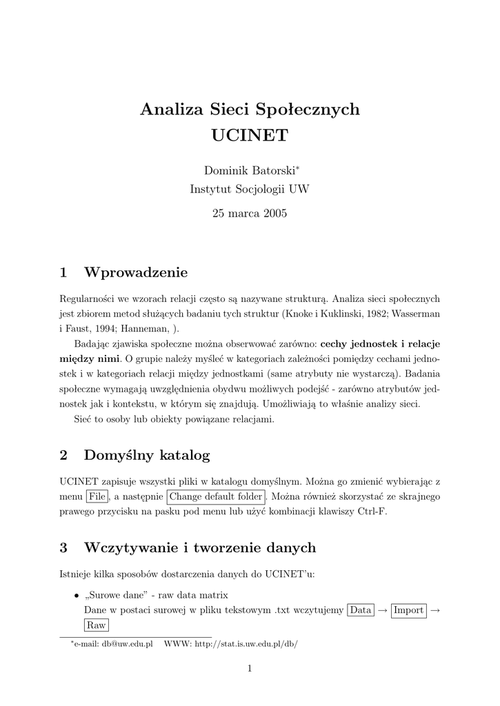 Analiza Sieci Społecznych UCINET Dominik Batorski∗ Instytut Socjologii UW 25 marca 2005 1 Wprowadzenie Regularności we wzorach relacji często są nazywane strukturą. Analiza sieci społecznych jest zbiorem metod służących badaniu tych struktur (Knoke i Kuklinski, 1982; Wasserman i Faust, 1994; Hanneman, ). Badając zjawiska społeczne można obserwować zarówno: cechy jednostek i relacje między nimi. O grupie należy myśleć w kategoriach zależności pomiędzy cechami jednostek i w kategoriach relacji między jednostkami (same atrybuty nie wystarczą). Badania społeczne wymagają uwzględnienia obydwu możliwych podejść - zarówno atrybutów jednostek jak i kontekstu, w którym się znajdują. Umożliwiają to właśnie analizy sieci. Sieć to osoby lub obiekty powiązane relacjami. 2 Domyślny katalog UCINET zapisuje wszystki pliki w katalogu domyślnym. Można go zmienić wybierając z menu File , a następnie Change default folder . Można również skorzystać ze skrajnego prawego przycisku na pasku pod menu lub użyć kombinacji klawiszy Ctrl-F. 3 Wczytywanie i tworzenie danych Istnieje kilka sposobów dostarczenia danych do UCINET’u: • „Surowe dane” - raw data matrix Dane w postaci surowej w pliku tekstowym .txt wczytujemy Data → Import → Raw ∗ e-mail: [email protected] WWW: http://stat.is.uw.edu.pl/db/ 1 • Edytor UCINET’u Data → Edit lub wciśnięcie klawisza „Spreadsheet” pod paskiem mmenu uruchamiają edytor danych, w którym możliwe jest ręczne wprowadzenie i modyfikowanie danych. Możliwe jest również skopiowanie tu danych z Arkusza kalkulacyjnego programu Excel. Dane są zapisywane w postaci UCINET’owych plików o formacie .##H i .##D. • Pliki DL Wczytujemy za wybierając z menu Data → Import → DL • Formaty innych programów Możliwe jest również importowanie plików danych zapisanych w którymś z innych programów do analizy sieci i wizualizacji sieci (Krackplot, Pajek). 4 Eksportowanie danych i wyników Możliwe jest wyeksportowanie danych z UCINET’u do innych programów takich jak Krackplot lub Pajek. Możliwe jest również zapisanie efektów pracy w postaci plików tekstowych. • „Surowe dane” - raw data matrix Dane w postaci surowej do pliku tekstowego Data → Exort → Raw • Formaty innych programów Możliwe jest również zapisanie danych, w innych programach, takich jak: Krackplot, Pajek, Excel Data → Exort → 5 Charakterystyki aktorów Nodal degree Nodal degree to liczba połączeń danego węzła. Węzeł którego degree jest zero jest nazywany izolowanym. UCINET pozwala również policzyć znormalizowaną wartość, czyli liczbe połączeń danego węzła podzieloną przez (g − 1), gdzie g jest liczbą węzłów. Dla relacji ukierunkowanych... Gęstość sieci density 2 Dystans distance: Network → Cohesion → Distance Liczba najkrótszych połączeń number of geodesics: Network → Cohesion → No of Geodesics Centralność Istnieją różne miary centralności (Freeman, 1979): degree centrality : Network → Centrality → Degree closeness centrality : Network → Centrality → Closeness betweenness centrality : Network → Centrality → Betweenness information centrality : Network → Centrality → Information Prestiż 6 Charakterystyki sieci 7 Grupy Kliki, n-kliki, n-klany i k-plexy Istnieje wiele możliwych sposobów podziału sieci na grupy cohesive subgroups. W tym miejscu opiszę ich cztery podstawowe rodzaje, czyli klikę, n-klikę, n-klan oraz k-plex. W programie UCINET można je policzyć wybierając z menu sekwencję Network → Subgroups → klika : → Cliques n-klika : → N-Cliques n-klan : → N-Clans k-plex : → K-Plex Skalowanie wielowymiarowe Skalowanie wielowymiarowe można wykonywać w różnych programach, także w SPSS-ie. UCINET umożliwia to za pomocą: Tools → MDS 3 8 Pozycje i role Literatura Freeman, L. (1979). Centrality in social networks: I. conceptual clarification. Social Networks, 1, 215-239. Hanneman, R. Introduction to social network methods. Knoke, D. i Kuklinski, J. (1982). Network analysis. Sage. Wasserman, S. i Faust, K. (1994). Social networks analysis: Methods and applications. Cambridge University Press. 4