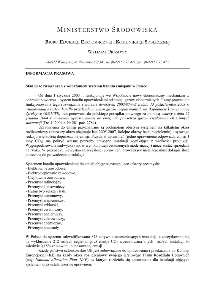 MINISTERSTWO ŚRODOWISKA BIURO EDUKACJI EKOLOGICZNEJ I KOMUNIKACJI SPOŁECZNEJ WYDZIAŁ PRASOWY 00-922 Warszawa, ul. Wawelska 52/54 tel. (0-22) 57 92 471; fax: (0-22) 57 92 473 INFORMACJA PRASOWA Stan prac związanych z wdrażaniem systemu handlu emisjami w Polsce Od dnia 1 stycznia 2005 r. funkcjonuje we Wspólnocie nowy ekonomiczny mechanizm w ochronie powietrza – system handlu uprawnieniami od emisji gazów cieplarnianych. Ramy prawne dla funkcjonowania tego rozwiązania stworzyła dyrektywa 2003/87/WE z dnia 13 października 2003 r. ustanawiająca system handlu przydziałami emisji gazów cieplarnianych we Wspólnocie i zmieniającą dyrektywę 96/61/WE, transponowana do polskiego porządku prawnego za pomocą ustawy z dnia 22 grudnia 2004 r. o handlu uprawnieniami do emisji do powietrza gazów cieplarnianych i innych substancji (Dz. U.2004 r. Nr 281 poz. 2784). Uprawnienia do emisji przyznawane są podmiotom objętym systemem na kilkuletni okres rozliczeniowy (pierwszy okres obejmuje lata 2005-2007, kolejne okresy będą pięcioletnie) i są swego rodzaju wielkością dopuszczalną emisji. Przydział uprawnień (jedno uprawnienie odpowiada emisji 1 tony CO2) ma pokryć własne potrzeby emisyjne instalacji wynikające z wielkości produkcji. Wygospodarowana nadwyżka (np. w wyniku przeprowadzonych modernizacji) może zostać sprzedana na rynku. W przypadku niewystarczającej ilości uprawnień, prowadzący instalację musi dokupić ilość potrzebną do prowadzenia produkcji. Systemem handlu uprawnieniami do emisji objęte są następujące sektory przemysłu: - Elektrownie zawodowe, - Elektrociepłownie zawodowe, - Ciepłownie zawodowe, - Przemysł rafineryjny, - Przemysł koksowniczy, - Hutnictwo żelaza i stali, - Przemysł cementowy, - Przemysł wapienniczy, - Przemysł szklarski, - Przemysł ceramiczny, - Przemysł papierniczy, - Przemysł cukrowniczy, - Przemysł chemiczny, - Przemysł pozostały. W Polsce do systemu zakwalifikowano 878 aktywnie uczestniczących instalacji, a zdecydowano się na wykluczenie 212 małych cegielni, gdyż emisja CO2 wyemitowana z tych małych instalacji to zaledwie 0,15% całkowitej, bilansowanej emisji. Każde państwo członkowskie UE jest zobowiązane do opracowania i przekazania do Komisji Europejskiej (KE) na każdy okres rozliczeniowy swojego Krajowego Planu Rozdziału Uprawnień (ang. National Allocation Plan, NAP), w którym rozdziela się uprawnienia dla instalacji objętych systemem oraz ustala rezerwę uprawnień. Prace nad Krajowym Planem Rozdziału Uprawnień do emisji CO2 na lata 2005-2007 (KPRU) październik 2003 r. - rozpoczęcie postępowania - procedury przetargowej - w sprawie wyboru wykonawcy na wykonanie projektu KPRU grudzień 2003 r. - wyłonienie wykonawcy konsorcjum Energsys i EcoFys czerwiec 2004 r. - przedłożenie zakończonej pracy do Ministerstwa Środowiska lipiec 2004 r. – dalsze prace nad KPRU dla Polski w MŚ i uzgodnienia wewnętrzne z przemysłem i międzyresortowe 20.08.2004 r. – zatwierdzenie KPRU przez Komitet Europejski Rady Ministrów 2.09.2004 r. – przekazanie KPRU do Komisji Europejskiej 19.10.2004 r. - prezentacja 1 w KE (DG Środowisko) 28.10.2004 r. – prezentacja 2 w KE (DG Środowisko) 26.11.2004 r. – MŚ otrzymuje dodatkowe pytania z DG Środowisko KE 10.12.2004 r. – MŚ udziela odpowiedzi na pytania KE 8.03.2005 r. -Decyzja KE dotycząca polskiego KPRU na lata 2005-2007 zmniejszenie całkowitej puli uprawnień o 16,5 %, z 286,2 do 239,1 mln ton CO2 średniorocznie Po decyzji konieczna była zatem weryfikacja wielkości przydziałów uprawnień dla poszczególnych grup instalacji. Kwiecień 2005 r. – pozyskiwanie danych temat emisji CO2 z lat 2003 i 2004 6.05.2005 r. Komitet Europejski Rady Ministrów podjął decyzję o wdrożeniu systemu w Polsce 23.05.2005 r. uzgodnienia z branżami objętymi systemem, 22.06.2005 r. uzgodnienia z branżami objętymi systemem, 27.06.2005 r. uzgodnienia z branżami objętymi systemem, 18.08.2005 r. konsultacje społeczne i wewnątrzresortowe, 16.09.2005 r. konsultacje społeczne i międzyresortowe W wyniku tych konsultacji napływały uwagi, które staraliśmy się uwzględniać w przygotowywanym projekcie rozporządzenia. październik 2005 r. uzgodnienie metodyki rozdziału dla sektora elektrowni zawodowych wspólnie przez Ministerstwo Środowiska i Ministerstwo Gospodarki 6 października 2005 r. Projekt Rozporządzenia Rady Ministrów w sprawie KPRU przedmiotem obrad Komitetu Rady Ministrów - rekomendacja warunkowa do rozpatrzenia przez Radę Ministrów 27 grudnia 2005 r. przyjęcie przez Radę Ministrów rozporządzenia Rady Ministrów w sprawie przyjęcia Krajowego Planu Rozdziału Uprawnień do emisji dwutlenku węgla na lata 2005-2007 oraz wykazu instalacji czasowo wykluczonych ze wspólnotowego systemu handlu uprawnieniami do emisji w okresie od dnia 1 stycznia 2005 r. do dnia 31 grudnia 2007 r., Rozporządzenia do ustawa z 22.12.2004 r. o handlu uprawnieniami do emisji do powietrza gazów cieplarnianych i innych substancji (Dz. U. 2004 r., Nr 281, poz. 2784). Rozporządzenia opublikowane: rozporządzenie Ministra Środowiska z dnia 30.09.2005 r. w sprawie rodzajów instalacji objętych wspólnotowym systemem handlu uprawnieniami do emisji dwutlenku węgla na lata 2005-2007 (Dz. U. Nr 199 poz. 1646), rozporządzenie Ministra Środowiska z dnia 13.09.2005 r. w sprawie wyznaczenia Krajowego Administratora Systemu Handlu Uprawnieniami do Emisji (Dz. U. Nr 186 poz.1562) rozporządzenie Ministra Środowiska z dnia 12 stycznia 2006 r. w sprawie sposobu monitorowania wielkości emisji substancji objętych systemem handlu uprawnieniami do emisji (Dz. U. Nr 16, poz. 124) rozporządzenie Rady Ministrów z dnia 27.12.2005 r. w sprawie przyjęcia Krajowego Planu Rozdziału Uprawnień do emisji dwutlenku węgla na lata 2005-2007 oraz wykazu instalacji czasowo wykluczonych ze wspólnotowego systemu handlu uprawnieniami do emisji w okresie od dnia 1 stycznia