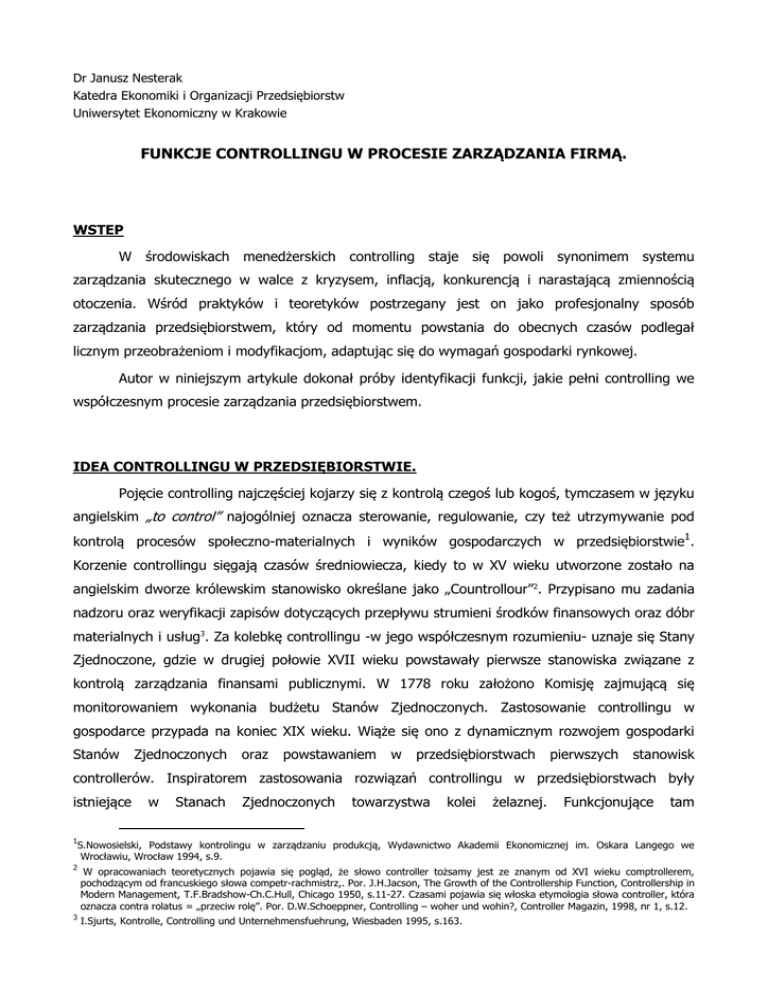 Dr Janusz Nesterak Katedra Ekonomiki i Organizacji Przedsiębiorstw Uniwersytet Ekonomiczny w Krakowie FUNKCJE CONTROLLINGU W PROCESIE ZARZĄDZANIA FIRMĄ. WSTEP W środowiskach menedżerskich controlling staje się powoli synonimem systemu zarządzania skutecznego w walce z kryzysem, inflacją, konkurencją i narastającą zmiennością otoczenia. Wśród praktyków i teoretyków postrzegany jest on jako profesjonalny sposób zarządzania przedsiębiorstwem, który od momentu powstania do obecnych czasów podlegał licznym przeobrażeniom i modyfikacjom, adaptując się do wymagań gospodarki rynkowej. Autor w niniejszym artykule dokonał próby identyfikacji funkcji, jakie pełni controlling we współczesnym procesie zarządzania przedsiębiorstwem. IDEA CONTROLLINGU W PRZEDSIĘBIORSTWIE. Pojęcie controlling najczęściej kojarzy się z kontrolą czegoś lub kogoś, tymczasem w języku angielskim „to control” najogólniej oznacza sterowanie, regulowanie, czy też utrzymywanie pod kontrolą procesów społeczno-materialnych i wyników gospodarczych w przedsiębiorstwie1. Korzenie controllingu sięgają czasów średniowiecza, kiedy to w XV wieku utworzone zostało na angielskim dworze królewskim stanowisko określane jako „Countrollour”2. Przypisano mu zadania nadzoru oraz weryfikacji zapisów dotyczących przepływu strumieni środków finansowych oraz dóbr materialnych i usług3. Za kolebkę controllingu -w jego współczesnym rozumieniu- uznaje się Stany Zjednoczone, gdzie w drugiej połowie XVII wieku powstawały pierwsze stanowiska związane z kontrolą zarządzania finansami publicznymi. W 1778 roku założono Komisję zajmującą się monitorowaniem wykonania budżetu Stanów Zjednoczonych. Zastosowanie controllingu w gospodarce przypada na koniec XIX wieku. Wiąże się ono z dynamicznym rozwojem gospodarki Stanów Zjednoczonych oraz powstawaniem w przedsiębiorstwach pierwszych stanowisk controllerów. Inspiratorem zastosowania rozwiązań controllingu w przedsiębiorstwach były istniejące w Stanach Zjednoczonych towarzystwa kolei żelaznej. Funkcjonujące tam 1 S.Nowosielski, Podstawy kontrolingu w zarządzaniu produkcją, Wydawnictwo Akademii Ekonomicznej im. Oskara Langego we Wrocławiu, Wrocław 1994, s.9. 2 W opracowaniach teoretycznych pojawia się pogląd, że słowo controller tożsamy jest ze znanym od XVI wieku comptrollerem, pochodzącym od francuskiego słowa competr-rachmistrz,. Por. J.H.Jacson, The Growth of the Controllership Function, Controllership in Modern Management, T.F.Bradshow-Ch.C.Hull, Chicago 1950, s.11-27. Czasami pojawia się włoska etymologia słowa controller, która oznacza contra rolatus = „przeciw rolę”. Por. D.W.Schoeppner, Controlling – woher und wohin?, Controller Magazin, 1998, nr 1, s.12. 3 I.Sjurts, Kontrolle, Controlling und Unternehmensfuehrung, Wiesbaden 1995, s.163. przedsiębiorstwa Atchinson, Topeka and Santa Fe Railroad Company utworzyły w 1880 roku pierwsze stanowiska controllerów (ang. comptroller). Równolegle rozwiązania te wdrażano w przemyśle. W 1892 roku rozpoczęto stosowanie technik controllingowych w General Electric Company4. W 1921 roku pojawia się pojęcie controllera w rozumieniu osoby, której główną funkcją było odpowiadanie za budżet i rachunkowość przedsiębiorstwa. Natomiast w latach 1925-1940 przekształcono ideę sterowania, odwołującej się dotychczas tylko do zadań realizowanych przez controllera, w rozbudowany układ rozwiązań instytucjonalnych, kompleksowo wspierających zarządzanie firmą. Wśród czynników przyśpieszających zastosowanie rozwiązań proponowanych przez controlling na szczególną uwagę zasługują5: stale wzrastającą wielkość przedsiębiorstw i narastające w powiązaniu z tym problemy z koordynacją działalności gospodarczej, światowy kryzys gospodarczy, silna walka konkurencyjna, trudności w przewidywaniu koniunktury gospodarczej, silne związki nauki z praktyką gospodarczą. Czynniki te wymusiły na menedżerach konieczność większej dbałości o wzrost efektywności gospodarowania. Controlling oferował wówczas narzędzia umożliwiające jasne wytyczanie celów oraz sprawne weryfikowanie obszarów niedomagań w firmie. Rosnące zainteresowanie controllingiem doprowadziło do utworzenia w 1931 roku w Stanach Zjednoczonych Controller’s Institute of America (Amerykański Instytut Controllerów), istniejącego do dnia dzisiejszego pod nazwą Financial Executives Institute – FEI. Instytut ten od 1934 roku rozpoczął wydawanie czasopisma „The Controller” (od 1962 roku „Financial Executive”), na łamach którego po raz pierwszy opublikowano katalog zadań controllera. W 1944 roku utworzony został w USA instytut naukowy Controllership Foundation, który działa obecnie pod nazwą Financial Executives Research Foundation6. We współczesnej gospodarce amerykańskiej rola controllingu sprowadza się do opracowania i wprowadzenia kompleksowego systemu służącego optymalnemu wykorzystaniu posiadanych zasobów w celu wzrostu efektywności funkcjonowania podmiotu gospodarczego, przy równoczesnym umożliwieniu mu szybkiego reagowania na zmiany występujące w otoczeniu. W takim rozumieniu controlling to "podsystem kierowania firmą obejmujący w swym zakresie funkcję 4 Było to pierwsze przedsiębiorstwo przemysłowe na świecie, w którym utworzono stanowisko o współcześnie brzmiącej i stosowanej nazwie controller. Obecnie w USA funkcjonuje termin controllership-function, wyrażający zadania controllera, zaś samo pojęcie controlling nie jest praktycznie stosowane. 5 S.Nowosielski, Controlling w literaturze i praktyce, Przegląd Organizacji,1998, nr 12, ss.33-36. 6 H.Siegwart, Worin unterscheiden sich amerikanisces und deutsches Controlling, Management Zeitschrift, 1982, nr 2, s.97. 2 planowania, kontroli oraz informacji w celu rozwoju, adaptacji i koordynacji działań całego systemu"7. W gospodarkach państw europej
