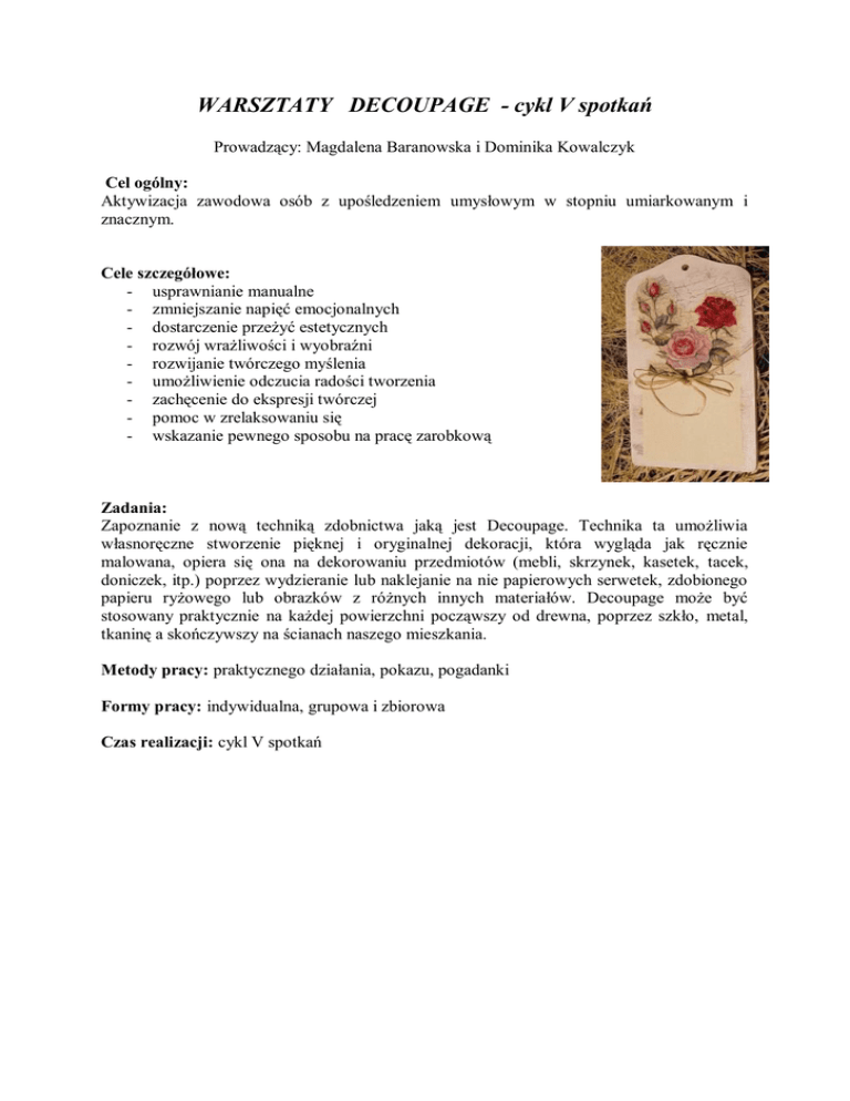 WARSZTATY DECOUPAGE - cykl V spotkań Prowadzący: Magdalena Baranowska i Dominika Kowalczyk Cel ogólny: Aktywizacja zawodowa osób z upośledzeniem umysłowym w stopniu umiarkowanym i znacznym. Cele szczegółowe: - usprawnianie manualne - zmniejszanie napięć emocjonalnych - dostarczenie przeżyć estetycznych - rozwój wrażliwości i wyobraźni - rozwijanie twórczego myślenia - umożliwienie odczucia radości tworzenia - zachęcenie do ekspresji twórczej - pomoc w zrelaksowaniu się - wskazanie pewnego sposobu na pracę zarobkową Zadania: Zapoznanie z nową techniką zdobnictwa jaką jest Decoupage. Technika ta umożliwia własnoręczne stworzenie pięknej i oryginalnej dekoracji, która wygląda jak ręcznie malowana, opiera się ona na dekorowaniu przedmiotów (mebli, skrzynek, kasetek, tacek, doniczek, itp.) poprzez wydzieranie lub naklejanie na nie papierowych serwetek, zdobionego papieru ryżowego lub obrazków z różnych innych materiałów. Decoupage może być stosowany praktycznie na każdej powierzchni począwszy od drewna, poprzez szkło, metal, tkaninę a skończywszy na ścianach naszego mieszkania. Metody pracy: praktycznego działania, pokazu, pogadanki Formy pracy: indywidualna, grupowa i zbiorowa Czas realizacji: cykl V spotkań I warsztaty – zdobienie owalnego obrazka - wstęp – krótka historia Decoupage, omówienie materiałów - prace wstępne, przygotowanie motywu, dobór tła - malowanie, technika shabby shic ( postarzanie), naklejanie - wykończenie pracy – lakierowanie II warsztaty – zdobienie świeca + wieszaka - omówienie materiałów - prace wstępne, przygotowanie motywu, rozplanowanie pracy - malowanie, zastosowanie cracka jednoskładnikowego, naklejanie - wykończenie pracy – lakierowanie III warsztaty – zdobienie tacki - omówienie materiałów - prace wstępne, przygotowanie motywu, dobór tła, - malowanie, zastosowanie cracka jednoskładnikowego, naklejanie - wykończenie pracy – lakierowanie IV warsztaty – zdobienie donicy - omówienie materiałów - prace wstępne, przygotowanie motywu, dobór tła, - malowanie, zastosowanie cracka jednoskładnikowego, naklejanie - wykończenie pracy – lakierowanie V warsztaty – zdobienie małej kasetki - omówienie materiałów - prace wstępne, przygotowanie motywu, rozplanowanie pracy - malowanie, zastosowanie cracka jednoskładnikowego, naklejanie - wykończenie pracy – lakierowanie * przykładowe zdjęcia I. Etapy pracy, którą wykonamy przy ozdabianiu obrazka: 1. Potrzebne materiały: - deseczka (w tym przypadku mały owal) - primer - farba akrylowa – (do drewna i metalu) - pigmenty w różnych kolorach - kawałek świecy do przecierek – shhaby chik - motyw, którym chcemy ozdobić deskę - klej do decoupage - pędzel – szorstki do kleju - gąbki do tepowania - lakier bezbarwny do drewna - papier ścierny - ręcznik papierowy 2. Przystępujemy do pracy: - deseczkę malujemy podkładem czyli „primerem” i czekamy, aż wyschnie; - dobierając kolory odpowiednio do motywu malujemy tył deski wraz z brzegami, bądź obustronnie całą deskę w zależności od tego, jaki efekt chcemy uzyskać; - w celu nadania przedmiotowi starego wyglądu smarujemy kanty deski świecą, malujemy drugim wybranym kolorem farby (pędzlem bądź tepując), uzyskując jednocześnie efekt cieniowania tła; - po wyschnięciu deski papierem ściernym ścieramy delikatnie wierzchnią warstwę farby z kantów (tak, by widoczna była pierwsza warstwa farby); - tak przygotowaną deskę możemy ozdobić dowolnie wybranym, wyciętym z papieru motywem; - papier przed przyklejeniem moczymy ok. 30 sek. zanurzając go całkowicie w wodzie (zwinie się w rulon, po czym rozwinie), odsączamy wodę papierowym ręcznikiem, następnie smarujemy klejem (można smarować ozdabiany przedmiot i papier z wierzchu, bądź tył, a później przód papieru po przyłożeniu do dekorowanego przedmiotu); - dość mocno dociskamy papier do deseczki (by usunąć pęcherzyki powietrza), ale z wyczuciem, by papier się nie porwał; smarujemy klejem od środka motywu do zewnątrz; - po przyklejeniu motywu i wyschnięciu kleju, zabezpieczamy pracę kilkoma warstwami lakieru; II. Etapy pracy, którą wykonamy przy ozdabianiu wieszaka: 1. Potrzebne materiały: - wieszak drewniany, okrągły - primer - farba akrylowa - pigmenty w różnych kolorach - motyw, którym chcemy ozdobić wieszak - klej do decoupage - pędzel – szorstki do kleju - gąbki do tepowania crack jednoskładnikowy – lakier pękający lakier bezbarwny do drewna papier ścierny ręcznik papierowy 2. Przystępujemy do pracy: - wybieramy motyw, którym chcemy ozdobić wieszak; wycinamy go lub wydzieramy z papieru; - przed nałożeniem farb cały wieszak malujemy podkładem czyli primerem; - przygotowujemy farbę podkładową (pierwszą warstwę), dobieramy kolory do wybranego wcześniej motywu; - przy użyciu cracka jednoskładnikowego (efekt spękań) należy pamiętać o tym, by kolory farb (podkładowej i wierzchniej) kontrastowały ze sobą, więc pierwsza farba z reguły jest ciemniejsza, a druga jasna; - miejsca, w których chcemy uzyskać efekt spękania malujemy crackiem – lakierem pękającym; można pomalować cały przedmiot; - lakier nakładamy na wyschniętą powierzchnię, czystym i suchym pędzlem, malując w jednym kierunku (nie poprawiamy raz pomalowanego miejsca); - po dokładnym wyschnięciu lakieru pękającego, przygotowujemy i nakładamy drugi kontrastowy odcień farby (warstwa wierzchnia); - farbę nakładamy pociągnięciem pędzla bez poprawiania (pęknięcia będą zgodne z ruchem pędzla); po kilku chwilach lakier powinien spękać, po czym wyłoni się pierwsza warstw farby, którą nałożyłyśmy; - w celu uzyskania drobnych spękań, należy nakładać drugą warstwę farby w kierunku przeciwnym, niż kierunek nakładania preparatu; - po wyschnięciu farby i spękaniu powierzchni naklejamy wybrany i przygotowany motyw; - następni