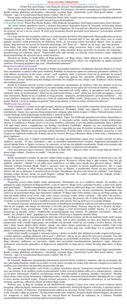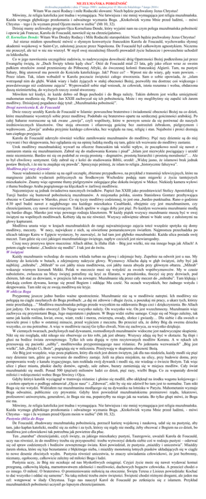 MUZUŁMAŃSKA POBOŻNOŚĆ Archiwalna pogadanka z dnia 17 lutego 1980 r. nadana przez O. Marcela Sokalskiego 7 lutego 2016 r. Witam Was zacni Rodacy i miłe Rodaczki słowami: Niech będzie pochwalony Jezus Chrystus! Mówimy, że religia katolicka jest trudna i wymagająca. Nie łatwiejsza i nie mniej wymagająca jest religia muzułmańska. Każda wymaga głębokiego przekonania i odważnego wyznania Boga. „Ktokolwiek wyzna Mnie przed ludźmi, – mówi Chrystus – tego i Ja wyznam przed Ojcem moim w niebie” (Mt 10, 32). Dzisiaj mamy archiwalny program Ojca Korneliana Dende, który wyjaśni nam na czym polega muzułmańska pobożność i opowie jak Francuz, Karolu de Foucauld, nawrócił się na chrześcijaństwo. O. Kornelian Dende: Witam Was Drodzy Rodacy i Miłe Rodaczki staropolskim: Niech będzie pochwalony Jezus Chrystus! Już nieraz miałem sposobność mówić o słynnym konwertycie francuskim Karolu de Foucauld, wychowanku słynnej akademii wojskowej w Saint-Cyr, założonej jeszcze przez Napoleona. De Foucauld był całkowitym agnostykiem. Niczemu nie przeczył, ale też w nic nie wierzył. W myśl swej niezależnej filozofii prowadził życie hulaszcze i powszechnie uchodził za lekkoducha. Co w jego nawróceniu szczególnie zadziwia, to nadzwyczajna dowolność dróg Opatrzności Bożej podkreślona już przez Ewangelię świętą, że „Duch Święty tchnie kędy chce”. Otóż de Foucauld miał 23 lata, gdy jako oficer wraz ze swoim pułkiem strzelców został przeniesiony do Północnej Afryki, do ówczesnej kolonii francuskiej Algierii. Tam, na pustyni Sahary, Bóg utorował mu powrót do Kościoła katolickiego. Jak? Przez co? – Wprost nie do wiary, gdy wam powiem. – Przez islam. Tak, islam wzbudził w Karolu poczucie świętości całego stworzenia. Sam o sobie opowiada, że „islam wstrząsnął nim do głębi. Widok wiary i ludzi żyjących w stałej obecności Bożej, pozwoliły mu dostrzec coś większego i prawdziwszego niż codzienne zajęcia”. Wyprowadził sobie stąd wniosek, że człowiek, istota rozumna i wolna, obdarzona duszą nieśmiertelną, do wyższych rzeczy został stworzony. Mówiłem też kiedyś, że każde dobro od Boga pochodzi i do Boga należy. Takim dobrem jest wielka umiejętność mahometan modlenia się. Papież Jan XXIII zachwycał się ich pobożnością. Może i my moglibyśmy się zapalić ich żarem modlitwy. Dzisiejszej pogadance daję tytuł: „Muzułmańska pobożność”. Drogi nawrócenia K. de Foucauld Dwie rzeczy urzekły Karola de Foucauld w Islamie: powszechne braterstwo i świadomość obecności Bożej na co dzień, które muzułmanie wyostrzyli sobie przez modlitwę. Podobało się braterstwo oparte na serdecznej gościnności arabskiej. Po całej Saharze rozrzucone są tak zwane „zawije”, czyli wspólnoty, które w pewnym sensie da się porównać do naszych średniowiecznych klasztorów. One stoją otworem i ofiarowują gościnę bez zastrzeżeń żebrakom, pielgrzymom i wędrowcom. „Zawija” arabska przyjmie każdego człowieka, bez względu na rasę, religię i stan. Najubożsi i prości doznają tam ciepłego przyjęcia. Karola de Foucauld uderzyło również wielkie zamiłowanie muzułmanów do modlitwy. Pięć razy dziennie są do niej wzywani i bez skrępowania, bez oglądania się na opinię ludzką modlą się tam, gdzie ich wezwanie do modlitwy zastanie. Urok modlitwy muzułmańskiej wywarł na oficerze francuskim tak wielki wpływ, że początkowo nosił się nawet z zamiarem stania się muzułmaninem. Zabrał się do studiowania Koranu i pisał” „Islam jest niezwykle pociągający i urzekł mnie niezmiernie. Bardzo mi się on podobał ze swoją prostotą – dogmatów, prostotą hierarchii i prostotą moralności”… Ale to był chwilowy sentyment. Gdy zabrał się z kolei do studiowania Biblii, orzekł: „Widzę jasno, że islamowi brak jednak postaw Bożych, i że nie tu znajduje się prawda”. Sprecyzuje później, że islam to religia „historycznie fałszywa”. Modlitwa pięć razy dziennie Nasze wiadomości o islamie są na ogół szczupłe, zbierane przypadkowo, na przykład z transmisji telewizyjnych, które na marginesie jakichś wydarzeń politycznych na Środkowym Wschodzie podają nam migawki z życia tamtejszych mieszkańców. Znamy więc ogromne tłumy pielgrzymów zalegające plac dokoła świątyni w Mekce. Niekiedy kamera wyłowi z tłumu biednego Araba pogrążonego na klęczkach w żarliwej modlitwie. Najcenniejsze są jednak świadectwa naocznych świadków. Papież Jan XXIII jako przedstawiciel Stolicy Apostolskiej w Turcji bardzo się buntował pobożnością muzułmanów. A misjonarka polska, siostra Stanisława Gontarz przebywająca obecnie w Casablance w Maroko, pisze: Co się tyczy modlitwy codziennej, to jest ona „bardzo punktualna. Rano o godzinie 4:30 apel budzi nawet z najgłębszego snu każdego mieszkańca Casablanki, obojętnie czy jest muzułmaninem, czy chrześcijaninem, czy nawet niewierzącym. Takich apelów w ciągu doby jest pięć. Po każdym wezwaniu muzułmanie modlą się bardzo długo. Maroko jest więc pewnego rodzaju klasztorem. W każdy piątek wszyscy muzułmanie muszą być w swej świątyni na wspólnych modlitwach. Kobiety idą na nie również. Wszyscy odświętnie ubrani w białe szaty z założonymi na głowy kapturami. Modlitwa urasta więc w krajach muzułmańskich do rangi najważniejszego zajęcia toteż wszędzie spotyka się domy modlitwy, meczety. W nocy, największe z nich, są oświetlone pomarańczowym światłem. Najprostsza przechadzka po ulicach takiego Kairu w Egipcie wystarczy, by zauważyć, że lud tam jest głęboko muzułmański. Każda ulica posiada swój meczet. Tam gdzie się czci jakiegoś muzułmańskiego świętego, napływ czcicieli jest niewiarogodny. Ciszę nocy przerywa śpiew muezzina: Allach akbar, la illaha illah – Bóg jest wielki, nie ma innego boga jak Allach! A potem ciągłe wołanie: 