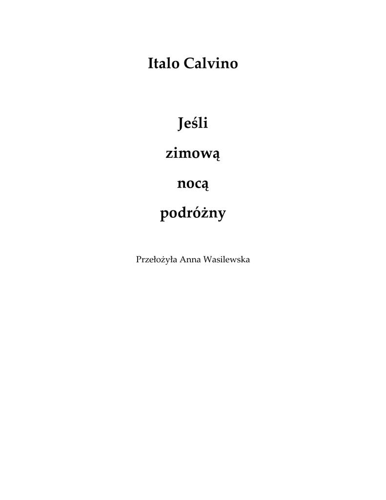 Italo Calvino Jeśli zimową nocą podróżny Przełożyła Anna Wasilewska Danielowi Ponchiroli I Zabierasz się do czytania nowej powieści Italo Calvina Jeśli zimową nocą podróżny. Rozluźnij się. Wytęż uwagę. Oddal od siebie każdą inną myśl. Pozwól, aby świat, który cię otacza, rozpłynął się w nieokreślonej mgle. Drzwi lepiej zamknąć: tam zawsze gra telewizor. Powiedz im to od razu: „Nie, nie chcę oglądać telewizji!” Podnieś głos, inaczej cię nie usłyszą: „Czytam! Nie chcę, aby mi przeszkadzano!” Może cię nie usłyszeli przy całym tym hałasie, powiedz głośniej, krzyknij: „Zaczynam czytać nową powieść Italo Calvina!” A jeśli nie chcesz, nic nie mów, miejmy nadzieję, że zostawią cię w spokoju. Przybierz najwygodniejszą pozycję: usiądź, wyciągnij nogi, połóż się, zwiń się w kłębek. Połóż się na plecach, na boku, na brzuchu. Usiądź na krześle, na kanapie, w fotelu na biegunach, na leżaku, na pufie. Na hamaku, jeśli masz hamak. Połóż się, oczywiście, na łóżku albo do łóżka. Możesz nawet stanąć na głowie, w pozycji jogi. Z książką do góry nogami, rzecz jasna. To nie ulega wątpliwości, nie jest łatwo dobrać pozycję do czytania. Niegdyś czytano na stojąco, przed pulpitem. Pozycja stojąca była czymś zwyczajnym. Odpoczywano w ten sposób po zmęczeniu jazdą konną. Nikomu nie przyszło nigdy do głowy czytać siedząc na koniu, a jednak teraz myśl, by czytać w siodle z książką rozłożoną na końskiej grzywie lub też zawieszoną przy pomocy specjalnej uprzęży na końskich uszach, wydaje ci się pociągająca. Czytanie ze stopami w strzemionach powinno być bardzo wygodne. Uniesione nogi to pierwszy warunek do czerpania przyjemności z lektury. Dobrze zatem, na co czekasz? Wyciągnij nogi, stopy ułóż na poduszce albo na dwóch poduszkach, na poręczy kanapy, na oparciu fotela, na stoliku do herbaty, na biurku, na fortepianie, na globusie. Przedtem zdejmij buty. Oczywiście jeśli zechcesz unieść nogi, bo jeśli nie zechcesz, włóż je z powrotem. Nie siedź tak z butami w jednej ręce, a z książką w drugiej. Ustaw światło tak, by nie męczyło oczu. Zrób to teraz, bo zaledwie pogrążysz się w lekturze, nie sposób cię będzie od niej oderwać. Postaraj się, aby strona nie pozostawała w cieniu, to skupisko czarnych liter na szarym tle przypomina monotonią stado myszy. Uważaj jednak, żeby na kartkę nie padało zbyt mocne światło, aby nie odbijało się od okrutnej bieli papieru, podgryzając cienie czcionek niczym pełne południowe słońce. Postaraj się już teraz przewidzieć wszystko, co mogłoby przerwać ci lekturę. Papierosy połóż w zasięgu ręki, jeśli palisz, a także popielniczkę. Co jeszcze? Może chcesz zrobić siusiu? Dobrze, sam będziesz wiedział. Nie chodzi o to, abyś spodziewał się czegoś szczególnego po tej szczególnej książce. Jesteś jednym z tych, którzy z zasady nie spodziewają się niczego od czegokolwiek. Wiele młodszych od ciebie osób, lub mniej młodych, żyje w oczekiwaniu niezwykłych doznań czerpanych z książek, innych ludzi, z podróży, wydarzeń, z tego, co kryje w sobie dzień jutrzejszy. Natomiast ty nie. Ty wiesz, że najlepszym, czego można oczekiwać, jest uniknięcie najgorszego. Oto wniosek, do jakiego doszedłeś, zarówno w życiu osobistym, jak i w sprawach ogólnych, wręcz dotyczących porządku świata. A co z książkami? Ponieważ wykluczyłeś to uczucie z każdej innej dziedziny, sądzisz, że możesz sobie jeszcze pozwolić na tę młodzieńczą radość oczekiwania w sferze tak wyodrębnionej, jaką jest świat książek, gdzie może ci pójść dobrze albo źle, lecz gdzie ryzyko rozczarowania nie będzie niczym dotkliwym. A zatem przeczytałeś w gazecie, że ukazała się powieść Jeśli zimową nocą podróżny, nowa książka Italo Calvina, pisarza, który od wielu lat niczego nie opublikował. Zaszedłeś do księgarni i kupiłeś egzemplarz. Postąpiłeś słusznie. Jeszcze w oknie wystawy dostrzegłeś okładkę z poszukiwanym tytułem. Podążając tym widocznym tropem, utorowałeś sobie drogę poprzez zwarte zasieki Książek Nigdy Nie Przeczytanych, które spoglądały na ciebie ponuro z księgarskich stołów i półek, usiłując cię onieśmielić. Lecz ty wiesz, że nie powinieneś dać się zbić z tropu, że pośród nich rozciągają się całe hektary Książek Których Równie Dobrze Możesz Nie Czytać, Książek Przeznaczonych Do Innych Celów Niż Lektura, Książek Przeczytanych Jeszcze Zanim Je Otwarto Gdyż Należą Do Kategorii Tych Co Zostały Przeczytane Jeszcze Przed Napisaniem. Pokonujesz pierwszy obwód przedmurza i oto rusza na ciebie piechota Książek Które Z Pewnością Byś Przeczytał Gdybyś Miał Przed Sobą Więcej Niż Jedno Życie Ale Niestety Dni Ci Przeznaczonych Jest Tyle Ile Jest. Jednym susem przeskakujesz przez nie i kierujesz się pomiędzy zastępy Książek Które Masz Zamiar Przeczytać Chociaż Przedtem Powinieneś Przeczytać Inne, te Nazbyt Drogie Które Będziesz Mógł Kiedyś Kupić Za Pół Ceny. Książek Idem Jak Powyżej Gdy Ukażą Się W Wydaniu Kieszonkowym, Książek Które Przeczytali Już Wszyscy A Zatem Jest Tak Jakbyś Ty Przeczytał Je Także. Udaremniając te ataki, zmierzasz pod wieże fortyfikacji, gdzie stawiają opór Książki Które Od Dawna Zamierzasz Przeczytać, Książki Których Od Lat Poszukujesz Bez Powodzenia, Książki Które Dotyczą Tego Czym Właśnie Się Zajmujesz, Książki Które Chcesz Mieć Pod Ręką Na Wszelki Wypadek. Książki Które Mógłbyś Odłożyć Na Wakacyjną Lekturę, Książki Którymi Mógłbyś Zapełnić Wolne Miejsce W Twojej Bibliotece, Książki Które Rozbudzają W Tobie Ciekawość Niespodziewaną Gwałtowną I Niezbyt Wyraźnie Usprawiedliwioną. Tak oto zdołałeś ograniczyć siły zbrojne do zbioru z pewnością nadal pokaźnego, lecz dającego się spro
