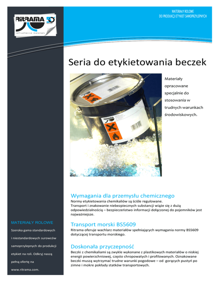 Seria do etykietowania beczek Materiały opracowane specjalnie do stosowania w trudnych warunkach środowiskowych. Wymagania dla przemysłu chemicznego Normy etykietowania chemikaliów są ściśle regulowane. Transport i znakowanie niebezpiecznych substancji wiąże się z dużą odpowiedzialnością – bezpieczeństwo informacji dołączonej do pojemników jest najważniejsze. MATERIAŁY ROLOWE Transport morski BS5609 Szeroka gama standardowych Ritrama oferuje wachlarz materiałów spełniających wymagania normy BS5609 dotyczącej transportu morskiego. i niestandardowych surowców samoprzylepnych do produkcji etykiet na roli. Odkryj naszą pełną ofertę na www.ritrama.com. Doskonała przyczepność Beczki z chemikaliami są zwykle wykonane z plastikowych materiałów o niskiej energii powierzchniowej, często chropowatych i profilowanych. Oznakowane beczki muszą wytrzymać trudne warunki pogodowe – od gorących pustyń po zimne i mokre pokłady statków transportowych. Seria do etykietowania beczek NAZWA KLEJ PODKŁAD MATERIAŁ WIERZCHNI WAGA g/m² GRUBOŚĆ µ * RI-847/80 PE MATT WHITE AP912 WG62 Matowa białą folia HDPE 75 80 * RI-757/60 PP GLOSS RP1101 WHITE TC WG62 Błyszczący biały kawitowany polipropylen TC 45 60 RI-767/65 PP MATT WHITE TC WG62 Matowy biały polipropylen TC 49 65 RP1021 * Kopie certyfikatów BS5609 dla tych produktów są dostępne na życzenie. MATERIAŁY ROLOWE Szeroka gama standardowych i niestandardowych surowców samoprzylepnych do produkcji etykiet na roli. Odkryj naszą pełną ofertę na www.ritrama.com. Seria do etykietowania beczek 01.13