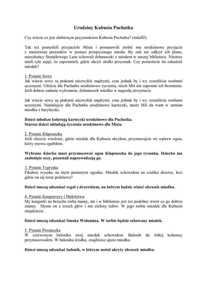 Urodziny Kubusia Puchatka Czy wiecie co jest ulubionym przysmakiem Kubusia Puchatka? (miód) Tak też pomyśleli przyjaciele Misia i postanowili zrobić mu urodzinowe przyjęcie z mnóstwem prezentów w postaci przepysznego miodu. By miś nie odkrył ich planu, mieszkańcy Stumilowego Lasu schowali dzbanuszki z miodem w naszej bibliotece. Niestety mieli tyle zajęć, że zapomnieli, gdzie ukryli słodki przysmak. Czy pomożecie im odnaleźć miodek? 1. Pytanie Sowy Jak wiecie sowy są ptakami niezwykle mądrymi, czas jednak by i wy zostaliście osobami uczonymi. Ułóżcie dla Puchatka urodzinowe życzenia, niech Miś nie zapomni ich brzmienia. Jeśli dobrze zadanie wykonacie, dzbanuszek miodku w nagrodę otrzymacie. Jak wiecie sowy są ptakami niezwykle mądrymi, czas jednak by i wy zostaliście osobami uczonymi. Namalujcie dla Puchatka urodzinowe karteczki, może Miś da wam w zamian miodku z baryłeczki. Dzieci młodsze kolorują karteczki urodzinowe dla Puchatka. Starsze dzieci układają życzenia urodzinowe dla Misia. 2. Pytanie Kłapouszka Jeśli chcecie wiedzieć, gdzie miodek dla Kubusia ukryłem, przymocujcie mi wpierw ogon, który znowu zgubiłem. Wybrane dziecko musi przymocować ogon Kłapouszka do jego rysunku. Dziecko ma zasłonięte oczy, pozostali naprowadzają go. 3. Pytanie Tygryska Fikałem wysoko na mym pasiastym ogonku. Miodek schowałem na czubku drzewa, lecz gdzie on się teraz podziewa? Dzieci muszą odszukać regał z drzewkiem, na którym będzie wisieć obrazek miodku. 4. Pytanie Kangurzycy i Maleństwa My kangurki na brzuchu torbę mamy, ale i w bibliotece jest też podobny stwór co go dobrze znamy. Słynie on z trzech głów i ma zielony tułów. W jego torbie miodek dla Kubusia znajdziecie. Dzieci muszą odszukać Smoka Wolumina. W torbie będzie schowany miodek. 5. Pytanie Prosiaczka W czerwonym baloniku swój miodek schowałem. Balonik przymocowałem. W balonika środku, znajdziesz sporo miodku. do żółtej kolumny Dzieci muszą odszukać balonik, w którym został ukryty obrazek miodku. 6. Pytanie Krzysia Kubuś o swą formę bardzo dba. Pokażcie, że wam na zdrowiu też zależy, a powiem wam gdzie miodek dla misia leży. Zabawa ruchowa. Opracowała Sabina Konior