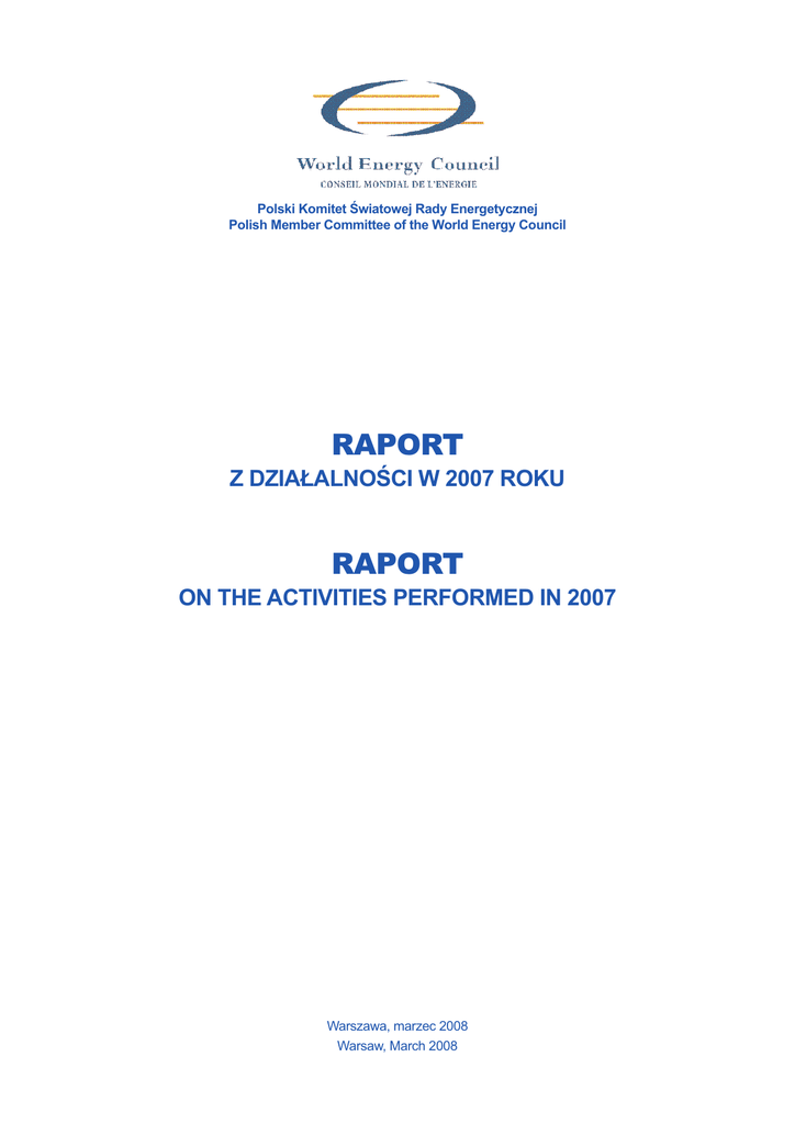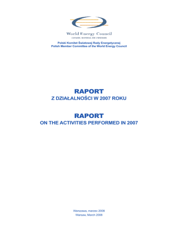 Polski Komitet Światowej Rady Energetycznej Polish Member Committee of the World Energy Council RAPORT Z DZIAŁALNOŚCI W 2007 ROKU RAPORT ON THE ACTIVITIES PERFORMED IN 2007 Warszawa, marzec 2008 Warsaw, March 2008 SPIS TREŚCI TABLE OF CONTENTS 1. SŁOWO WSTĘPNE PRZEWODNICZĄCEGO POLSKIEGO KOMITETU ŚWIATOWEJ RADY ENERGETYCZNEJ 1. INTRODUCTION BY THE CHAIRMAN OF POLISH MEMBER COMMITTEE OF THE WORLD ENERGY COUNCIL 2. ŚWIATOWA RADA ENERGETYCZNA I JEJ DZIAŁALNOŚĆ W 2007 R. 2. WORLD ENERGY COUNCIL AND ITS ACTIVITIES IN 2007 2.1. Rys historyczny, cele i formy działalności 2.1. Historical outline, objectives and forms of activity 2.2. Członkowie 2.2. Members 2.3. Organizacja i władze 2.3. Organisation and authorities 2.4. Węzłowe kierunki działalności 2.4. Key directions of activity 3. 20. ŚWIATOWY KONGRES ENERGETYCZNY 3. 20TH WORLD ENERGY CONGRESS 3.1. Organizacja Kongresu 3.1. Organisation of Congress 3.2. Wiodące tematy Kongresu 3.2. Key topics of Congress 3.3. Aktualna sytuacja energetyczna świata 3.3. Current energy situation of the world 3.4. Podsumowanie obrad kongresowych 3.4. Summary of Congress sessions 4. OŚWIADCZENIE ŚWIATOWEJ RADY ENERGETYCZNEJ NA 2008 R. 4. WORLD ENERGY COUNCIL STATEMENT FOR THE YEAR 2008 5. POLSKI KOMITET ŚWIATOWEJ RADY ENERGETYCZNEJ (PK ŚRE) I JEGO DZIAŁALNOŚĆ W 2007 R. 5. POLISH MEMBER COMMITTEE OF THE WORLD ENERGY COUNCIL AND ITS ACTIVITIES IN 2007 5.1. Organizacja, członkowie i władze 5.1. Organisation, members and authorities 5.2. Realizacja zadań w 2007 r. 5.2. Activities performed in 2007 5.3. Przychody, koszty i wynik finansowy 5.3. Financial statement 3 1. SŁOWO WSTĘPNE PRZEWODNICZĄCEGO POLSKIEGO KOMITETU ŚWIATOWEJ RADY ENERGETYCZNEJ Szanowni Państwo, 1. INTRODUCTION BY THE CHAIRMAN OF POLISH MEMBER COMMITTEE OF THE WORLD ENERGY COUNCIL Ladies and Gentlemen, Rok 2007 był 83. rokiem członkostwa Polski w Światowej Radzie Energetycznej (ŚRE) i jedenastym rokiem działalności Polskiego Komitetu jako samodzielnego stowarzyszenia. Rok 2007 w działalności ŚRE to rok dużego wydarzenia w życiu tej światowej organizacji, jakim był 20. Kongres Energetyczny zorganizowany w listopadzie w Rzymie. Stąd działalność ŚRE w 2007 r. była głównie ukierunkowana na: • realizację zadań wynikających z ustaleń 19. Kongresu, który odbył się w 2004 r. w Sydney, a zwłaszcza zakończenie prac studialnych dotyczących ważnych problemów energetyki światowej; • organizację dorocznego Zgromadzenia Wykonawczego ŚRE; • przygotowania do Kongresu i jego organizacji. Działalność Polskiego Komitetu ŚRE w 2007 r. była w znacznym stopniu pochodną działalności całej Światowej Rady Energetycznej i była głównie ukierunkowana na: • udział naszych przedstawicieli w pracach kilku komitetów i grup studialnych; • przygotowanie różnych materiałów i opracowań na nadchodzący Kongres, zwłaszcza oceny polskich zasobów energetycznych, przygotowanie kilku referatów na Kongres; • uczestnictwo w różnych krajowych konferencjach, na których prezentowaliśmy kilka referatów dotyczących światowej i polskiej sytuacji energetycznej; • zakończenie prac oraz publikację raportu dotyczącego sytuacji energetycznej świata i Polski w latach 19702005 oraz perspektyw rozwoju światowego i polskiego sektora energii do 2030 r. W naszym raporcie z działalności w 2007 r. zamieszczamy szerszą informację o dominujących na Kongresie problemach energetyki światowej oraz wystąpieniach liderów światowego sektora energii. Wyrażam nadzieję, że nasz raport za 2007 r. przybliży naszym członkom problemy światowej energetyki, jak również pozwoli na ocenę działalności naszego stowarzyszenia w minionym roku. Year 2007 was the 83rd year of Poland’s membership in the World Energy Council (WEC) and the 11th year of the activity of Polish Member Committee as the self-governing association. Year 2007 was for WEC the year of the important event in the activities of this global organisation which was the 20th World Energy Congress organised in November in Rome. Therefore the activities of WEC in 2007 were mainly directed at: • implementation of the tasks defined at the 19th Congress which took place in 2004 in Sydney, and particularly completion of the studies concerning the important global energy problems; • organisation of the annual Executive Assembly of the WEC; • preparation to the Congress and its organisation. Activities performed in 2007 by Polish Member Committee of the WEC followed to the large extent the activities of the World Energy Council itself and were mainly directed at: • participation of our representatives in several committees and study groups; • preparation of various materials for the Rome Congress, particularly of the survey of Polish energy resources and preparation of several technical papers for the Congress; • participation in various national conferences at which we presented the papers concerning the issues of global and national energy situation; • completion of the preparatory work and publication of the report on the energy sector’s of the world and Poland evolution in the years 1970-2005 and development prospects to the year 2030. In our report of the activities performed in 2007 we include the wide information on the key world energy problems discussed at the Congress and in the Congress speeches of the world energy sector leaders. I express my hope that our report for the year 2007 will approach the global energy problems to our members as well as will be useful for the assessment of our association’s activities performed in the past year. Zbigniew Bicki Przewodniczący Polskiego Komitetu Światowej Rady Energetycznej Zbigniew Bicki Chairman of the Polish Committee of the World Energy Council 4 2. ŚWIATOWA RADA ENERGETYCZNA I JEJ DZIAŁALNOŚĆ W 2007 R. 2. WORLD ENERGY COUNCIL AND ITS ACTIVITIES IN 2007 2.1. Rys historyczny, cele i formy działalności 2.1. H