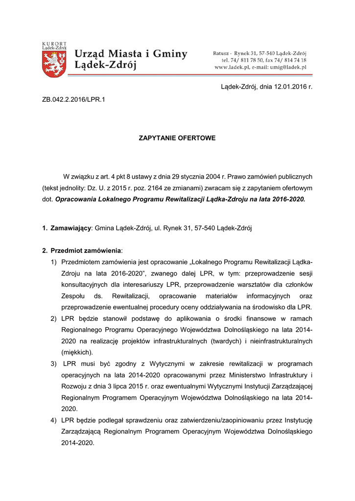 Lądek-Zdrój, dnia 12.01.2016 r. ZB.042.2.2016/LPR.1 ZAPYTANIE OFERTOWE W związku z art. 4 pkt 8 ustawy z dnia 29 stycznia 2004 r. Prawo zamówień publicznych (tekst jednolity: Dz. U. z 2015 r. poz. 2164 ze zmianami) zwracam się z zapytaniem ofertowym dot. Opracowania Lokalnego Programu Rewitalizacji Lądka-Zdroju na lata 2016-2020. 1. Zamawiający: Gmina Lądek-Zdrój, ul. Rynek 31, 57-540 Lądek-Zdrój 2. Przedmiot zamówienia: 1) Przedmiotem zamówienia jest opracowanie „Lokalnego Programu Rewitalizacji LądkaZdroju na lata 2016-2020”, zwanego dalej LPR, w tym: przeprowadzenie sesji konsultacyjnych dla interesariuszy LPR, przeprowadzenie warsztatów dla członków Zespołu ds. Rewitalizacji, opracowanie materiałów informacyjnych oraz przeprowadzenie ewentualnej procedury oceny oddziaływania na środowisko dla LPR. 2) LPR będzie stanowił podstawę do aplikowania o środki finansowe w ramach Regionalnego Programu Operacyjnego Województwa Dolnośląskiego na lata 20142020 na realizację projektów infrastrukturalnych (twardych) i nieinfrastrukturalnych (miękkich). 3) LPR musi być zgodny z Wytycznymi w zakresie rewitalizacji w programach operacyjnych na lata 2014-2020 opracowanymi przez Ministerstwo Infrastruktury i Rozwoju z dnia 3 lipca 2015 r. oraz ewentualnymi Wytycznymi Instytucji Zarządzającej Regionalnym Programem Operacyjnym Województwa Dolnośląskiego na lata 20142020. 4) LPR będzie podlegał sprawdzeniu oraz zatwierdzeniu/zaopiniowaniu przez Instytucję Zarządzającą Regionalnym Programem Operacyjnym Województwa Dolnośląskiego 2014-2020. 5) LPR zawierać będzie m.in. diagnozę czynników i zjawisk kryzysowych wynikającą z diagnozy społeczno-gospodarczej gminy, wizję oraz cele rewitalizacji (kierunki rozwoju), listę planowanych projektów, system wdrażania i monitoringu. 6) Wykonawca LPR będzie zobowiązany do przeprowadzenia pełnej diagnozy służącej wyznaczeniu obszaru zdegradowanego oraz zdefiniowaniu dotykających go problemów. Diagnoza powinna łącznie objąć kwestie społeczne, ekonomiczne, przestrzenne, infrastrukturalne, środowiskowe oraz kulturowe. 7) Analiza i diagnoza zawarta w dokumencie powinna obejmować swoim zakresem zarówno miasto Lądek-Zdrój, jak i 9 sołectw, tj.: Kąty Bystrzyckie, Konradów, Lutynia, Orłowiec, Radochów, Skrzynka, Stójków, Wójtowka, Trzebieszowice i opierać się na możliwie najnowszych dostępnych danych. W przypadku braku jakichkolwiek danych w określonym temacie Wykonawca będzie zobowiązany do ich zebrania we własnym zakresie. 3. Termin realizacji zamówienia oraz związania Wykonawcy ofertą: 1) LPR (wraz z przeprowadzeniem ewentualnej procedury oceny oddziaływania na środowisko) należy przygotować w terminie do dnia 15 maja 2016 r. Termin wykonania przedmiotu zamówienia może ulec przedłużeniu wówczas, gdy: a) Zmianie ulegną Wytyczne w zakresie rewitalizacji w programach operacyjnych na lata 2014 – 2020 wydane przez Ministra Infrastruktury i Rozwoju z dnia 3 lipca 2015 r., a zmiana Wytycznych będzie posiadała wpływ na sporządzany Lokalny Program Rewitalizacji. b) Zmianie ulegną terminy składania LPR do oceny ich zgodności z Wytycznymi do Instytucji Zarządzającej RPO WD 2014-2020. c) Wykonawca nie uzyska od Zamawiającego wszystkich danych niezbędnych do prawidłowego sporządzenia LPR w terminie umożliwiającym jego przygotowanie. 2) Termin związania ofertą wynosi 60 dni. 4. Warunki udziału w postępowaniu ofertowym: O udzielenie zamówienia mogą ubiegać się wykonawcy, którzy: 1) Posiadają wiedzę i doświadczenie niezbędne do realizacji przedmiotu zamówienia. Zamawiający uzna warunek za spełniony, jeżeli Wykonawca wykaże, że w okresie 3 lat przed upływem terminu składania ofert, a jeżeli okres prowadzenia działalności jest krótszy – w tym okresie: a) Wykonał należycie przynajmniej 4 usługi polegające na sporządzeniu dokumentów dotyczących jednostek samorządu terytorialnego zawierających co najmniej diagnozę sytuacji społeczno-gospodarczej oraz kierunki rozwoju (strategię rozwoju) na okres nie krótszy niż 5 lat. b) Minimum 2 z wymienionych w pkt 4 ppkt 1 lit. a) dokumentów niezbędnych do uzyskania dofinansowania ze środków zewnętrznych spoza budżetu JST (np. środki pochodzące z budżetu UE) na realizację przedsięwzięć infrastrukturalnych (twardych) i nieinfrastrukturalnych (miękkich). c) Minimum 2 z wymienionych w pkt 4 ppkt 1 lit. a) dokumentów zawierają zestaw wskaźników monitoringu strategii uwzgledniających wskaźniki produktu i wskaźniki rezultatu. d) Wykonawca przeprowadził co najmniej 2 procesy konsultacji społecznych dla dokumentów o których mowa w pkt 4 ppkt 1 lit. a). e) Wartość minimum 2 z wymienionych w pkt 4 ppkt 1 lit. a) dokumentów wynosiła nie mniej niż 30 tyś. zł netto każdy. 2) Posiadają odpowiedni potencjał techniczny i dysponują osobami zdolnymi do wykonania zamówienia. Zamawiający uzna warunek za spełniony jeżeli wykonawca wykaże, że dysponuje lub będzie dysponował zespołem co najmniej 4 ekspertów: a) Kierownik zespołu, który spełnia następujące wymagania: - posiada wykształcenie wyższe oraz minimum jedną publikację naukową z zakresu rewitalizacji lub wykształcenie wyższe uzupełnione specjalistycznymi studiami podyplomowymi z zakresu rewitalizacji; - kierował przygotowaniem co najmniej dwóch dokumentów, o których mowa w pkt 4 ppkt 1 lit. a) i b) o wartości nie mniejszej niż 30 tyś. zł netto; - posiada doświadczenie w zakresie procesu wdrażania dokumentów, o których mowa w pkt 4 ppkt 1 lit.b); b) Ekspert ds. analizy społeczno-gospodarczej, który spełnia następujące wymagania: - posiada tytuł doktora nauk ekonomicznych lub wykształcenie wyższe ekonomiczne uzupełnione specjalistycznymi studiami podyplomowymi z zakresu metod analiz społeczno-gospodarczych; - posiada doświadczenie w zakresie przygotowania diagnozy społeczno-gospodar