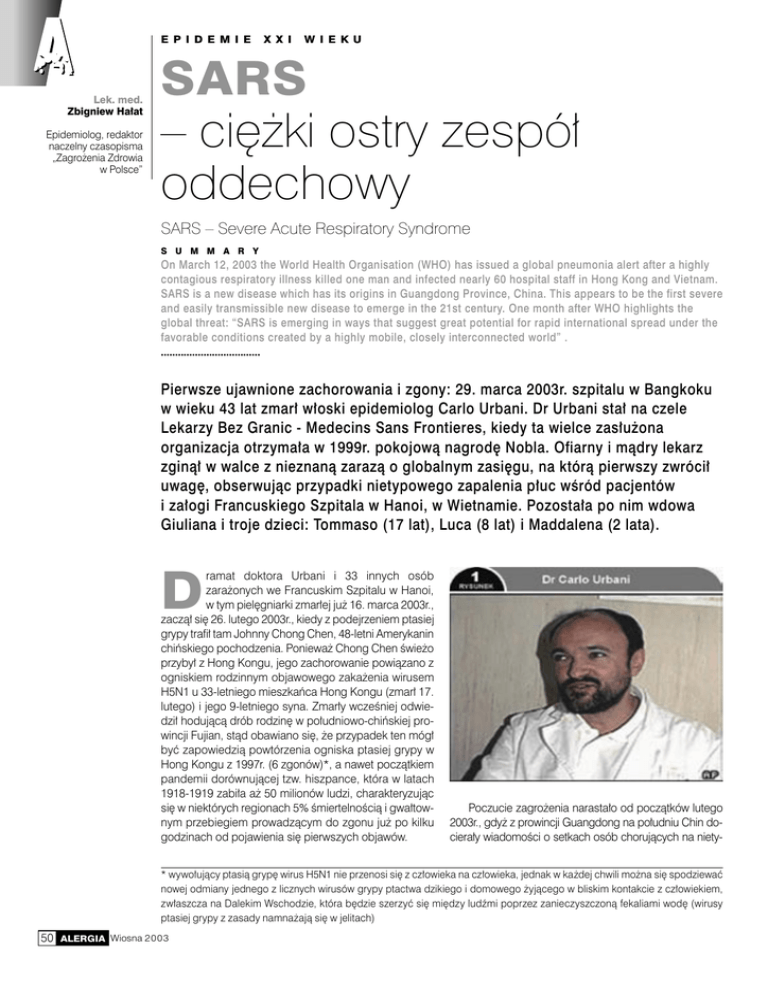 E P I D E M I E Lek. med. Zbigniew Hałat Epidemiolog, redaktor naczelny czasopisma „Zagrożenia Zdrowia w Polsce” X X I W I E K U SARS – ciężki ostry zespół oddechowy SARS – Severe Acute Respiratory Syndrome S U M M A R Y On March 12, 2003 the World Health Organisation (WHO) has issued a global pneumonia alert after a highly contagious respiratory illness killed one man and infected nearly 60 hospital staff in Hong Kong and Vietnam. SARS is a new disease which has its origins in Guangdong Province, China. This appears to be the first severe and easily transmissible new disease to emerge in the 21st century. One month after WHO highlights the global threat: “SARS is emerging in ways that suggest great potential for rapid international spread under the favorable conditions created by a highly mobile, closely interconnected world” . ................................... Pierwsze ujawnione zachorowania i zgony: 29. marca 2003r. szpitalu w Bangkoku w wieku 43 lat zmarł włoski epidemiolog Carlo Urbani. Dr Urbani stał na czele Lekarzy Bez Granic - Medecins Sans Frontieres, kiedy ta wielce zasłużona organizacja otrzymała w 1999r. pokojową nagrodę Nobla. Ofiarny i mądry lekarz zginął w walce z nieznaną zarazą o globalnym zasięgu, na którą pierwszy zwrócił uwagę, obserwując przypadki nietypowego zapalenia płuc wśród pacjentów i załogi Francuskiego Szpitala w Hanoi, w Wietnamie. Pozostała po nim wdowa Giuliana i troje dzieci: Tommaso (17 lat), Luca (8 lat) i Maddalena (2 lata). D ramat doktora Urbani i 33 innych osób zarażonych we Francuskim Szpitalu w Hanoi, w tym pielęgniarki zmarłej już 16. marca 2003r., zaczął się 26. lutego 2003r., kiedy z podejrzeniem ptasiej grypy trafił tam Johnny Chong Chen, 48-letni Amerykanin chińskiego pochodzenia. Ponieważ Chong Chen świeżo przybył z Hong Kongu, jego zachorowanie powiązano z ogniskiem rodzinnym objawowego zakażenia wirusem H5N1 u 33-letniego mieszkańca Hong Kongu (zmarł 17. lutego) i jego 9-letniego syna. Zmarły wcześniej odwiedził hodującą drób rodzinę w południowo-chińskiej prowincji Fujian, stąd obawiano się, że przypadek ten mógł być zapowiedzią powtórzenia ogniska ptasiej grypy w Hong Kongu z 1997r. (6 zgonów)*, a nawet początkiem pandemii dorównującej tzw. hiszpance, która w latach 1918-1919 zabiła aż 50 milionów ludzi, charakteryzując się w niektórych regionach 5% śmiertelnością i gwałtownym przebiegiem prowadzącym do zgonu już po kilku godzinach od pojawienia się pierwszych objawów. Poczucie zagrożenia narastało od początków lutego 2003r., gdyż z prowincji Guangdong na południu Chin docierały wiadomości o setkach osób chorujących na niety- * wywołujący ptasią grypę wirus H5N1 nie przenosi się z człowieka na człowieka, jednak w każdej chwili można się spodziewać nowej odmiany jednego z licznych wirusów grypy ptactwa dzikiego i domowego żyjącego w bliskim kontakcie z człowiekiem, zwłaszcza na Dalekim Wschodzie, która będzie szerzyć się między ludźmi poprzez zanieczyszczoną fekaliami wodę (wirusy ptasiej grypy z zasady namnażają się w jelitach) 50 ALERGIA Wiosna 2003 E P I D E M I E X X I W I E K U Z powodu odmiennego definiowania przypadków w różnych krajach, przypadki prawdopodobne są zgłaszane przez wszystkie kraje z wyjątkiem USA, które zgłaszają przypadki podejrzeń objęte dochodzeniem epidemiologicznym. 2 Początek okresu objętego nadzorem uległ zmianie na 1. listopada 2002r., aby można było objąć przypadki nietypowego zapalenia płuc w Chinach, które obecnie zalicza się do SARS 3 Krajowe władze zdrowia publicznego zgłaszają do WHO informacje dotyczące obszarów, na których występuje jeden lub więcej miejscowy łańcuch transmisji. 4 Jeden zgon, który wystąpił w Hong Kongu, dotyczył przypadku przeniesionego z Wietnamu. 1 powe zapalenie płuc, które powinny być objęte dochodzeniem epidemiologicznym w kierunku wyjaśnienia ich związku z ptasią grypą, gdyby nie zakaz władz w Pekinie. Właśnie z Zhong Shan w południowych Chinach przybył 21. lutego do pokoju na IX piętrze hotelu Metropole w Hong Kongu 64-letni profesor nefrologii, który choć od 16. lutego miał objawy grypy, tuż po przybyciu udał się wraz ze swoim szwagrem na zakupy, by w następnym dniu z powodu niewydolności oddechowej trafić na oddział intensywnej terapii szpitala, gdzie zmarł 4. marca. 53-letni szwagier profesora zachorował 24. lutego i pomimo intesywnego leczenia zmarł 19. marca, jak obliczono jego kontakt z przybyszem z Zhong Shan trwał 10 godzin. 23. lutego zachorowała 35-letnia pielęgniarka oddziału intesywnej terapii, przebywająca w sali, w której leżał profesor, lecz nie podchodząca do niego bliżej niż na odległość 1 metra, ponieważ nie wchodziła w skład ratującego go zespołu. Listę zachorowań wtórnych w stosunku do przypadku indeksowego zamyka 72-letni Kanadyjczyk chińskiego pochodzenia, który po przylocie z domu w Toronto od 13. lutego wynajmował pokój na IX piętrze hotelu Metropole i zachorował 28. lutego. Kontakt tego pacjenta z przypadkiem indeksowym mógł nastąpić tylko 21. lutego i ograniczać się np. do wspólnego oczekiwania na windę hotelową, choć nawet tego nie potwierdził mieszkaniec Toronto. Przypadki następnej generacji to cztery pielęgniarki (kobiety w wieku 38, 47, 54 i 56 lat) opiekujące się przypadkami wtórnymi w czasie od 6 do 40 godzin, 50-letni mężczyzna, który trzykrotnie odwiedzał Kanadyjczyka (raz w hotelu i dwukrotnie w szpitalu) oraz 56-letni pacjent dzielący z nim ten sam segment oddziału szpitalnego. W dniach 19-21. lutego na IX piętrze hotelu Metropole w Hong Kongu przebywały także inne osoby przybyłe z Toronto: para małżeńska przybyła w odwiedziny do syna Wiosna 2003 ALERGIA 51 E P I D E M I E 1 RYSUNEK X X I W I E K U Wybarwiony negatywnie SARS widziany w mikroskopie elektronowym 7. marca z powodów kardio