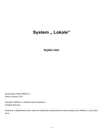 System „ Lokale” Szybki start Opracowanie i skład: MMSoft s.c Kraków czerwiec 2010 Copyright© MMSoft s.c. Wszelkie prawa zastrzeżone. All Rights Reserved Powielanie w jakiejkolwiek formie całości lub fragmentów podręcznika bez pisemnej zgody firmy MMSoft s.c. jest zabro nione - 1- 1 INFORMACJE OGÓLNE Głównym zadaniem programu Lokale jest pomoc w administrowaniu wspólnotami, spółdzielniami mieszkaniowymi (także TBS–ami, współwłasnościami, itp.) i nieruchomościami komercyjnymi z akcentem na obsługę rozliczeń mieszkańców (najemców). System oferuje całkowitą automatyzację procesu naliczania zaliczek i późniejszego ich rozliczania na podstawie faktycznie poniesionych kosztów oraz generuje niezbędne raporty, zestawienia i sprawozdania finansowe. Dodatkowo przechowuje pełną ewidencję danych o mieszkańcach, budynkach, urządzeniach pomiarowych (wraz z całkowitą historią odczytów), różnych zgłoszeniach oraz dowolne dane dodatkowe podzielone na definiowalne kategorie (np. umowy, uchwały itp.). Program posiada również część księgową niezbędną do kompleksowej obsługi nieruchomości. W tym podręczniku poruszymy tylko podstawowe zagadnienia związane z programem Lokale, a więc informacje dotyczące instalacji programu, wprowadzenia nowej wspólnoty, najczęściej wykonywanych czynności w księgowości, prostych rozliczeń. Jest również rozdział poświęcony pytaniom, jakie się pojawiają na początku pracy z programem. Bardziej zaawansowane zagadnienia zostaną zawarte w drugiej części podręcznika. Poziom podstawowy ma za zadanie nauczyć podstaw używania naszego programu zastępując pierwsze szkolenia, sprawić, aby praca na systemie Lokale stała się prosta i przyjemna. - 2- 1.1 Wymagania sprzętowe i systemowe : Program można uruchomić na każdej dowolnej konfiguracji sprzętowej komputera klasy PC z systemem operacyjnym minimum Windows '95. Minimalne wymagania dla płynnej pracy dla wersji jednostanowiskowej: • Procesor Intel Pentium III 500MHz • 256 MB pamięci RAM • Dysk twardy: do instalacji program wymaga co najmniej 10MB wolnego miejsca, kopia bazy jednej wspólnoty 50 lokalowej to około 5MB. • Karta graficzna i monitor powinny obsługiwać rozdzielczość co najmniej 1024x768. Monitory panoramiczne za pewnią większą przejrzystość programu co poprawia komfort pracy. • System operacyjny Windows '95 (program działa tylko w systemach „rodziny” Windows). Minimalne wymagania dla płynnej pracy dla wersji wielostanowiskowej dla komputera (serwera) na którym będzie baza programu: • Procesor Intel PentiumIV 1GHz lub pokrewny, • 1GB pamięci RAM, • Dysk twardy, karta graficzna i monitor podobnie jak w przypadku wersji jednostanowiskowej, • Komputery robocze, które łączą się z komputerem głównym powinny spełniać wymagania z wersji jednostanowiskowej. UWAGA! Dla systemu Windows Serwer, Windows Vista, Windows 7 czy Linux wymagania sprzętowe należy dopasować do wymagań samego systemu operacyjnego. Dla systemów od Windows '95 do Windows XP Professional wyżej wymieniona konfiguracja jest wystarczająca. - 3- 1.2 Instalacja wersji jednostanowiskowej: Wkładamy płytę do napędu CD-DVD ROM. Po pojawieniu się planszy startowej klikamy Instaluj 32 bit . Jeśli plansza startowa się nie pojawiła, otwieramy zawartość płyty i uruchamiamy plik SETUP.EXE. Rozpoczyna się proces instalacji: 1. Naciskamy przycisk Next. 2. Wpisujemy nazwę użytkownika w polu Name oraz nazwę firmy w polu Company. Wprowadzone dane zatwierdzamy naciskając Next. 3. Wybieramy ścieżki gdzie ma być zainstalowany program. Wybór zatwierdzamy naciskając Next. Uwaga! Proponujemy instalować program na innym dysku niż dysk, na którym jest zainstalowany system operacyjny. Jeśli nie ma takiej możliwości, to instalujemy go bezpośrednio na tym samym dysku co system operacyjny np. x:\mmsoft, gdzie „X” oznacza dysk, z zastrzeżeniem, aby nie był zainstalowany w folderze „Program Files”. - 4- 4. Wybieramy rodzaj instalacji. W wersji jednostanowiskowej wybieramy Typical i przechodzimy dalej naciskając Next. 5. Określamy w jaki sposób będzie widoczny program w menu start. Po wybraniu ścieżki naciskamy Next. 6. Podsumowanie, z którego można się jeszcze cofnąć i dokonać zmian. Jeśli wszystko jest ustawione po naszej myśli przechodzimy dalej naciskając Next. Po zakończonej instalacji pojawi się okno końcowe z dwoma polami do zaznaczenia. Pierwsze można zostawić niezaznaczone (nie ma istotnego znaczenia dla procesu instalacji). Jeśli zaznaczymy drugie pole „Yes, Launch the program file”, to po naciśnięciu przycisku „Finish” automatycznie uruchomi się program Lokale. Jeżeli te pole będzie niezaznaczone, to po naciśnięciu przycisku Finish instalacja zostanie zakończona. - 5- 7. Możliwość (niewymagana) utworzenia skrótu do programu na pulpicie. Wchodzimy do folderu, w którym został zainstalowany program. Klikamy prawym przyciskiem myszy na ikonę programu Lokale i trzymając cały czas wciśnięty przycisk przeciągamy ją na pulpit. Puszczamy prawy przycisk myszy i wybieramy z menu Utwórz skrót tutaj . Po utworzeniu skrótu można uruchomić program. - 6- 1.3 Instalacja wersji wielostanowiskowej: Dla systemów operacyjnych 32bitowych z rodziny Windows!!! Przed instalacją trzeba określić, który komputer będzie tzw. serwerem jeśli nie ma typowego serwera. Po wybraniu komputera głównego przeprowadzamy na nim instalację dokładnie w ten sam sposób co w wersji jednostanowiskowej tylko już bez tworzenia skrótu na pulpicie. Po zainstalowaniu uruchamiamy BDE Administrator, który znajduje się w Menu start na pasku zadań zgodnie z ustawieniami podczas instalacji. Przechodzimy na zakładkę Configuration, rozwijamy menu System, klikamy na INIT, po prawej stronie szukamy pozycji LOCAL SHARE i ustawiamy ten parametr na TRUE. Uwaga! Domyślnie podczas instalacji progra
