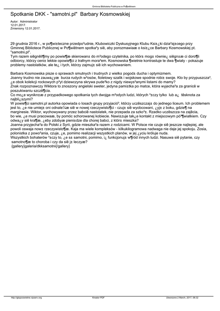 Spotkanie DKK - "samotni.pl" Barbary Kosmowskiej