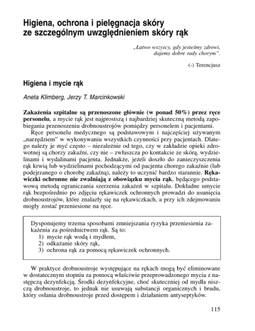 Higiena, ochrona i pielęgnacja skóry ze szczególnym uwzględnieniem skóry rąk „Łatwo wszyscy, gdy jesteśmy zdrowi, dajemy dobre rady chorym”. (-) Terencjusz Higiena i mycie rąk Aneta Klimberg, Jerzy T. Marcinkowski Zakażenia szpitalne są przenoszone głównie (w ponad 50%) przez ręce personelu, a mycie rąk jest najprostszą i najbardziej skuteczną metodą zapobiegania przenoszeniu drobnoustrojów pomiędzy personelem i pacjentami. Ręce personelu medycznego są podstawowym i najczęściej używanym „narzędziem” w wykonywaniu wszystkich czynności przy pacjentach. Dlatego należy je myć często – niezależnie od tego, czy w zakładzie opieki zdrowotnej są chorzy zakaźni, czy nie – zwłaszcza po kontakcie ze skórą, wydzielinami i wydalinami pacjenta. Jednakże, jeżeli doszło do zanieczyszczenia rąk krwią lub wydzielinami pochodzącymi od pacjenta chorego zakaźnie (lub podejrzanego o chorobę zakaźną), należy to uczynić bardzo starannie. Rękawiczki ochronne nie zwalniają z obowiązku mycia rąk, będącego podstawową metodą ograniczania szerzenia zakażeń w szpitalu. Dokładne umycie rąk bezpośrednio po zdjęciu rękawiczek ochronnych prowadzi do usunięcia drobnoustrojów, które znalazły się na rękawiczkach, a przy ich zdejmowaniu mogły zostać przeniesione na ręce. Dysponujemy trzema sposobami zmniejszania ryzyka przeniesienia zakażenia za pośrednictwem rąk. Są to: 1) mycie rąk wodą i mydłem, 2) odkażanie skóry rąk, 3) ochrona rąk za pomocą rękawiczek ochronnych. W praktyce drobnoustroje występujące na rękach mogą być eliminowane w dostatecznym stopniu za pomocą właściwie przeprowadzonego mycia z następczą dezynfekcją. Środki dezynfekcyjne, choć skuteczniej od mydła niszczą drobnoustroje, to jednak nie usuwają substancji organicznych i brudu, który osłania drobnoustroje przed dostępem i działaniem antyseptyków. 115 Na nie mytych rękach znajduje się zazwyczaj przeszło 130 różnych szczepów bakteryjnych, z których wiele może być opornych na kilka, a nawet kilkanaście antybiotyków; liczba bakterii na dłoniach personelu medycznego waha się od 3,9 · 104 do 4,6 · 106 bakterii/cm2. Występujące drobnoustroje można podzielić na florę stałą (fizjologiczną) i florę przejściową. Flora stała (fizjologiczna) – to bakterie występujące głównie w fałdach skóry i mieszkach włosowych człowieka, namnażające się głównie w gruczołach łojowych i potowych, w związku z tym są trudne do usunięcia przy zastosowaniu środków mechanicznych; są to przede wszystkim ziarniaki Gram-dodatnie (Staphylococcus sp., Micrococcus sp.) i inne drobnoustroje obecne na rękach przejściowo. Flora stała nie wykazuje właściwości chorobotwórczych, aczkolwiek u niektórych osób składnikiem flory fizjologicznej mogą być na przykład chorobotwórcze gronkowce. Szczególnego znaczenia nabierają u pracowników medycznych oporne na antybiotyki drobnoustroje, które są odpowiedzialne za groźne zakażenia, na przykład metycylinooporne szczepy Staphylococcus aureus (methycillin resistant staphylococcus aureus – MRSA) lub oporne na wankomycynę enterokoki (VRE). Flora przejściowa – to mikroorganizmy luźno związane ze skórą, które nie są zdolne do namnażania się i przebywania przez dłuższy czas na powierzchni skóry. W zakładach opieki zdrowotnej podstawowym problemem jest oczywiście flora przejściowa. U pracowników medycznych florę przejściową stanowią często mikroorganizmy chorobotwórcze odpowiedzialne za zakażenia szpitalne. Mogą być one w czasie wykonywania zabiegów przenoszone z jednego pacjenta na drugiego przez zanieczyszczone ręce, stając się często przyczyną zakażeń krzyżowych. Drobnoustroje znajdujące się na rękach personelu medycznego przenoszone są na dotykany przedmiot lub pacjenta, a jednocześnie drobnoustroje z pacjenta i innego dotykanego przedmiotu przedostają się na ręce personelu. Zakażeniom szpitalnym zapobiegać można przez zmniejszenie liczby mikroorganizmów bytujących na skórze rąk do bezpiecznego dla pacjenta poziomu. Uzyskuje się to przez: z z z z mycie rąk pod bieżącą letnią wodą z użyciem mydła płynnego, wycieranie rąk ręcznikiem jednorazowego użycia, dezynfekcję skóry rąk alkoholowym roztworem środka antyseptycznego, ochronę rąk za pomocą rękawiczek. Aby jednak powyższe zabiegi były skuteczne, należy przestrzegać dodatkowych zasad podczas pracy: z 116 nie nosić biżuterii, zegarka na ręku, z z z z z unikać skaleczeń i innych uszkodzeń skóry, skaleczenia lub chorobowe zmiany skórne zawsze zabezpieczyć nieprzesiąkliwym opatrunkiem, ewentualnie dodatkowo specjalnymi rękawiczkami, stosować rękawiczki ochronne przy wykonywaniu czynności, w czasie których możliwy jest kontakt z krwią i płynami ustrojowymi, stosować sterylne rękawiczki do czynności aseptycznych, ręce myć przed założeniem i po zdjęciu rękawiczek. Naturalną barierę ochronną skóry stanowi warstwa zrogowaciała naskórka zbudowana ze zrogowaciałych komórek, spojonych ze sobą substancją „kitującą”. Ta substancja o charakterze kitu tworzy systemy o strukturze blaszek znajdujących się w przerwach międzykomórkowych i składa się z delikatnych, dwuwarstwowych pokładów cząstek utworzonych z tłuszczów, ceramidów, cholesterolu i innych substancji. Środki myjące, a nawet zwykła woda, powodują czasowe uszkodzenie bariery ochronnej przez wymycie „lipidów barierotwórczych” i w ten sposób zostaje „otwarta droga” do głębszych warstw skóry dla substancji chemicznych mogących ją uszkodzić. Skóra ma właściwości naturalnej regeneracji, która przy niewielkich uszkodzeniach trwa kilka godzin, natomiast przy większym niedoborze substancji kitującej – kilka dni. Dlatego szczególnie istotne jest właściwe stosowanie środków pielęgnujących. Środki o właściwościach pielęgnują