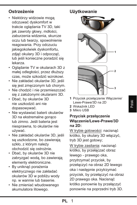 Użytkowanie • Niektórzy widzowie mogą odczuwać dyskomfort w trakcie oglądania TV 3D, taki jak zawroty głowy, mdłości, zaburzenia widzenia, skurcze oczu lub twarzy, spowolnienie reagowania. Przy odczuciu jakiegokolwiek dyskomfortu, zdjąć okulary 3D i odpocząć, lub jeśli konieczne poradzić się lekarza. • Oglądanie TV w okularach 3D z małej odległości, przez dłuższy czas, może szkodzić wzrokowi. • Nie zakładać okularów 3D, jeśli się jest zmęczonym lub chorym. • Nie chodzić i nie przemieszczać się z założonymi okularami 3D. • Dbać, by okularów 3D nie uszkodzić ani nie dopasowywać. • Nie wystawiać baterii okularów 3D na ekstremalne gorąco lub zimno. Jeśli bateria jest niesprawna, to okularów nie używać. • Nie zakładać okularów 3D, jeśli są uszkodzone, bo zawierają szkło, z którym należy obchodzić się ostrożnie. • Dbać, by okularów 3D nie zabryzgać wodą, bo zawierają elementy elektroniczne. • By uniknąć porażenia elektrycznego nie zakładać okularów 3D w pobliżu wody np. w wannie lub basenie. • Nie zmieniać wbudowanego akumulatora litowego. 1 2 3 11 Przycisk przełączenie Włączenie/ Lewe-Prawe/3D na 2D 22 Wskaźnik LED 33 Mikro USB Przycisk przełączenie Włączenie/Lewe-Prawe/3D na 2D: W trybie gotowości: nacisnąć krótko, by okulary 3D włączyć, tryb 3D jest gotowy; W trybie zasilania: nacisnąć krótko, by przełączać obraz lewego - prawego oka, przytrzymać przycisk, by przełączyć na obraz 2D lewego oka i następnie przytrzymać przycisk, by przełączyć na obraz 2D prawego oka. Nacisnąć krótko ponownie by przełączyć ponownie na poprzedni tryb 3D. PL 1 Polski Ostrzeżenie Wskaźnik LED: Przy włączeniu akumulator się ładuje; przy wyłączeniu doładowanie jest zakończone; przy migotaniu wskazuje, że zasilanie jest na wyczerpaniu. Zakres ruchu 2m 50º50º 6m Doładowywanie akumulatora 1. Podłączyć złącze Mikro USB (łączącego przewodu USB) do portu ładowania Mikro USB. 2. Podłączyć drugi koniec przewodu łączącego USB do portu USB włączonego telewizora. Środki ostrożności przy używaniu • Okulary 3D przechowywać w futerale, jeśli nie są używane. • Okulary 3D nie powinny być używane jak okulary zwykłe lub przeciwsłoneczne. Proszę nie stosować ich jak okularów zwykłych, do czytania, prowadzenia samochodu lub przeciwsłonecznych. • Na telewizor przy noszeniu okularów 3D patrzeć pod kątem 90°. • Jeśli obraz 3D jest niewyraźny, to przełączyć przełącznik Lewy - Prawy. • Podczas oglądania 3D TV stosować regularne przerwy. • Światło dużej jaskrawości (w szczególności halogenowe) może wpływać na komunikację pomiędzy okularami bezprzewodowymi a nadajnikiem IR; zalecamy dla osiągnięcia lepszego efektu 3D wyłączenie świateł w pomieszczeniu. Rozwiązywanie problemów • Okulary 3D nie działają - Akumulator jest rozładowany, proszę go doładować. - Patrzeć na telewizor pod kątem 90°. - Odległość okularów 3D od telewizora powinna być mniejsza niż 6 metrów. - Proszę sprawdzić ustawienia 3D w telewizorze. • Wskaźnik LED ciągle migocze - Akumulator jest rozładowany, proszę go doładować. * Specyfikacja i konstrukcja mogą ulec zmianie bez uprzedzenia. PL 2