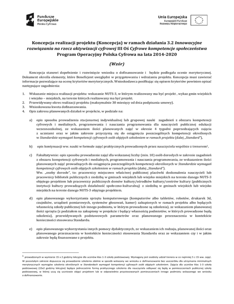 Koncepcja realizacji projektu (Koncepcja) w ramach działania 3.2 Innowacyjne rozwiązania na rzecz aktywizacji cyfrowej III Oś Cyfrowe kompetencje społeczeństwa Program Operacyjny Polska Cyfrowa na lata 2014-2020 (Wzór) Koncepcja stanowi dopełnienie i rozwinięcie wniosku o dofinansowanie i będzie podlegała ocenie merytorycznej. Dokument określa elementy, które Beneficjent uwzględni w przygotowaniu i wdrażaniu projektu. Koncepcja musi zawierać informacje pozwalające na ocenę kryteriów merytorycznych. Wnioskodawca posiłkując się opisem kryteriów powinien opisać następujące zagadnienia: 1. 2. 3. 4. 1 Wskazanie miejsca realizacji projektu: wskazanie NUTS-3, w którym realizowany ma być projekt , wykaz gmin wiejskich i wiejsko – miejskich, na terenie których realizowany ma być projekt. Przewidywany okres realizacji projektu (maksymalnie 30 miesięcy od dnia podpisania umowy). Wnioskowana kwota dofinansowania. Opis zakresu planowanych działań w projekcie, w podziale na: a) opis sposobu prowadzenia stacjonarnej indywidualnej lub grupowej nauki zagadnień z obszaru kompetencji cyfrowych i medialnych, programowania i nauczania programowania dla nauczycieli publicznej edukacji wczesnoszkolnej, ze wskazaniem ilości planowanych zajęć w okresie 4 tygodni poprzedzających zajęcia z uczniami oraz w jakim zakresie przyczynią się do osiągnięcia poszczególnych kompetencji określonych w Standardzie wymagań kompetencji cyfrowych osób objętych szkoleniem w ramach projektu (dalej „Standard”), b) opis kontynuacji ww. nauki w formule zajęć praktycznych prowadzonych przez nauczyciela wspólnie z trenerem1, c) Fakultatywnie: opis sposobu prowadzenie zajęć dla wskazanej liczby (min. 10) osób dorosłych w zakresie zagadnień z obszaru kompetencji cyfrowych i medialnych, programowania i nauczania programowania, ze wskazaniem ilości planowanych zajęć prowadzących do osiągnięcia poszczególnych kompetencji określonych w Standardzie wymagań kompetencji cyfrowych osób objętych szkoleniem w ramach projektu (dalej „Standard”). Ww. „osoby dorosłe”, to: pracownicy miejscowo właściwej publicznej placówki doskonalenia nauczycieli lub pracownicy bibliotek publicznych z siedzibą w gminach wiejskich lub wiejsko miejskich na terenie danego NUTS-3 objętego projektem lub pracownicy publicznych domów kultury/ośrodków kultury/centrów kultury (publicznych instytucji kultury prowadzących działalność społeczno-kulturalną) z siedzibą w gminach wiejskich lub wiejsko miejskich na terenie danego NUTS-3 objętego projektem. d) opis planowanego wykorzystania sprzętu komputerowego (komputerów albo tabletów, robotów, drukarek 3d, czujników, urządzeń pomiarowych, systemów głosowań, kamer) zakupionych w ramach projektu albo będących własnością szkoły publicznej lub innego podmiotu, w którym prowadzone są szkolenia), ze wskazaniem planowanej ilości sprzętu (z podziałem na zakupiony w projekcie i będący własnością podmiotów, w których prowadzone będą szkolenia), przewidywanych podstawowych parametrów oraz planowanego przeznaczenia w kontekście konieczności stosowana Standardu. e) opis planowanego wykorzystania innych pomocy dydaktycznych, ze wskazaniem ich rodzaju, planowanej ilości oraz planowanego przeznaczenia w kontekście konieczności stosowania Standardu oraz ze wskazaniem czy i w jakim zakresie będą finansowane z projektu. prowadzonych w wymiarze 15 x 2 godziny lekcyjne dla uczniów klas 1-3 szkoły podstawowej. Wymagany jest osobisty udział trenera w co najmniej 5 z 15 ww. zajęć. W pozostałym zakresie dopuszcza się prowadzenie szkolenia zdalnie w sposób wskazany we wniosku o dofinansowanie bez uszczerbku dla utrzymania minimalnych merytorycznych wymogów szkolenia określonych w Standardach wymagań kompetencji cyfrowych osób objętych szkoleniem. Zajęcia dla uczniów klas 1-3 szkoły podstawowej (15x2 godziny lekcyjne) będące jednocześnie formą praktycznego szkolenia dla nauczyciela odbywać się będą w pomieszczeniach publicznej szkoły podstawowej, w której uczą się uczniowie objęci projektem lub w odpowiednio przystosowanych pomieszczeniach innego podmiotu wskazanego we wniosku o dofinansowanie. f) w przypadku planowanego zakupu sprzętu w ramach projektu: opis sposobu uwzględnienia istniejących zasobów sprzętu informatycznego/ komputerowego, którym dysponuje szkoła publiczna lub inny podmiot biorący udział w projekcie (tj. w którym prowadzone są szkolenia), g) opis przyjętych założeń sposobu przeprowadzenia jednych obligatoryjnych, związanych tematycznie z celem projektu zajęć dla uczniów szkół publicznych poza głównym miejscem ich prowadzenia (w instytucji z obszaru nauki lub edukacji lub kultury lub w szkole wyższej), h) opis przyjętych założeń co do pozostawienia sprzętu zakupionego w projekcie, przy pomocy którego prowadzono szkolenia (w szczególności komputerów, tabletów, robotów, drukarek 3d, czujników, urządzeń pomiarowych, systemów głosowań, kamer) oraz materiałów i pomocy dydaktycznych jako wyposażenia szkoły publicznej biorącej udział w projekcie lub innej szkoły publicznej zlokalizowanej na obszarze realizacji projektu, ze wskazaniem sposobu wyboru szkół/ szkoły, w których po zakończeniu projektu pozostanie sprzęt. Opis musi uwzględniać obowiązek przekazania sprzętu w pierwszej kolejności do placówek, które nie otrzymały sprzętu komputerowego w ramach innych projektów dofinansowanych ze środków UE. Sprzętu nie wolno rozdzielać pomiędzy szkoły w ilości mniejszej niż niezbędna do prowadzenia zajęć grupy uczniów (i nauczyciela) w standardzie analogicznym jak w toku realizacji projektu. i) opis sposobu realizacji obowiązku przekazania każdemu nauczycielowi, który ukończył szkolenie 1 szt. komputera albo tabletu2 z systemem operacyjnym umożliwiającym korzystanie z oprogramowania wykorzystywanego w toku szkole