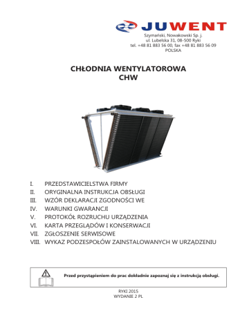 Szymański, Nowakowski Sp. j. ul. Lubelska 31, 08-500 Ryki tel. +48 81 883 56 00, fax +48 81 883 56 09 POLSKA CHŁODNIA WENTYLATOROWA CHW I. II. III. IV. V. VI. VII. VIII. PRZEDSTAWICIELSTWA FIRMY ORYGINALNA INSTRUKCJA OBSŁUGI WZÓR DEKLARACJI ZGODNOŚCI WE WARUNKI GWARANCJI PROTOKÓŁ ROZRUCHU URZĄDZENIA KARTA PRZEGLĄDÓW I KONSERWACJI ZGŁOSZENIE SERWISOWE WYKAZ PODZESPOŁÓW ZAINSTALOWANYCH W URZĄDZENIU Przed przystąpieniem do prac dokładnie zapoznaj się z instrukcją obsługi. RYKI 2015 WYDANIE 2 PL I. PRZEDSTAWICIELSTWA FIRMY Białystok GSM +48 692 478 020 e-mail: [email protected] Poznań GSM +48 692 473 053 e-mail: [email protected] Gdańsk GSM +48 692 473 056 e-mail: [email protected] Rzeszów 35-210 Rzeszów, ul. Baczyńskiego 1 Tel. +48 17 853 50 09 Fax +48 17 853 50 09 GSM +48 660 771 537 e-mail: [email protected] Kielce GSM +48 606 618 860 e-mail: [email protected] Kraków 30-207 Kraków ul. Malczewskiego 47A lok.9 Tel. +48 12 655 90 63 Fax +48 12 655 97 50 GSM +48 664 197 142 e-mail: [email protected] Lublin GSM +48 692 476 090 e-mail: [email protected] Łódź 93-486 Łódź, ul. Zamojska 16 Tel. +48 42 682 70 55 Fax +48 42 682 70 56 GSM +48 600 438 028 e-mail: [email protected] Olsztyn GSM +48 606 908 820 e-mail: [email protected] 2 www.juwent.com.pl Szczecin GSM +48 608 539 432 e-mail: [email protected] Śląsk 41-200 Sosnowiec ul. Narutowicza 50 Tel. +48 32 293 54 47 Fax +48 32 293 54 47 GSM +48 604 978 536 e-mail: [email protected] Warszawa GSM +48 600 998 676 GSM +48 602 195 709 e-mail: [email protected] Wrocław 50-542 Wrocław ul. Żegiestowska 11 Tel. +48 71 787 21 60 Fax +48 71 787 21 61 GSM +48 601 974 999 GSM +48 601 671 566 e-mail: [email protected] II. ORYGINALNA INSTRUKCJA OBSŁUGI CHŁODNIE WENTYLATOROWE CHW wielkość 1÷3 www.juwent.com.pl 3 1. PRZEZNACZENIE 4 SPIS TREŚCI 5 2. OZNACZENIA 5 3. OPIS URZĄDZENIA 5 4. DANE TECHNICZNE 6 5. TRANSPORT 8 6. ZALECENIA BEZPIECZEŃSTWA 8 7. MONTAŻ 9 8. INSTALACJA WODNA 10 9. INSTALACJA ELEKTRYCZNA 11 10. ELEMENTY AUTOMATYKI 12 11. URUCHOMIENIE URZĄDZENIA 15 12. NAPRAWA, KONSERWACJA I WYCOFANIE Z EKSPLOATACJI 15 13. USUWANIE NIESPRAWNOŚCI 16 14. INFORMACJE 16 www.juwent.com.pl 1. PRZEZNACZENIE Chłodnie wentylatorowe przeznaczone są do chłodzenia cieczy powietrzem zewnętrznym. Chłodnie wentylatorowe są przystosowane do umieszczenia na zewnątrz obiektu. W chłodniach wentylatorowych mogą być chłodzone ciecze o temperaturach na wejściu wyższych o ~15OC od temperatury powietrza otaczającego oraz temperaturach na wyjściu nie mniejszych od temperatury zamarzania. 2. OZNACZENIA Chłodnia wentylatorowa Wielkość CHW-1 -3w -II 1; 2; 3 Ilość wentylatorów Ilość rzędów nagrzewnicy wielkość 1 - 1w; 2w; 3w; 4w; 6w wielkość 2 - 4w; 6w wielkość 3 - 4w; 6w wielkość 1 II lub III wielkość 2 III wielkość 3 III 3. OPIS URZĄDZENIA Typoszereg chłodni zawiera 3 wielkości, w każdej po kilka wentylatorów w jednym lub dwóch rzędach. Chłodnia wentylatorowa składa się z: »» wymienników ciepła umieszczonych od strony ssącej wentylatorów w układzie V (1); »» wentylatorów osiowych (2); »» obudowy (3). W większych chłodniach jest przewidziane stopniowe wyłączanie wentylatorów dla przystosowania chłodni do sezonowej pracy w warunkach lata lub jesieni. Dla bieżącego utrzymania stałej temperatury ochłodzonej cieczy służy układ automatycznej regulacji powodujący zmianę prędkości obrotowej wentylatorów. Układ składa się z czujników temperatury i regulatora. W chłodni umieszczony jest również wyłącznik obsługowy zapobiegający włączeniu napięcia w czasie czynności konserwacyjnych. Chłodnie wentylatorowe umieszczane są na zewnątrz budynków i nie wymagają stosowania dodatkowych zabezpieczeń w postaci daszków ochronnych. Silniki wentylatorów w standardowym wykonaniu są trójfazowe. W porozumieniu z producentem chłodnie mogą być dostarczone z silnikami jednofazowymi. Dopuszczalne temperatury pracy wynoszą: - 65OC - temperatura pracy wentylatorów; - 105OC - czujniki temperatury cieczy chłodzonej; - 60OC - temperatura cieczy odpływającej dla układu automatycznej regulacji; - 150OC i ciśnienie 1,5 Mpa dla wymienników lamelowych. www.juwent.com.pl 5 4. DANE TECHNICZNE Wielkość CHW-1 CHW-2 CHW-3 Wydajność powietrza Ilość wentylatorów 1 2 3 4 6 4 6 4 6 Wydajność powietrza [m3/h] 4200 8400 12600 16800 25200 26800 40200 46000 69000 L[mm] 840 1440 2040 1440 2040 1680 2400 2160 3120 H[mm] 884 865 865 1440 1440 1652 1652 2124 2124 A[mm] 825 830 830 1367 1367 1848 1848 1953 1953 B[mm] 478 470 470 600 600 925 925 702 702 D=D1 (II rzędy) 1” 1” 1” - - - - - - D=D2 (III rzędy) 1¼” 1¼” 1¼” 2” 2” 2” 2” 2½ 2½ 69 117 171 - - - - - - 81 138 203 273 375 418 589 641 912 Masa [kg] (II rzędy) Masa [kg] (III rzędy) Obroty [obr/min] Wymiary Parametry pojedynczego wentylatora (połączenie w ) 1350 870 Napięcie [V] 400 400 400 Moc silnika [kW] 0,32 0,37 0,72 0,63 0,70 Prąd [A] Obroty [obr/min] Parametry pojedynczego wentylatora (połączenie w 870 1,4 ) 1050 670 Napięcie [V] 400 400 650 400 Moc silnika [kW] 0,23 0,25 0,47 Prąd [A] 0,36 0,42 0,79 Głośność pracy Głośność [dB(A)] 51 54 56 57 59 55 57 66 68 Głośność pracy poziom ciśnienia akustycznego z odległości 5m w swobodnym polu dźwiękowym przy współczynniku kierunkowym Q=2. 6 www.juwent.com.pl 5. TRANSPORT Transport chłodni wentylatorowych powinien odbywać się w ich pozycji pracy. Dla podwieszenia do transportu pionowego służą dwa otwory w podstawie o średnicy D=40mm. W czasie składowania i transportu chłodnie powinny być zabezpieczone z zewnątrz folią na przykład polietylenową. Z chłodnią dostarczana jest Książka Wyrobu. Elementy automatyki dostarczane są osobno na życzenie zamawiającego. 6. ZALECENIA BEZPIECZEŃSTWA Uruchomienie i montaż chłodni powinny być wykonane przez uprawnionego instalatora. Wszystkie prace montażowe i naprawcz