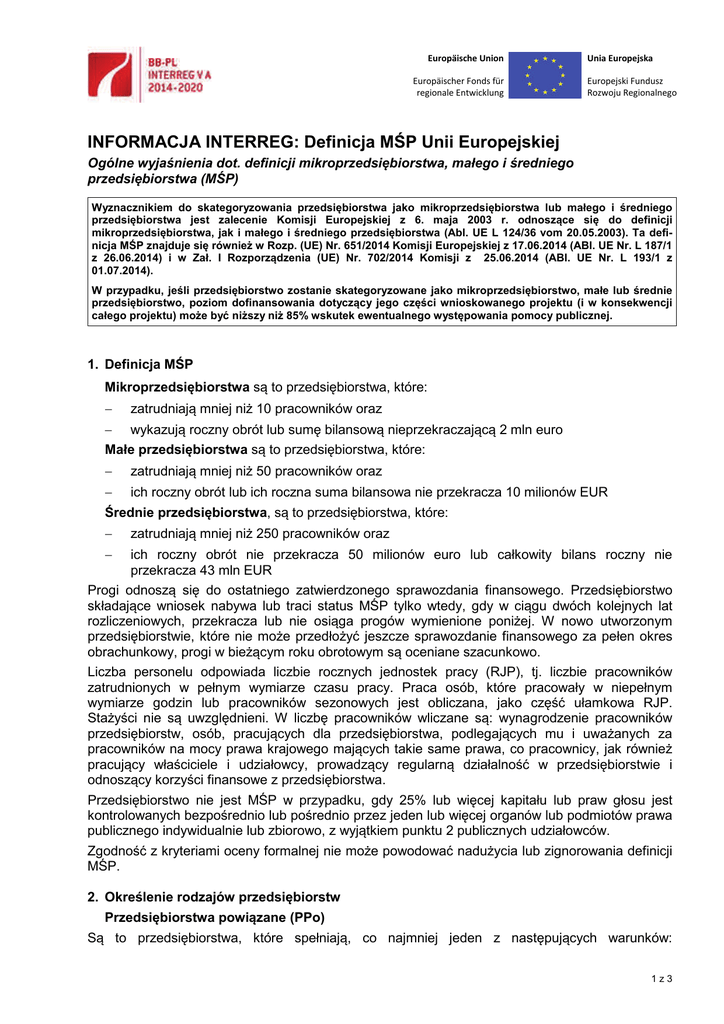 INFORMACJA INTERREG: Definicja MŚP Unii Europejskiej