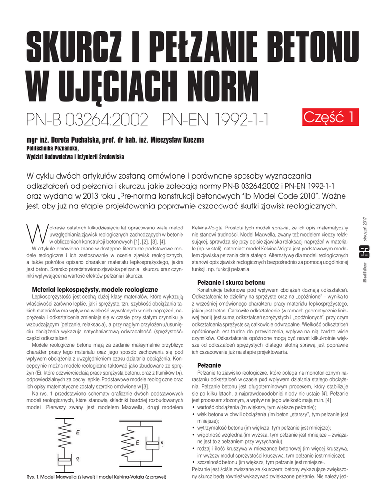 SKURCZ I PEŁZANIE BETONU W UJĘCIACH NORM PN-B 03264:2002 PN-EN 1992-1-1 Część 1 mgr inż. Dorota Puchalska, prof. dr hab. inż. Mieczysław Kuczma Politechnika Poznańska, Wydział Budownictwa i Inżynierii Środowiska Materiał lepkosprężysty, modele reologiczne Lepkosprężystość jest cechą dużej klasy materiałów, które wykazują właściwości zarówno lepkie, jak i sprężyste, tzn. szybkość obciążania takich materiałów ma wpływ na wielkość wywołanych w nich naprężeń, naprężenia i odkształcenia zmieniają się w czasie przy stałym czynniku je wzbudzającym (pełzanie, relaksacja), a przy nagłym przyłożeniu/usunięciu obciążenia wykazują natychmiastową odwracalność (sprężystość) części odkształceń. Modele reologiczne betonu mają za zadanie maksymalnie przybliżyć charakter pracy tego materiału oraz jego sposób zachowania się pod wpływem obciążenia z uwzględnieniem czasu działania obciążenia. Koncepcyjnie można modele reologiczne taktować jako zbudowane ze sprężyn (E), które odzwierciedlają pracę sprężystą betonu, oraz z tłumików ( η), odpowiedzialnych za cechy lepkie. Podstawowe modele reologiczne oraz ich opisy matematyczne zostały szeroko omówione w [3]. Na rys. 1 przedstawiono schematy graficznie dwóch podstawowych modeli reologicznych, które stanowią składniki bardziej rozbudowanych modeli. Pierwszy zwany jest modelem Maxwella, drugi modelem Rys. 1. Model Maxwella (z lewej) i model Kelvina-Voigta (z prawej) Pełzanie i skurcz betonu Konstrukcje betonowe pod wpływem obciążeń doznają odkształceń. Odkształcenia te dzielimy na sprężyste oraz na „opóźnione” – wynika to z wcześniej omówionego charakteru pracy materiału lepkosprężystego, jakim jest beton. Całkowite odkształcenie (w ramach geometrycznie liniowej teorii) jest sumą odkształceń sprężystych i „opóźnionych”, przy czym odkształcenia sprężyste są całkowicie odwracalne. Wielkość odkształceń opóźnionych jest trudna do przewidzenia, wpływa na nią bardzo wiele czynników. Odkształcenia opóźnione mogą być nawet kilkukrotnie większe od odkształceń sprężystych, dlatego istotną sprawą jest poprawne ich oszacowanie już na etapie projektowania. Pełzanie Pełzanie to zjawisko reologiczne, które polega na monotonicznym narastaniu odkształceń w czasie pod wpływem działania stałego obciążenia. Pełzanie betonu jest długoterminowym procesem, który stabilizuje się po kilku latach, a najprawdopodobniej nigdy nie ustaje [4]. Pełzanie jest procesem złożonym, a wpływ na jego wielkość mają m.in. [4]: • wartość obciążenia (im większe, tym większe pełzanie); • wiek betonu w chwili obciążenia (im beton „starszy”, tym pełzanie jest mniejsze); • wytrzymałość betonu (im większa, tym pełzanie jest mniejsze); • wilgotność względna (im wyższa, tym pełzanie jest mniejsze – związane jest to z pełzaniem przy wysychaniu); • rodzaj i ilość kruszywa w mieszance betonowej (im więcej kruszywa, im wyższy moduł sprężystości kruszywa, tym pełzanie jest mniejsze); • szczelność betonu (im większa, tym pełzanie jest mniejsze). Pełzanie jest ściśle związane ze skurczem; betony wykazujące zwiększony skurcz będą również wykazywać zwiększone pełzanie. Nie należy jed- 69 Kelvina-Voigta. Prostota tych modeli sprawia, że ich opis matematyczny nie stanowi trudności. Model Maxwella, zwany też modelem cieczy relaksującej, sprawdza się przy opisie zjawiska relaksacji naprężeń w materiale (np. w stali), natomiast model Kelvina-Voigta jest podstawowym modelem zjawiska pełzania ciała stałego. Alternatywę dla modeli reologicznych stanowi opis zjawisk reologicznych bezpośrednio za pomocą uogólnionej funkcji, np. funkcji pełzania. Builder W okresie ostatnich kilkudziesięciu lat opracowano wiele metod uwzględniania zjawisk reologicznych zachodzących w betonie w obliczeniach konstrukcji betonowych [1], [2], [3], [4]. W artykule omówiono znane w dostępnej literaturze podstawowe modele reologiczne i ich zastosowanie w ocenie zjawisk reologicznych, a także pokrótce opisano charakter materiału lepkosprężystego, jakim jest beton. Szeroko przedstawiono zjawiska pełzania i skurczu oraz czynniki wpływające na wartość efektów pełzania i skurczu. styczeń 2017 W cyklu dwóch artykułów zostaną omówione i porównane sposoby wyznaczania odkształceń od pełzania i skurczu, jakie zalecają normy PN-B 03264:2002 i PN-EN 1992-1-1 oraz wydana w 2013 roku „Pre-norma konstrukcji betonowych fib Model Code 2010”. Ważne jest, aby już na etapie projektowania poprawnie oszacować skutki zjawisk reologicznych. NAUKA I BUDOWNICTWO nak wysuwać błędnego wniosku, jakoby zjawiska te miały wspólną przyczynę [4]. Na rys. 2 przedstawiono (wg [3], [4]) zależność w funkcji czasu odkształcenia wywołanego pełzaniem przy stałym obciążeniu, a następnie po usunięciu obciążenia w chwili t0. Wykres zaczyna się w chwili przyłożenia obciążenia. Przy natychmiastowym odciążeniu jest wyraźnie widoczne zmniejszenie odkształceń o wartość w przybliżeniu równą odkształceniom sprężystym. Rys. 2. Wykres pełzania przy stałym obciążeniu i pełzania odwrotnego po zdjęciu obciążenia (3, 4) styczeń 2017 Skurcz 70 Ec,eff = Ecm 1+Φ(t,t0) (2) gdzie: Ec,eff – efektywny moduł sprężystości betonu, Ecm – średnia wartość siecznego modułu sprężystości betonu, Φ(t,t0) – współczynnik pełzania. Uwzględnienie efektów skurczu w procesie projektowania polega na sprawdzeniu warunku minimalnego przekroju zbrojenia przypowierzchniowego ograniczającego rysy powstałe w wyniku skurczu. Dokładny opis zjawiska oraz metody wyznaczania naprężeń własnych skurczowych i niezbędnego zbrojenia przypowierzchniowego zamieszczono w pracy [1]. Pełzanie Rys. 3. Wykres odkształceń wywołanych skurczem próbki nieobciążonej (na podstawi