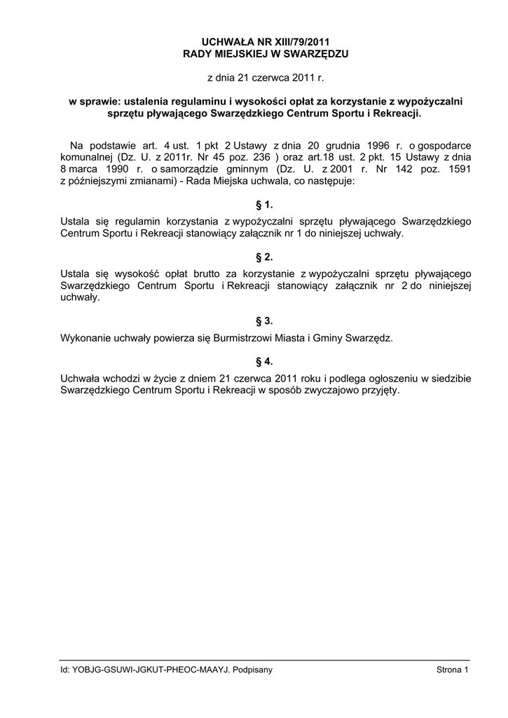 UCHWAŁA NR XIII/79/2011 RADY MIEJSKIEJ W SWARZĘDZU z dnia 21 czerwca 2011 r. w sprawie: ustalenia regulaminu i wysokości opłat za korzystanie z wypożyczalni sprzętu pływającego Swarzędzkiego Centrum Sportu i Rekreacji. Na podstawie art. 4 ust. 1 pkt 2 Ustawy z dnia 20 grudnia 1996 r. o gospodarce komunalnej (Dz. U. z 2011r. Nr 45 poz. 236 ) oraz art.18 ust. 2 pkt. 15 Ustawy z dnia 8 marca 1990 r. o samorządzie gminnym (Dz. U. z 2001 r. Nr 142 poz. 1591 z późniejszymi zmianami) - Rada Miejska uchwala, co następuje: § 1. Ustala się regulamin korzystania z wypożyczalni sprzętu pływającego Swarzędzkiego Centrum Sportu i Rekreacji stanowiący załącznik nr 1 do niniejszej uchwały. § 2. Ustala się wysokość opłat brutto za korzystanie z wypożyczalni sprzętu pływającego Swarzędzkiego Centrum Sportu i Rekreacji stanowiący załącznik nr 2 do niniejszej uchwały. § 3. Wykonanie uchwały powierza się Burmistrzowi Miasta i Gminy Swarzędz. § 4. Uchwała wchodzi w życie z dniem 21 czerwca 2011 roku i podlega ogłoszeniu w siedzibie Swarzędzkiego Centrum Sportu i Rekreacji w sposób zwyczajowo przyjęty. Id: YOBJG-GSUWI-JGKUT-PHEOC-MAAYJ. Podpisany Strona 1 Uzasadnienie do Uchwały Nr XIII/79/2011 Rady Miejskiej w Swarzędzu z dnia 21 czerwca 2011 r. W trakcie realizacji bieżących zadań Swarzędzkiego Centrum Sportu i Rekreacji stwierdzono, że zachodzi potrzeba rozszerzenia dotychczasowego zakresu świadczonych usług sportowo - rekreacyjnych o wypożyczalnię sprzętu pływającego. Rozszerzenie zakresu usług pozwoli w pełni zaspokoić potrzeby mieszkańców w tym zakresie, jak i zwiekszy dochody budżetowe. Id: YOBJG-GSUWI-JGKUT-PHEOC-MAAYJ. Podpisany Strona 1 Załącznik Nr 1 do Uchwały Nr XIII/79/2011 Rady Miejskiej w Swarzędzu z dnia 21 czerwca 2011 r. Regulamin wypożyczalni sprzętu pływającego Swarzędzkiego Centrum Sportu i Rekreacji 1. Wypożyczalnia jest obiektem Miasta i Gminy Swarzędz. 2. Wypożyczalnia jest czynna w sezonie letnim, codziennie od 10.00 do 19.00. 3. Do dyspozycji Wypożyczających udostępnia się: • Kajaki • Rowery wodne • Łódź wiosłową • Kapoki bezpieczeństwa • Wiosła 4. Opłaty za korzystanie ze sprzętu pływającego pobiera Bosman zgodnie z obowiązującym cennikiem. 5. Sprzęt pływający wypożyczać mogą wyłącznie osoby pełnoletnie po przedłożeniu Bosmanowi przystani dowodu osobistego, podpisaniu oświadczenia o odpowiedzialności cywilnej i materialnej za pasażerów i sprzęt pływający oraz uiszczeniu opłaty. 6. Liczebność załogi na jednostce pływającej ustala bosman wypożyczalni na podstawie instrukcji eksploatacji sprzętu oraz zasad bezpieczeństwa. 7. Wypożyczający i pasażerowie podczas korzystania z wypożyczonego sprzętu pływającego mają obowiązek założenia kamizelek ratunkowych oraz przestrzegania wszystkich zasad bezpieczeństwa zachowania się na wodzie. 8. Użytkownikom sprzętu zabrania się: • Siadania na burtach. • Skakania ze sprzętu do wody i pływania wpław. • Zamieniania się miejscami podczas pływania. • Wędkowania. • Wpływania za wyspę i cumowania w miejscach niedozwolonych. • Zachowania w sposób zagrażający bezpieczeństwu własnemu i pasażerów. • Odstępowania sprzętu pływającego osobom trzecim. • Picia alkoholu i używania innych środków odurzających. • Niszczenia sprzętu i wykorzystywania go nie zgodnie z przeznaczeniem. • Zaśmiecania akwenu. 9. Użytkownik sprzętu zobowiązany jest do: Id: YOBJG-GSUWI-JGKUT-PHEOC-MAAYJ. Podpisany Strona 1 • Przestrzegania obowiązujących przepisów bezpieczeństwa. • Stosowania się do poleceń Bosmana i reagowania na sygnał natychmiastowego powrotu do przystani (sygnał dźwiękowy, tuba, czerwona flaga). • Zaniechania pływania w przypadku stwierdzenia uszkodzenia sprzętu w stopniu zagrażającym bezpieczeństwu własnemu i pasażerów. • Opieki nad sprzętem przez cały okres użytkowania i zwrotu go w takim stanie jakim został pobrany z przystani. 10. Za zniszczenie, uszkodzenie, zgubienie, kradzież sprzętu Wypożyczający zobowiązany jest zwrócić jego równowartość w wysokości 100% ceny rynkowej w chwili zgłoszenia bez względu na stopień amortyzacji. 11. Za sprzęt nie zwrócony w terminie Bosman ma prawo pobrać dodatkowa opłatę w wysokości 100% dziennej należności za wypożyczenie 12. Wypożyczalnia nie ponosi żadnej odpowiedzialności za zachowanie się uczestników na wodzie, a w szczególności za szkody jakich mogli dokonać na rzecz innych osób. 13. Wypożyczalnia nie ponosi żadnej odpowiedzialności z tytułu nieszczęśliwych wypadków Wypożyczających sprzęt i jego pasażerów 14. W sprawach nieuregulowanych postanowieniami niniejszego regulaminu będą mieć zastosowanie przepisy kodeksu cywilnego. Wypożyczalnia sprzętu wodnego Swarzędzkiego Centrum Sportu i Rekreacji Imię ........................................................................................... Nazwisko ................................................................................... Adres .......................................................................................... Data wypożyczenia ..................................................................... Telefon ......................................................................................... Seria i nr dowodu osobistego........................................................ OŚWIADCZAM że : Posiadam umiejętności pływania. Nie jestem pod wpływem alkoholu i innych środków odurzających, oraz żadna z osób korzystających ze mną ze sprzętu wodnego podczas wynajmu. Odebrałem/am sprzęt (nazwa) ………………………………… Odebrałem/am kapoki w ilości.................................................... Odebrałem/am wiosła w ilości.................................................... Id: YOBJG-GSUWI-JGKUT-PHEOC-MAAYJ. Podpisany Strona 2 Ze sprzętu wodnego korzyst