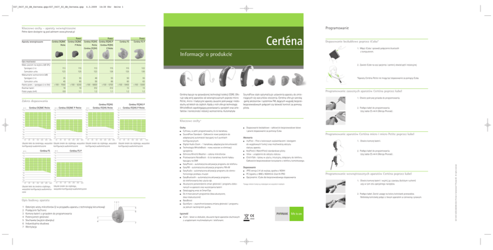 027_0437_02_GB_Certena.qxp:027_0437_02_GB_Certena.qxp 4.3.2009 14:30 Uhr Seite 1 Kluczowe cechy - aparaty wewnątrzuszne Programowanie Pełne dane dostępne są pod adresem www.phonak.pl Certéna CIC/MC Petite Power Certéna CIC/MC P Petite Power Certéna ITC/HS Certéna ITC/HS P Petite Certéna ITC/HS Certéna ITC/HS P Petite Power Certéna FS P Certéna FS Dopasowanie bezkablowe poprzez iCuba* 1. Włącz iCuba i sprawdź połączenie bluetooth z komputerem. Informacje o produkcie Opis możliwości Maks. poziom na wyjściu (dB SPL) Sprzegacz 2 cc Symulator ucha Maksymalne wzmocnienie (dB) Sprzęgacz 2 cc Symulator ucha Pasmo przen. – sprzęgacz 2 cc (Hz) Rozmiar bateri Pobór prądu (mA) 2. Zawieś iCube na szyi pacjenta i zamknij obwód pętli indukcyjnej 113 123 115 125 113 123 115 126 115 125 122 130 35 45 <100 – 7000 10 0.9 55 65 <100 – 6200 10 1.1 48 59 <100 – 6600 312 1.2 55 66 <100 – 6700 312 1.1 50 60 <100 – 6400 13 1.2 55 63 <100 – 5500 13 1.2 *Aparaty Certéna Petite nie mogą być dopasowanie za pomącą iCuba. Programowanie zausznych aparatów Certéna poprzez kabel Certéna bazuje na sprawdzonej technologii kolekcji CORE. Oferuje całą serię aparatów od wewnątrzusznych poprzez micro Petite, micro i tradycyjne aparaty zauszne pokrywając niedosłuchy od lekkich do ciężkich. Każdy z nich oferuje technologię WhistleBlock zapobiegającą powstawaniu sprzężeń oraz artefaktów i konieczności redukcji wzmocnienia. Automatyka Zakres dopasowania dB HL Certéna CIC/MC Petite 0 dB HL Certéna CIC/MC P Petite dB HL 0 Certéna ITC/HS Certéna ITC/HS Petite dB HL 0 0 10 10 10 10 20 20 20 20 30 30 30 30 40 40 40 40 50 50 50 50 60 60 60 60 70 70 70 70 80 80 80 80 90 90 90 90 100 100 100 100 110 110 110 110 125 250 500 1000 2000 4000 8000 125 250 500 1000 2000 4000 8000 125 Certéna ITC/HS P Certéna ITC/HS P Petite 250 500 1000 2000 4000 8000 125 Certéna FS 250 500 1000 2000 Certéna FS P dB HL 0 0 10 10 20 20 30 30 40 40 50 50 60 60 70 70 80 80 90 90 100 100 110 110 125 250 500 1000 2000 4000 8000 125 250 500 1000 2000 4000 8000 Ubytek lekki do średnio-ciężkiego, Ubytek średni do ciężkiego, wszystkie konfiguracje audiometry- wszystkie konfiguracje audiometryczne czne Opis budowy aparatu 1 2 3 4 5 6 7 Osłonięte wloty mikrofonów (2 w przypadku aparatu z technologią kierunkową) Przełącznik TacTronic Komora baterii z gniazdem do programowania Potencjometr głośności 3 Słuchawka (wyjście dźwięku) 4 Indywidualna obudowa Wentylacja 1. Otwórz pokrywę gniazda do programowania. 2. Podłącz kabel do programowania. Użyj kabla CS-44 A (Wersja Phonak) . Kluczowe cechy* 4000 8000 Ubytek lekki do średniego, wszystkie Ubytek średni do ciężkiego, wszystkie Ubytek średni do ciężkiego, wszystkie Ubytek średni do ciężkiego, wszystkie konfiguracje audometryczne konfiguracje audiometryczne konfiguracje audiometryczne konfiguracje audiometryczne dB HL SoundFlow stale optymalizuje ustawienia aparatu do zmieniających się warunków otoczenia. Certéna oferuje szeroką gamę akcesoriów i systemów FM, dających wygodę bezprzebezprzewodowych połączeń czy łatwość kontroli za pomocą pilota. 1 21 5 6 7 Cechy Cyfrowy, w pełni programowalny, 6-cio kanałowy. SoundFlow Standard - Całkowicie nowe podejście do adaptacyjnej automatyki bazującej na 5 punktach konfiguracyjnych. Digital Audio Zoom - 1 kanałowa, adaptacyjna kierunkowość Technologia WhistleBlock - nowy wzorzec w eliminacji sprzężenia Ochrona Wind & Weather – osłona mikrofonów Przetwarzanie NoiseBlock - 6 cio kanałowy tłumik hałasu bazujący na SNR EasyPhone – automatyczna aktywacja programu do telefonu EasyFM – automatyczna aktywacja programu FM+M EasyAudio - automatyczna aktywacja programu do stereofonicznego przekazu muzyki EasyBluetooth – automatyczna aktywacja programu do telefonowania bez użycia rąk. Akustyczne potwierdzenie zmian głośności i programu dokonanych w aparacie oraz wyczerpania baterii DataLogging wraz ze SmartTips Do 4 manulanych programów (dwa akustyczne, dwa nieakustyczne) BassBoost QuickSync – zsysnchronizowana zmiana głośności i programu za jednym naciśnięciem guzika Łączność iCom - łatwe w obsłudze, obuuszne łącze aparatów słuchowych z urządzeniami multimedialnymi i telefonami. Dopasowanie bezkablowe - całkowicie bezprzewodowe łatwe i pewne dopasowanie za pomocą iCuba Akcesoria myPilot – Pilot z kolorowym wyświetlaczem i dostępem do wyjątkowych funkcji oraz możliwością odczytu statusu aparatu KeyPilot2 / WatchPilot2 standardowe piloty iView - urządzenie do odczytu statusu Click’nTalk - Łatwy w użyciu, intuicyjny, dołączany do telefonu. Całkowicie bezprzewodowe korzystanie z telefonu komórkowego. Dopasowanie iPFG wersja 2.4 lub wyższa, zgodna z NOAH PC (zgodny z IBM) z NOAHlink i/lub HI-PRO Opcjonalnie: iCube dla bezprzewodowego dopasowania *Uwaga niektóre funkcje są niedostępne we wszystkich modelach. Programowanie aparatów Certéna micro i micro Petite poprzez kabel 1. Otwórz komorę baterii. 2. Podłącz kabel do programowania. Użyj kabla CS-44 A (Wersja Phonak) . Programowanie wewnątrzusznych aparatów Certéna poprzez kabel 1. Otwórz komorę baterii i wyjmij ją z zawiasu (kolistym ruchem) użyj w tym celu specjalnego narzędzia. 2. Podłącz kabel. Zwróć uwagę na kolory końcówek przewodów. Niebieską końcówkę połącz z lewym aparatem a czerwoną z prawym. 027-0437-02/V2.00/2009-03/rz Printed in Switzerland © Phonak AG All rights reserved Aparaty wewnątrzuszne Seite 2 124/125 129/131 128/125 135/131 135/130 140/138 136/131 141/139 46/52 58/60 <100 – 7600 10/312 1.0 53/55 61/63 <100 – 7100 13 1.3 58/53 61/58 <100 – 6800 13 1.1 68/63 71/68 <100 - 6100 13 1.2 75/70 80/75 <100 - 6000 13 1.2 6 7 0 Certéna micro dB HL 0 10 10 Certéna CIC/MC Petite Certéna CIC/MC P Petite O O S S Potencjometr Przełącznik TacTronic EasyPhone Cewka telefoniczna SmartGuard 50 70 70 70 80 80 80 Roż