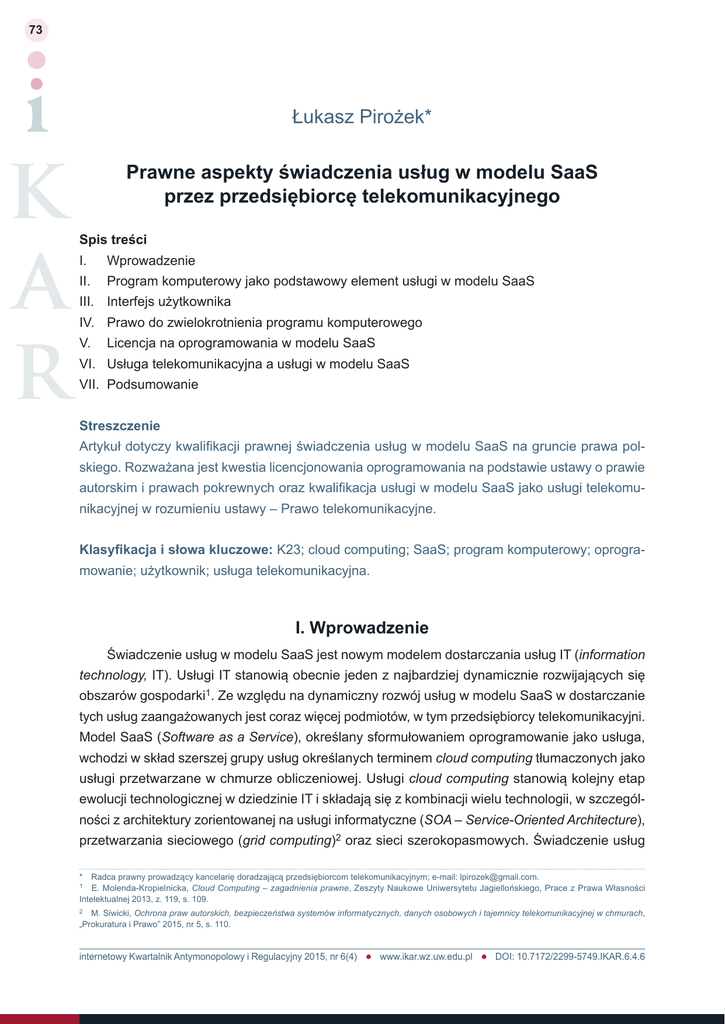 73 Łukasz Pirożek* Prawne aspekty świadczenia usług w modelu SaaS przez przedsiębiorcę telekomunikacyjnego Spis treści I. Wprowadzenie II. Program komputerowy jako podstawowy element usługi w modelu SaaS III. Interfejs użytkownika IV. Prawo do zwielokrotnienia programu komputerowego V. Licencja na oprogramowania w modelu SaaS VI. Usługa telekomunikacyjna a usługi w modelu SaaS VII. Podsumowanie Streszczenie Artykuł dotyczy kwalifikacji prawnej świadczenia usług w modelu SaaS na gruncie prawa polskiego. Rozważana jest kwestia licencjonowania oprogramowania na podstawie ustawy o prawie autorskim i prawach pokrewnych oraz kwalifikacja usługi w modelu SaaS jako usługi telekomunikacyjnej w rozumieniu ustawy – Prawo telekomunikacyjne. Klasyfikacja i słowa kluczowe: K23; cloud computing; SaaS; program komputerowy; oprogramowanie; użytkownik; usługa telekomunikacyjna. I. Wprowadzenie Świadczenie usług w modelu SaaS jest nowym modelem dostarczania usług IT (information technology, IT). Usługi IT stanowią obecnie jeden z najbardziej dynamicznie rozwijających się obszarów gospodarki1. Ze względu na dynamiczny rozwój usług w modelu SaaS w dostarczanie tych usług zaangażowanych jest coraz więcej podmiotów, w tym przedsiębiorcy telekomunikacyjni. Model SaaS (Software as a Service), określany sformułowaniem oprogramowanie jako usługa, wchodzi w skład szerszej grupy usług określanych terminem cloud computing tłumaczonych jako usługi przetwarzane w chmurze obliczeniowej. Usługi cloud computing stanowią kolejny etap ewolucji technologicznej w dziedzinie IT i składają się z kombinacji wielu technologii, w szczególności z architektury zorientowanej na usługi informatyczne (SOA – Service-Oriented Architecture), przetwarzania sieciowego (grid computing)2 oraz sieci szerokopasmowych. Świadczenie usług * Radca prawny prowadzący kancelarię doradzającą przedsiębiorcom telekomunikacyjnym; e-mail: [email protected]. E. Molenda-Kropielnicka, Cloud Computing – zagadnienia prawne, Zeszyty Naukowe Uniwersytetu Jagiellońskiego, Prace z Prawa Własności Intelektualnej 2013, z. 119, s. 109. 1 2 M. Siwicki, Ochrona praw autorskich, bezpieczeństwa systemów informatycznych, danych osobowych i tajemnicy telekomunikacyjnej w chmurach, „Prokuratura i Prawo” 2015, nr 5, s. 110. internetowy Kwartalnik Antymonopolowy i Regulacyjny 2015, nr 6(4) www.ikar.wz.uw.edu.pl DOI: 10.7172/2299-5749.IKAR.6.4.6 74 Łukasz Pirożek Prawne aspekty świadczenia usług w modelu SaaS przez przedsiębiorcę telekomunikacyjnego cloud computing jest możliwe dzięki ewolucji dostawców ISP (Internet Service Providers) w stronę dostawców ASP (Aplication Service Providers), którzy dostarczają oprogramowanie bezpośrednio do użytkowników oraz dzięki rozwojowi infrastruktury, w szczególności: rozwojowi sieci szerokopasmowych oraz centrów przetwarzania danych3. Z technologicznego punktu widzenia, doniosłe znaczenie mają takie cechy usługi cloud computing, jak wirtualizacja, skalowalność, wielodzierżawa, dostęp na żądanie oraz model opłat na zasadzie pay-as-you-go4. Wirtualizacja to technologia umożliwiająca uruchomienie oprogramowania nie na konkretnym, ale na wirtualnym serwerze. Skalowalność to zdolność do obsługi zwiększonej ilości ruchu zainicjowanego przez użytkowników korzystających z usługi. Natomiast wielodzierżawa pozwala na wykorzystanie jednej instancji oprogramowania jednocześnie poprzez uruchomienie jej przez wielu użytkowników w tym samym czasie. Dostęp na żądanie oraz zasada pay-as-you-go wiąże się z elastyczną możliwością zamawiania przez użytkownika zasobów, jakich w danym czasie potrzebuje oraz zapłatą wyłącznie za rzeczywiście używane zasoby5. Definicja usług cloud computing nie jest możliwa do jednoznacznego określenia ze względu na wielość modeli dostarczania tej usługi. W ogólnej definicji cloud computing wskazuje się, iż jest to świadczenie usług przetwarzania danych za pośrednictwem Internetu6. Przyjmuje się, że cloud computing to model udostępniania użytkownikom przez usługodawcę zasobów informatycznych, tj.: oprogramowania, infrastruktury lub platform rozwoju aplikacji, które znajdują się na serwerach dostawcy. Użytkownik korzysta z udostępnianych zasobów zlokalizowanych w odległych centrach przetwarzania danych poprzez sieć Internet oraz za pomocą swojego urządzenia (np. komputer osobisty, ipad, iphone). Wystarczającym narzędziem do korzystania z usług cloud computing po stronie urządzenia użytkownika jest przeglądarka internetowa WWW lub dedykowany program interfejsu7. Usługi cloud computing dzieli się na trzy podstawowe warianty świadczenia, tj.: model SaaS, model PaaS (Platform as a Service) oraz model IaaS (Infrastracture as a Service). Oprócz powyższych modeli, wyróżniane są również dodatkowe, w szczególności: DaaS (Data as a Service), CaaS (Communication as a Service) czy Software Kernel8. Model SaaS, czyli oprogramowanie jako usługa, jak wskazuje nazwa, to świadczenie usług udostępniania oprogramowania (aplikacji, programu komputerowego) przez dostawcę na rzecz użytkownika za pomocą przeglądarki lub interfejsu oprogramowania poprzez sieć teleinformatyczną. W modelu PaaS, czyli platforma jako usługa, następuje udostępnianie przez dostawcę środowiska do tworzenia i rozwoju oprogramowania przez użytkownika. Natomiast, model IaaS, czyli infrastruktura jako usługa, polega na udostępnianiu przez dostawcę użytkownikowi samej infrastruktury informatycznej (hardware). Wśród dodatkowych modeli DaaS jest usługą związaną z przechowywaniem danych i udostępnianiem ich użytkownikom; CaaS to usługa zapewniająca optymalizację pracy oprogramowania poprzez kontrolę środowiska ich działania i procesu translacji kodu, a usługa Software Kernel, tj. jądro oprogramowania, umożliwia centralne zarządzanie środowiskiem chmury9. 3 E. Mole