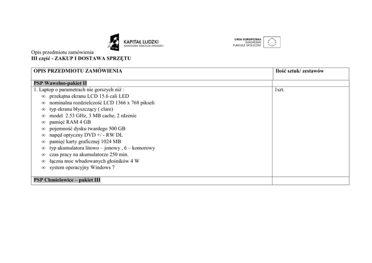 Opis przedmiotu zamówienia III część - ZAKUP I DOSTAWA SPRZĘTU OPIS PRZEDMIOTU ZAMÓWIENIA PSP Wawelno-pakiet II 1. Laptop o parametrach nie gorszych niż : • przekątna ekranu LCD 15.6 cali LED • nominalna rozdzielczość LCD 1366 x 768 pikseli • typ ekranu błyszczący ( clare) • model 2.53 GHz, 3 MB cache, 2 rdzenie • pamięć RAM 4 GB • pojemność dysku twardego 500 GB • napęd optyczny DVD +/ - RW DL • pamięć karty graficznej 1024 MB • typ akumulatora litowo – jonowy , 6 – komorowy • czas pracy na akumulatorze 250 min. • łączna moc wbudowanych głośników 4 W • system operacyjny Windows 7 PSP Chmielowice – pakiet III Ilość sztuk/ zestawów 1szt. Laptop – • • • • • • • • • • • • • • szt 1 przekątna ekranu LCD 15.6 cali LED, nominalna rozdzielczość LCD 1366 x 768 pikseli, typ ekranu błyszczący (glare), model procesora 2.53 GHz, 3 MB cache, 2 rdzenie, wielkość pamięci RAM 4 GB (DDR3 1066Mhz), pojemność dysku twardego 500 GB, 5400 RPM, SATA, napęd optyczny DVD+/-RW DL, pamięć karty graficznej 1024 MB, wyjścia karty graficznej wyjście D-Sub, typ akumulatora litowo-jonowy, 6-komorowy, czas pracy na akumulatorze 255 min. łączna moc wbudowanych głośników 4W, wbudowana kamera System operacyjny: Windows 7 Home Premium 64 bit Ekran projekcyjny – • Ekran elektryczny • - materiał biały matowy, automatyczne zatrzymywanie rozwijania i zwijania ekranu • - łatwy do zamontowania na ścianie lub suficie • - pilot zdalnego sterowania w zestawie • - elektrycznie zwijany i rozwijany • - format 4:3 • - powierzchnia projekcyjna co najmniej 235x175 • - kaseta stalowa • - cichy mechanizm zwijający z napędem sprężynowym, odporny na długotrwałą eksploatację • - gwarancja co najmniej 2 lata szt 1 Aparat fotograficzny – • • • • • • • • • szt 1 Liczba efektywnych pikseli – 14.0 mln Sensor obrazu – ½.3-calowy CCD z filtrem barw Nośnik zapisu – karta pamięci SD/SDHC Obiektyw - 18 krotny zoom optyczny Przysłona – szerokokątny F3.1/F6.4 , telefoto F5.6/F11 z filtrem Lampa błyskowa Monitor LCD – 3.0 cala Złącza USB, HDMI Format zapisu – zdjęcia :JPEG, filmu AVI Odtwarzacz DVD – szt 1 • Odczyt • DVD-Video, SVCD, VCD, CD • CD-R/-RW • DVD-R/-RW (VR) • DVD-R/-RW, DVD+R/+RW, DVR-R/+R DL (Video) • DivX, MP3, WMA, MPEG-4 AAC, WMV i HD JPEG • Gniazda 1 x wyjście HDMI, 1 x USB (przód), 1 x wyjście współosiowe, 1 x wyjście Video, 1 x wyjście Audio, 1 x wyjście Component video , 1 x Euro-SCART • USB Tak • HDMI Tak • Sound Retriever Tak • CD -> USB Recording Tak • Cyfrowo-analogowy przetwornik obrazu 108MHz/12-bitów • Zużycie prądu (praca/czuwanie )do 15W / 1 Watt • Pilot zdalnego sterowania Tak • Automatyczne wyłącz. zasilania Tak • Zasilanie AC 220 - 240V, 50/60 Hz PSP Polska Nowa Wieś -pakiet IV Przenośna( Mobilna ) tablica interaktywna Przystawka pozwalająca na prowadzenie zajęć w ciekawej formie i odtwarzanie multimedialnych programów edukacyjnych Czytnik 1szt. • • • • • • • • • • • Technologia rejestrowania ruchu: Podczerwień Maksymalna przestrzeń robocza: 150" (przekątna) Pionowy kąt rejestrowania: 38 +/- 2 stopnie Poziomy kąt rejestrowania: 0-30 stopni Kalibracja pozycji: Pozycjonowanie optyczne Odległość od ekranu projekcyjnego: 1.5 – 5 m Interfejs: USB 2.0 (3m) oraz RS-232 (opcjonalne, dla odległości do 40 m) Tolerancja dokładności: 1 piksel od środka ekranu dla rozdzielczości 1024X768 Pobór mocy: Mniej niż 800 mW Waga: 210 g Wymiary: 150 x 105 x 32 mm Wskaźnik • • • • • • • Emisja sygnału: Podczerwień Przyciski sterujące: 2 przyciski Zasilanie: 3V bateria litowa CR123A x 1 Wymiary wskaźnika: 14.8 cm (długość); 19.5 mm (średnica) Waga: 50g Waga wskaźnika z baterią: 70 g Regulacja długości wskaźnika: od 36 do 65 cm Pióro elektroniczne (opcjonalne) • • • • • • Emisja sygnału: Podczerwień Sposób aktywacji: Czujnik nacisku Przyciski sterujące: 2 przyciski Zasilanie: 3V bateria litowa CR123A x 1 Wymiary: 15.7 cm (długość); 19.5 mm (średnica) Waga pióra z baterią: 35g Wymagania systemowe • System operacyjny: Microsoft Windows 2000/XP/Vista • • • Procesor: Intel Pentium lub nowszy Pamięć RAM: 128 MB (256 MB zalecane) lub więcej Minimalna ilość miejsca na dysku twardym: 30 MB Sprzęt do odtwarzania muzyki : - BOOMBOX Hi-Fi CD/Mp3/Kaseta/Radio SRR 4317FORM1111ACJE OGÓNE: • • • • • • • • • • • • • • • • • • MP3 Line In Nylonowy uchwyt Głośnik szerokopasmowy Subwoofer Wejście AUX Ciekłokrystaliczny wyświetlacz Przegródka na baterię Wzmacniacz Stereo, 200 W PMPO 230 V, 50 Hz; Zasilanie z baterii: 8 x 1,5 V Odtwarza CD, CD -R, CD -RW, MP3 Odtwarzacz do płyt kompaktowych wkładanych z góry (TOP -LOADING); CD/MP3 możliwość programowania tytułów Wyszukiwanie + opuszczanie; powtórzenie KASETOWY: Funkcja autostop Funkcja Soft - Eject Przewijanie do przodu i do tyłu Start /Pauza/Stop : Analogowy 2-pasmowy odbiornik radiowy MW/UKF/UKF-stereo; Antena teleskopowa - Radioodtwarzacz • Radioodtwarzacz CD z wbudowanym portem USB. 1szt • Obsługuje płyty CD, CD- R, CD -RW, MP3-CD, WMA -CD oraz pliki MP3 i WMA bezpośrednio przez USB. • Posiada również radio. 3szt. PSP Domecko-pakiet V Laptop; Procesor: Intel core i3. Karta graficzna:1GB. Pamięć Ram 3 GB. Pamięć dysku 500GB. LCD „15,6”. System operacyjny: Windows 7 Home Premium 64 bit. Odtwarzacz/ nagrywarka CD/DVD. WiFi Radio; Radioodtwarzacz CD z wyświetlaczem LCD i funkcją odtwarzania plików MP3i WMA oraz wejściem USB i AUX . 1 sztuka 1 sztuka