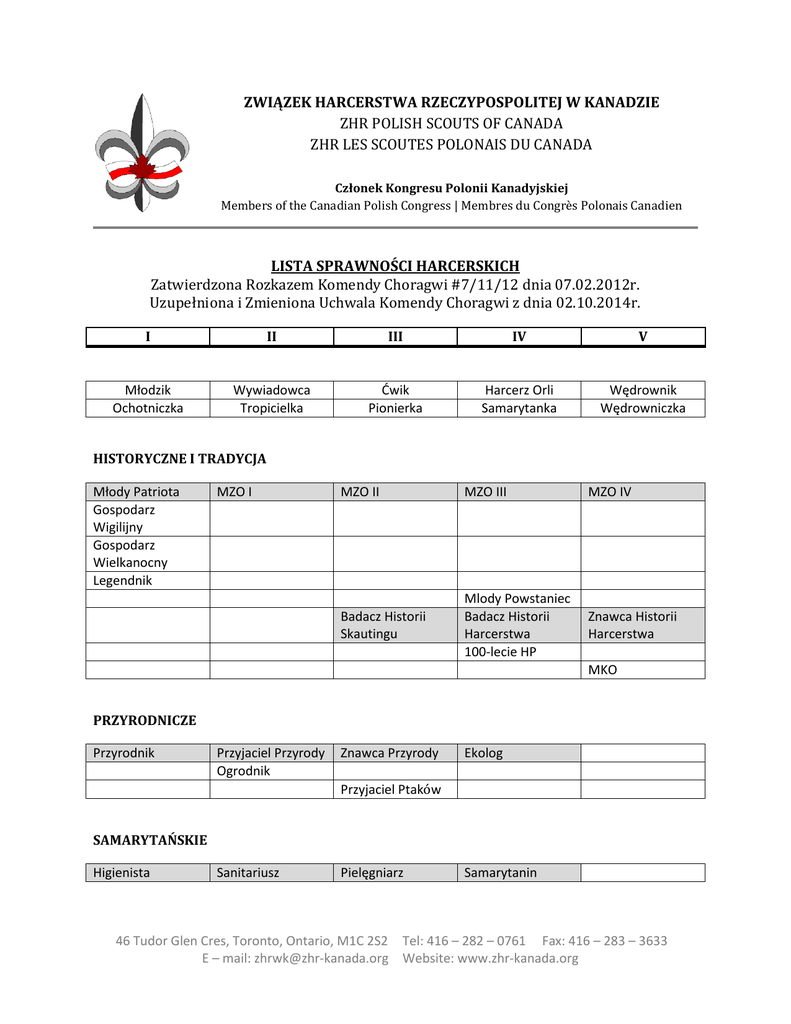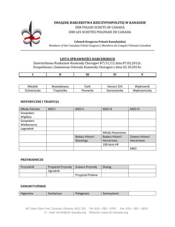 ZWIĄZEK HARCERSTWA RZECZYPOSPOLITEJ W KANADZIE ZHR POLISH SCOUTS OF CANADA ZHR LES SCOUTES POLONAIS DU CANADA Członek Kongresu Polonii Kanadyjskiej Members of the Canadian Polish Congress | Membres du Congrès Polonais Canadien LISTA SPRAWNOŚCI HARCERSKICH Zatwierdzona Rozkazem Komendy Choragwi #7/11/12 dnia 07.02.2012r. Uzupełniona i Zmieniona Uchwala Komendy Choragwi z dnia 02.10.2014r. I II III IV V Młodzik Ochotniczka Wywiadowca Tropicielka Ćwik Pionierka Harcerz Orli Samarytanka Wędrownik Wędrowniczka HISTORYCZNE I TRADYCJA Młody Patriota Gospodarz Wigilijny Gospodarz Wielkanocny Legendnik MZO I MZO II MZO III MZO IV Badacz Historii Skautingu Mlody Powstaniec Badacz Historii Harcerstwa 100-lecie HP Znawca Historii Harcerstwa MKO PRZYRODNICZE Przyrodnik Przyjaciel Przyrody Ogrodnik Znawca Przyrody Ekolog Przyjaciel Ptaków SAMARYTAŃSKIE Higienista Sanitariusz Pielęgniarz Samarytanin 46 Tudor Glen Cres, Toronto, Ontario, M1C 2S2 Tel: 416 – 282 – 0761 Fax: 416 – 283 – 3633 E – mail: [email protected] Website: www.zhr-kanada.org SPORTOWE Pływak I Łyzwiarz I Narciarz I Snowboardzista I Saneczkarz Pływak II Łyzwiarz II Narciarz II Pływak III Ratownik Wodny Piłkarz Łucznik Strzelec Kolarz Olimpijczyk OBOZOWE Kuchcik Wartownik Zdobnik Obozowy Kucharz Starszy Wartownik Trzy Pióra Robinson Ognik Prowadzący Ogniska Harcownik Majsterklepka Sobieradek Obozowy Technik Obozowy Sznurkarz Saper Obozowy Wyga Obozowy Mistrz Musztry ARTYSTYCZNE Młody Aktor Aktor Dobosz Reżyser Malarz Rysownik Młody Kronikarz Fotoamator Kronikarz Fotograf Tancerz Trębacz Spiewak Gitarzysta Muzyk Dekorator 46 Tudor Glen Cres, Toronto, Ontario, M1C 2S2 Tel: 416 – 282 – 0761 Fax: 416 – 283 – 3633 E – mail: [email protected] Website: www.zhr-kanada.org TERENOWE Obserwator Terenu Znawca Pogody Eskimos Goniec Terenoznawca Mistrz Mapy Meteorolog Polarnik Biwakowicz Starszy Biwakowicz Sygnalista Organizator Biwaków Tramp Wędrowiec Lekka Stopa TURYSTYCZNE Piechur Wodniak Kanadyjkarz NAUKOWO-TECHNICZNE Obserwator Nieba Młody Astronom Astronom Młody Projektant Komputerowiec HOBBY Młody Krawiec Młody Wędkarz Projektant Mody Wędkarz Kolekcjoner Przyjaciel Zwierząt Opiekun Dzieci Tworzenie Sprawności Poza Podstawowym Zestawem Drużyny i szczepy mogą opracowywać własne sprawności. Wymagania tych sprawności należy opracowywać zgodnie z zasadami przedstawionymi w „Regulaminie Sprawności Harcerskich”. Należy również określić ich poziom i zaprojektować znak graficzny. Opracowane w środowiskach sprawności należy przesłać do zatwierdzenia w Komendzie Chorągwi i dalszego upowszechnienia. 46 Tudor Glen Cres, Toronto, Ontario, M1C 2S2 Tel: 416 – 282 – 0761 Fax: 416 – 283 – 3633 E – mail: [email protected] Website: www.zhr-kanada.org
