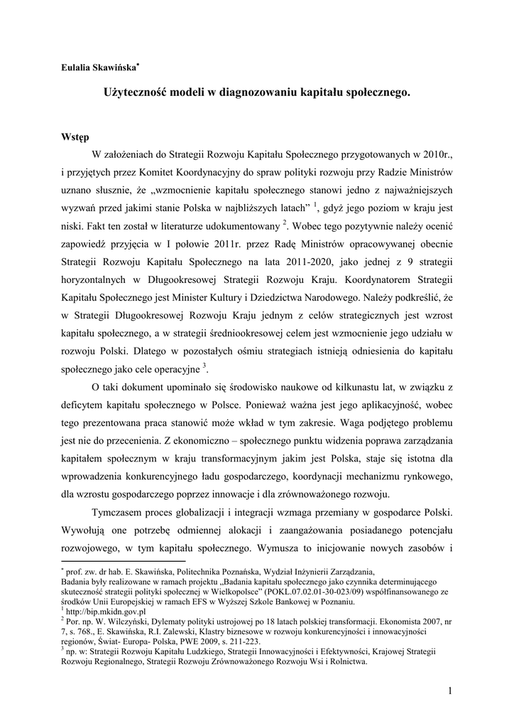 Eulalia Skawińska∗ UŜyteczność modeli w diagnozowaniu kapitału społecznego. Wstęp W załoŜeniach do Strategii Rozwoju Kapitału Społecznego przygotowanych w 2010r., i przyjętych przez Komitet Koordynacyjny do spraw polityki rozwoju przy Radzie Ministrów uznano słusznie, Ŝe „wzmocnienie kapitału społecznego stanowi jedno z najwaŜniejszych wyzwań przed jakimi stanie Polska w najbliŜszych latach” 1, gdyŜ jego poziom w kraju jest niski. Fakt ten został w literaturze udokumentowany 2. Wobec tego pozytywnie naleŜy ocenić zapowiedź przyjęcia w I połowie 2011r. przez Radę Ministrów opracowywanej obecnie Strategii Rozwoju Kapitału Społecznego na lata 2011-2020, jako jednej z 9 strategii horyzontalnych w Długookresowej Strategii Rozwoju Kraju. Koordynatorem Strategii Kapitału Społecznego jest Minister Kultury i Dziedzictwa Narodowego. NaleŜy podkreślić, Ŝe w Strategii Długookresowej Rozwoju Kraju jednym z celów strategicznych jest wzrost kapitału społecznego, a w strategii średniookresowej celem jest wzmocnienie jego udziału w rozwoju Polski. Dlatego w pozostałych ośmiu strategiach istnieją odniesienia do kapitału społecznego jako cele operacyjne 3. O taki dokument upominało się środowisko naukowe od kilkunastu lat, w związku z deficytem kapitału społecznego w Polsce. PoniewaŜ waŜna jest jego aplikacyjność, wobec tego prezentowana praca stanowić moŜe wkład w tym zakresie. Waga podjętego problemu jest nie do przecenienia. Z ekonomiczno – społecznego punktu widzenia poprawa zarządzania kapitałem społecznym w kraju transformacyjnym jakim jest Polska, staje się istotna dla wprowadzenia konkurencyjnego ładu gospodarczego, koordynacji mechanizmu rynkowego, dla wzrostu gospodarczego poprzez innowacje i dla zrównowaŜonego rozwoju. Tymczasem proces globalizacji i integracji wzmaga przemiany w gospodarce Polski. Wywołują one potrzebę odmiennej alokacji i zaangaŜowania posiadanego potencjału rozwojowego, w tym kapitału społecznego. Wymusza to inicjowanie nowych zasobów i ∗ prof. zw. dr hab. E. Skawińska, Politechnika Poznańska, Wydział InŜynierii Zarządzania, Badania były realizowane w ramach projektu „Badania kapitału społecznego jako czynnika determinującego skuteczność strategii polityki społecznej w Wielkopolsce” (POKL.07.02.01-30-023/09) współfinansowanego ze środków Unii Europejskiej w ramach EFS w WyŜszej Szkole Bankowej w Poznaniu. 1 http://bip.mkidn.gov.pl 2 Por. np. W. Wilczyński, Dylematy polityki ustrojowej po 18 latach polskiej transformacji. Ekonomista 2007, nr 7, s. 768., E. Skawińska, R.I. Zalewski, Klastry biznesowe w rozwoju konkurencyjności i innowacyjności regionów, Świat- Europa- Polska, PWE 2009, s. 211-223. 3 np. w: Strategii Rozwoju Kapitału Ludzkiego, Strategii Innowacyjności i Efektywności, Krajowej Strategii Rozwoju Regionalnego, Strategii Rozwoju ZrównowaŜonego Rozwoju Wsi i Rolnictwa. 1 umiejętności poprzez podejmowanie działań przedsiębiorczych, na co główny wpływ ma kapitał społeczny. W pełni naleŜy zgodzić się z poglądem, Ŝe „wiedza i kapitał społeczny zastępują stopniowo kapitał ekonomiczny, jako podstawowe źródło tworzenia wartości”4. Artykuł ma charakter teoretyczny. Jego celem jest przedstawienie modelowego podejścia do identyfikacji luki kapitału społecznego oraz budowy jego wzrostu. 1. Pojęcie kapitału społecznego i jego istota Kategoria kapitału społecznego ma charakter interdyscyplinarny i wieloznaczny. Stanowi pole zainteresowań socjologów, polityków, przedstawicieli nauk ekonomicznych oraz innych dziedzin takich jak psychologii czy politologii oraz etyki. Dlatego nie moŜna oczekiwać w tym zakresie jednej ujednoliconej definicji. W zaleŜności od kierunku badań występuje nacisk na węŜsze lub szersze jej ujęcie. Idea kapitału społecznego została rozpoznana przez socjologów, ale uznana przez ekonomię instytucjonalną i ekonomię rozwoju, gdzie kapitał ten traktuje się jako pozaekonomiczny czynnik kształtujący procesy gospodarcze. ZróŜnicowane podejście do konceptualizacji kapitału społecznego przedstawiono w tab. 1. Przyjęto tutaj kilka podstawowych kryteriów podziału najczęściej występujących definicji w literaturze i stosowanych w organizacjach międzynarodowych. Tabela 1 Klasyfikacja definicji kapitału społecznego Lp. 1. 2. 3. 4. 5. 6. 7. 8. 9. 10. 11. 12. 13. 14. Wyszczególnienie kryteriów podziału pojemność źródła pochodzenia wartościowanie rodzaj zasobów i atrybutów przynaleŜność wymiarów (atrybutów) poziom stopień dojrzałości realizowane funkcje instrumenty wzrostu okres czasu główne zasoby kapitału społecznego dynamika faza rozwoju zakres terytorialny Typ definicji szersza, węŜsza - pierwotne (genetyczne, mentalnościowe i kulturowe) dziedziczone - wtórne (edukacja, wychowanie i kultura, doświadczenie historyczne) – nabyte zewnętrznie dobry, zły, pozytywny, negatywny strukturalne, behawioralne, poznawcze osobowy (indywidualny), grupowy (zbiorowy) dodatni, ujemny (luka) duŜy, średni, mały społeczne, ekonomiczne mierzalne (ilościowe), niematerialne, niemierzalne (jakościowe) realny (rzeczywisty), potencjalny (hipotetyczny) - zaufanie X; - zaufanie, sieci współpracy, normy i wartości XX, - zaufanie, wiarygodność, normy i wartości, lojalność, współpraca, solidarność, uczestnictwo XXX statyczny, rosnący, malejący początkowa (embrionalna), wzrostu (poprawy), dojrzała skala mikro, mezo i makro 4 W.M. Grudzewski, I.K. Hejduk, A. Sankowska, M/ Wańtuchowicz , Sustainability w biznesie czyli przedsiębiorstwo przyszłości. Zmiany paradygmatów i koncepcji zarządzania, Poltext, Warszawa 2010, s. 13. 2 15. bariery wykorzystania infrastrukturalne, instytucjonalne, edukacyjne Putnam, Fukuyama, Grudzewski, Hejduk XX Coleman, Matysiak XXX Skawińska Źródło: opracowanie własne. X Dla przybliŜenia omawianej kategorii socjoekonomiczne