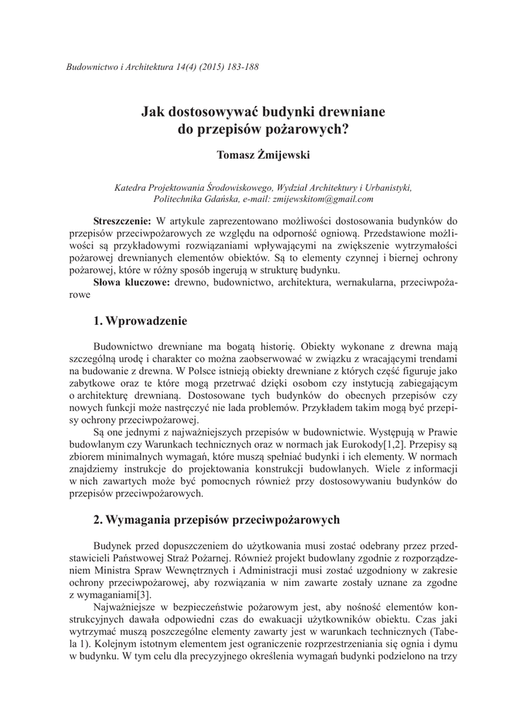 Budownictwo i Architektura 14(4) (2015) 183-188 Jak dostosowywać budynki drewniane do przepisów pożarowych? Tomasz Żmijewski Katedra Projektowania Środowiskowego, Wydział Architektury i Urbanistyki, Politechnika Gdańska, e-mail: [email protected] Streszczenie: W artykule zaprezentowano możliwości dostosowania budynków do przepisów przeciwpożarowych ze względu na odporność ogniową. Przedstawione możliwości są przykładowymi rozwiązaniami wpływającymi na zwiększenie wytrzymałości pożarowej drewnianych elementów obiektów. Są to elementy czynnej i biernej ochrony pożarowej, które w różny sposób ingerują w strukturę budynku. Słowa kluczowe: drewno, budownictwo, architektura, wernakularna, przeciwpożarowe 1. Wprowadzenie Budownictwo drewniane ma bogatą historię. Obiekty wykonane z drewna mają szczególną urodę i charakter co można zaobserwować w związku z wracającymi trendami na budowanie z drewna. W Polsce istnieją obiekty drewniane z których część figuruje jako zabytkowe oraz te które mogą przetrwać dzięki osobom czy instytucją zabiegającym o architekturę drewnianą. Dostosowane tych budynków do obecnych przepisów czy nowych funkcji może nastręczyć nie lada problemów. Przykładem takim mogą być przepisy ochrony przeciwpożarowej. Są one jednymi z najważniejszych przepisów w budownictwie. Występują w Prawie budowlanym czy Warunkach technicznych oraz w normach jak Eurokody[1,2]. Przepisy są zbiorem minimalnych wymagań, które muszą spełniać budynki i ich elementy. W normach znajdziemy instrukcje do projektowania konstrukcji budowlanych. Wiele z informacji w nich zawartych może być pomocnych również przy dostosowywaniu budynków do przepisów przeciwpożarowych. 2. Wymagania przepisów przeciwpożarowych Budynek przed dopuszczeniem do użytkowania musi zostać odebrany przez przedstawicieli Państwowej Straż Pożarnej. Również projekt budowlany zgodnie z rozporządzeniem Ministra Spraw Wewnętrznych i Administracji musi zostać uzgodniony w zakresie ochrony przeciwpożarowej, aby rozwiązania w nim zawarte zostały uznane za zgodne z wymaganiami[3]. Najważniejsze w bezpieczeństwie pożarowym jest, aby nośność elementów konstrukcyjnych dawała odpowiedni czas do ewakuacji użytkowników obiektu. Czas jaki wytrzymać muszą poszczególne elementy zawarty jest w warunkach technicznych (Tabela 1). Kolejnym istotnym elementem jest ograniczenie rozprzestrzeniania się ognia i dymu w budynku. W tym celu dla precyzyjnego określenia wymagań budynki podzielono na trzy 184 Tomasz Żmijewski grupy. Dla czasowego i stałego pobytu ludzi określane jako ZL, obiekty o przeznaczeniu magazynowym i produkcyjnym PM oraz inwentarskie oznaczone symbolem IN. Podział ten ma zapewnić aby drogi ewakuacyjne oraz jej elementy były odpowiednio dostosowane i nie utrudniały ucieczki. W celu maksymalizowania bezpieczeństwa wprowadzono odporność pożarową budynków. Została ona podzielona na pięć klas, które oznaczono jako A, B, C, D i E, gdzie A jest najwyższą a E najniższą z klas w stosunku do stawianych wymogów odporności przegród. Klasy te są przydzielane ze względu na wysokość czy gęstość obciążenia pożarowego zgodnie z tabelami zawartymi w warunkach technicznych jakim powinny odpowiadać budynki i ich usytuowanie. Tabela 1. Minimalne wymagania przegród budynku.[2] Class of fire resistance ratings Main constraction Roof constraction fire resistance of elements 5) *) Slope 1) External walls 1), 2) "A" R 240 R 30 REI 120 "B" "C" R 120 R 60 R 30 R 15 REI 60 REI 60 "D" "E" R 30 (-) (-) (-) REI 30 (-) Internal walls 1) Roof covering 3) EI 120(o↔i) EI 60 RE 30 EI 60 (o↔i) EI 30 (o↔i) EI 30 4) EI 154) RE 30 RE 15 EI 30 (o↔i) (-) (-) (-) (-) (-) Oznaczenia w tabeli: R – nośność ogniowa (w minutach), określona zgodnie z Polską Normą dotyczącą zasad ustalania klas odporności ogniowej elementów budynku, E – szczelność ogniowa (w minutach), określona jw., I – izolacyjność ogniowa (w minutach), określona jw., (–) – nie stawia się wymagań. *) Z zastrzeżeniem § 219 ust. 1 1) Jeżeli przegroda jest częścią głównej konstrukcji nośnej, powinna spełniać także kryteria nośności ogniowej (R) odpowiednio do wymagań zawartych w kol. 2 i 3 dla danej klasy odporności pożarowej budynku. 2) Klasa odporności ogniowej dotyczy pasa międzykondygnacyjnego wraz z połączeniem ze stropem. 3) Wymagania nie dotyczą naświetli dachowych, świetlików, lukarn i okien połaciowych (z zastrzeżeniem § 218), jeśli otwory w połaci dachowej nie zajmują więcej niż 20% jej powierzchni, nie dotyczą także budynku, w którym nad najwyższą kondygnacją znajduje się strop albo inna przegroda, spełniająca kryteria określone w kol. 4. 4) Dla ścian komór zsypu wymaga się EI 60, a dla drzwi komór zsypu - EI 30. 5) Klasa odporności ogniowej dotyczy elementów wraz z uszczelnieniami złączy i dylatacjami. Elementy obiektu przyporządkowane do danej klasy muszą następnie spełniać odpowiednie wymagania czasowe, przedstawione w minutach, ze względu na trzy podstawowe aspekty: nośność, szczelność i izolacyjność ogniową. Nośność ogniowa oznaczana jest symbolem „R” oraz liczbę. Liczba ta określa jaki czas, w minutach, wytrzymać musi element zanim dozna zniszczenia mechanicznego i straci swoje właściwości nośne lub statyczne, bądź przekroczy dopuszczalne wartości przemieszczenia lub odkształcenia. Warunek ten musi spełniać większość części budynku bez ścian działowych czy ścian zewnętrznych nienośnych. Szczelność ogniowa („E”) opisuje odporność elementu na przenikanie przez niego płomieni lub gazów. Powierzchnia przez dany czas musi nie dopuszczać do przenikania ognia na nienagrzewaną stronę przegrody. Warunek ten musi spełniać również znaczna większość konstrukcji bez słupów i belek oraz dachów czy ścian w niektórych prz