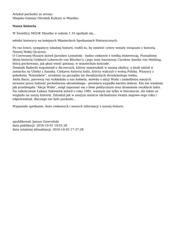 Artykuł pochodzi ze strony: Miejsko-Gminny Ośrodek Kultury w Miastku Nasza historia W Świetlicy MGOK Miastko w sobotę 1.10 spotkali się... młodzi historycy na kolejnych Miasteckich Spotkaniach Historycznych. Po raz trzeci, sympatycy lokalnej historii, trafili tu, by omówić cztery tematy związane z historią Naszej Małej Ojczyzny. O Czerwonej Huzarii mówił Jarosław Lemański - badzo ciekawie z wielką elokwencją. Poznaliśmy bliżej historię Gebhard Leberecht von Blücher'a i jego żony baronessy Caroline Amelie von Mehling, którą pochowano, jak głosi wieść gminna, w miasteckim kościele. Dominik Radecki wspomniał o Ak-owcach, którzy zamieszkali w naszej okolicy, a brali udział w zamachu na Ubeka z Sanoka. Ciekawa historia ludzi, którzy walczyli o wolną Polskę. Wszyscy z pokolenia "Kolumbów", urodzeni na początku lat dwudziestych dwudziestego wieku. Anita Bacic, pierwszy raz wykładała u nas kobieta, mówiła o akcji Wisła i zasiedleniu naszych terenów przez ludność pochodzenia ukraińskiego - premiera wypadła bardzo dobrze. Kto nie wiedział, jak przebiegała "Akcja Wisła", mógł zapoznać się z tłem politycznym oraz dramatem zwykłych ludzi. Na zakończenie Łukasz Szkwarek mówił o roku 1981, ważnym nie tylko w literaturze, ale także ze względu na naszą historię. Zdradził jak w naszym mieście obchodzono święta majowe tego roku i odpowiedział, dlaczego nie było pochodu... Wspaniałe spotkanie, dużo ciekawych i nowych informacji o naszej historii. opublikował: Janusz Gawroński data publikacji: 2016-10-01 19:01:26 data ostatniej aktualizacji: 2016-10-03 17:37:28