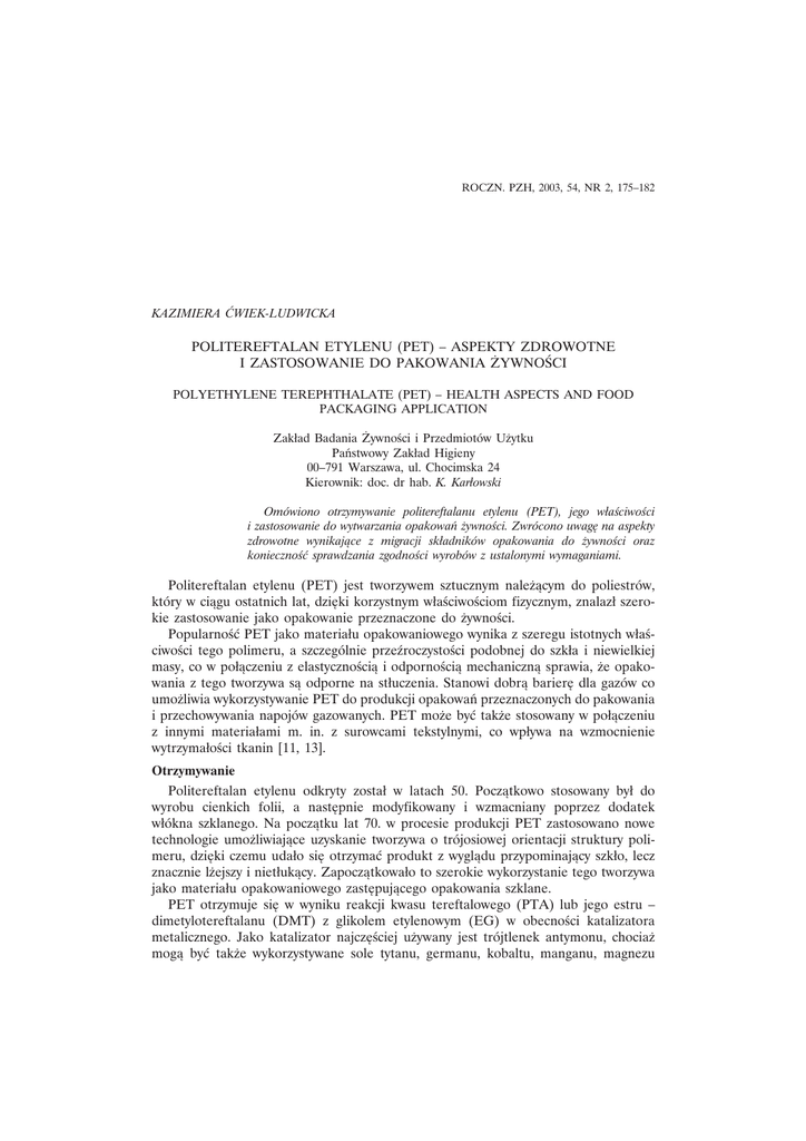 ROCZN. PZH, 2003, 54, NR 2, 175–182 KAZIMIERA ĆWIEK-LUDWICKA POLITEREFTALAN ETYLENU (PET) – ASPEKTY ZDROWOTNE I ZASTOSOWANIE DO PAKOWANIA ŻYWNOŚCI POLYETHYLENE TEREPHTHALATE (PET) – HEALTH ASPECTS AND FOOD PACKAGING APPLICATION Zakład Badania Żywności i Przedmiotów Użytku Państwowy Zakład Higieny 00–791 Warszawa, ul. Chocimska 24 Kierownik: doc. dr hab. K. Karłowski Omówiono otrzymywanie politereftalanu etylenu (PET), jego właściwości i zastosowanie do wytwarzania opakowań żywności. Zwrócono uwagę na aspekty zdrowotne wynikające z migracji składników opakowania do żywności oraz konieczność sprawdzania zgodności wyrobów z ustalonymi wymaganiami. Politereftalan etylenu (PET) jest tworzywem sztucznym należącym do poliestrów, który w ciągu ostatnich lat, dzięki korzystnym właściwościom fizycznym, znalazł szerokie zastosowanie jako opakowanie przeznaczone do żywności. Popularność PET jako materiału opakowaniowego wynika z szeregu istotnych właściwości tego polimeru, a szczególnie przeźroczystości podobnej do szkła i niewielkiej masy, co w połączeniu z elastycznością i odpornością mechaniczną sprawia, że opakowania z tego tworzywa są odporne na stłuczenia. Stanowi dobrą barierę dla gazów co umożliwia wykorzystywanie PET do produkcji opakowań przeznaczonych do pakowania i przechowywania napojów gazowanych. PET może być także stosowany w połączeniu z innymi materiałami m. in. z surowcami tekstylnymi, co wpływa na wzmocnienie wytrzymałości tkanin [11, 13]. Otrzymywanie Politereftalan etylenu odkryty został w latach 50. Początkowo stosowany był do wyrobu cienkich folii, a następnie modyfikowany i wzmacniany poprzez dodatek włókna szklanego. Na początku lat 70. w procesie produkcji PET zastosowano nowe technologie umożliwiające uzyskanie tworzywa o trójosiowej orientacji struktury polimeru, dzięki czemu udało się otrzymać produkt z wyglądu przypominający szkło, lecz znacznie lżejszy i nietłukący. Zapoczątkowało to szerokie wykorzystanie tego tworzywa jako materiału opakowaniowego zastępującego opakowania szklane. PET otrzymuje się w wyniku reakcji kwasu tereftalowego (PTA) lub jego estru – dimetylotereftalanu (DMT) z glikolem etylenowym (EG) w obecności katalizatora metalicznego. Jako katalizator najczęściej używany jest trójtlenek antymonu, chociaż mogą być także wykorzystywane sole tytanu, germanu, kobaltu, manganu, magnezu 176 K. Ćwiek-Ludwicka Nr 2 i cynku. Pewne ilości katalizatora mogą pozostawać w finalnym wyrobie, co należy brać pod uwagę przy ocenie jakości zdrowotnej wyrobów wytwarzanych z użyciem tego polimeru. Schemat reakcji otrzymywania PET podano na ryc. 1 [11]. Ryc. 1. Schemat otrzymywania PET z kwasu tereftalowego (PTA) i glikolu etylenowego (EG) Scheme of formation of PET from terephthalic acid (PTA) and ethylene glycol (EG) PET, polimer o wysokiej masie cząsteczkowej wynoszącej około 25000, otrzymywany jest w drugim etapie polikondensacji. W procesie tym usuwane są lotne zanieczyszczenia – aldehyd octowy i wolne glikole. Pozostałości glikolu etylenowego usuwane są w procesie destylacji próżniowej, natomiast kwasu tereftalowego w wyniku wielokrotnej krystalizacji. Po uformowaniu polimeru usunięcie z niego pozostałości zanieczyszczeń jest bardzo trudne, dlatego też, podstawowe znaczenie ma stosowanie do produkcji tego tworzywa surowców wyjściowych o odpowiednio wysokiej czystości, co jest niezbędne do otrzymania polimeru o jakości jaka jest wymagana w przypadku produkcji opakowań żywności. Nr 2 PET – opakowania do żywności 177 Właściwości i zastosowanie Politereftalan etylenu dzięki wysokiej masie cząsteczkowej charakteryzuje się dobrymi właściwościami mechanicznymi zapewniającymi mu odpowiednią giętkość [11,13]. Ponadto charakteryzuje się twardą powierzchnią, dobrymi właściwościami poślizgowymi i dielektrycznymi oraz odpornością chemiczną na słabe kwasy i roztwory zasad, oleje i tłuszcze. Nie jest odporny na stężone kwasy i roztwory zasad, długotrwałe działanie gorącej wody. Sterylizację wyrobów z PET prowadzi się a atmosferze tlenku etylenu lub poprzez napromienianie [13]. PET jest przetwarzany głównie metodą wtrysku w temperaturze 260–290oC, natomiast metodą wytłaczania formuje się folie, płyty i włókna. W celu zwiększenia wytrzymałości mechanicznej folię poddaje się orientacji dwuosiowej przez rozciąganie. PET należy do polimerów półkrystalicznych, który po ogrzaniu do temperatury powyżej 72oC topi się zmieniając postać z twardego, podobnego do szkła materiału, w strukturę elastyczną, podobną do gumy. W takiej postaci wielkocząsteczkowe łańcuchy polimeru dają się formować poprzez rozciąganie w jednym kierunku tworząc włókna lub w dwóch kierunkach dając w rezultacie folie lub butelki. Szybkie schłodzenie materiału powoduje, że zastygając daje w efekcie trwale uformowane opakowania, np. butelki, słoiki, pojemniki. Przetrzymywanie materiału w stanie rozciągnięcia w temperaturze powyżej 72oC prowadzi do jego stopniowej krystalizacji powodującej zmętnienie, zwiększenie kruchości i zmniejszenie elastyczności. W takiej postaci jest on znany jako krystaliczny PET (CPET), tworzywo, które jest bardziej odporne na wysoką temperaturę i znajduje zastosowanie w produkcji tacek i pojemników wykorzystywanych w gastronomii jako opakowania jednorazowego użytku do dań gotowych umożliwiających podgrzewanie np. w kuchenkach mikrofalowych i wyrobów cukierniczych sprzedawanych na wynos [1, 2, 9, 11]. Do celów termoformowania wykorzystuje się PET zawierający niewielką ilość komonomeru – kwasu izoftalowego, czyli APET. Wyroby z APET przy podgrzaniu powyżej temperatury zeszklenia lub gdy są wolno schładzane stopniowo krystalizują. Amorficznym poliestrem w każdych warunkach jest PETG (kopolimer kwasu tereftalowego z dwoma glikolami etyl