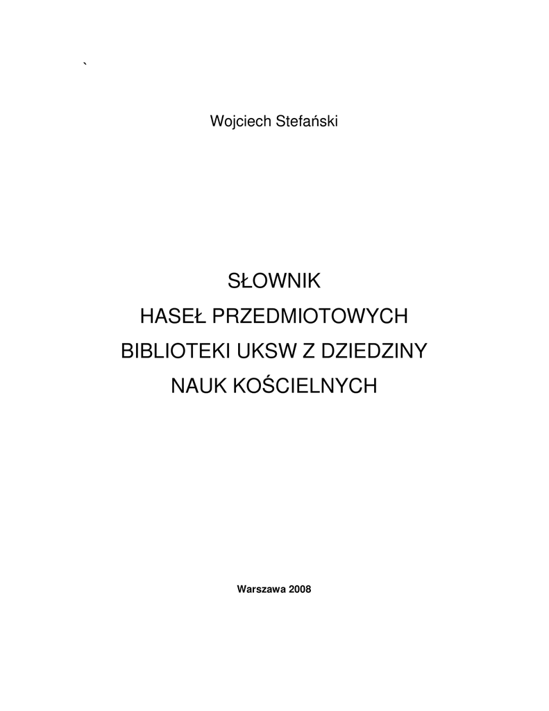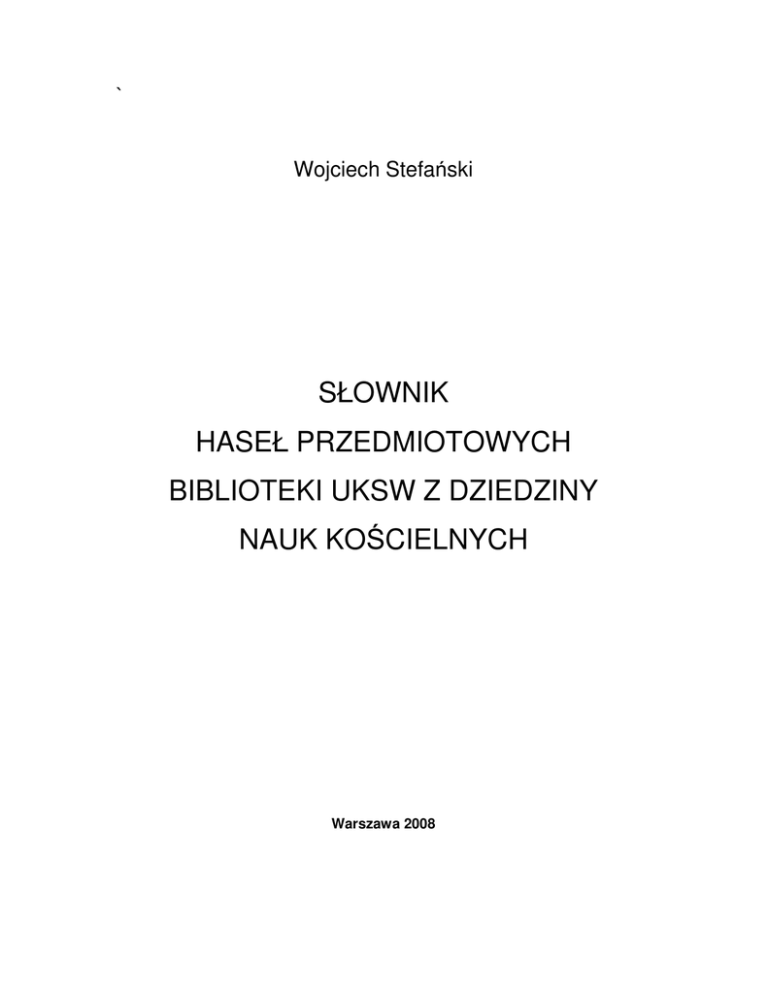` Wojciech Stefański SŁOWNIK HASEŁ PRZEDMIOTOWYCH BIBLIOTEKI UKSW Z DZIEDZINY NAUK KOŚCIELNYCH Warszawa 2008 2 Z teorii haseł przedmiotowych Podstawowym katalogiem spotykanym w każdej bibliotece jest katalog alfabetyczny. Jednakże spełnia on swoją rolę tylko wtedy, gdy czytelnik zna nazwisko autora książki lub tytuł pracy zbiorowej. Jeśli zaś nie mamy tych danych lub interesuje nas jakaś dziedzina wiedzy, rzecz albo osoba, to wówczas niezbędnym staje się katalog przedmiotowy. Warunkiem jego powstania i funkcjonowania jest rozstrzygnięcie kwestii stosowanego języka haseł przedmiotowych. W Polsce najbardziej znane są dwa języki haseł przedmiotowych: Biblioteki Narodowej i KABA. Przy wyborze języka, każda biblioteka powinna kierować się swoimi potrzebami i możliwościami, a więc tematyką księgozbioru, wymaganą szczegółowością pojęć, środkami technicznymi i finansowymi. Trzeba również stwierdzić, że czasem język haseł przedmiotowych tworzony oddolnie, wynikający z wieloletniej praktyki, może się lepiej sprawdzać, niż narzucony odgórnie. Należy także pamiętać, iż możliwe jest istnienie kilku potencjalnie dobrych języków, a duże znaczenie dla efektywności wyszukiwania ma jakość katalogowania, czyli rzetelność w pracy bibliotekarzy. Optymalne wydaje się takie rozwiązanie, które godzi lokalne potrzeby z uniwersalnymi zasadami, choć spełnienie obu tych warunków na raz sprawia pewne trudności. Warto jednak dokonać jak najlepszego wyboru – ma to bowiem duże znaczenie dla szybkiego dotarcia do właściwej informacji. Język haseł przedmiotowych jest językiem sztucznym i należy do języków informacyjno-wyszukiwawczych. Na jego słownictwo składają się tematy i określniki. Terminy używane do tworzenia języka haseł przedmiotowych muszą być znane, aktualne, niegwarowe, możliwie krótkie i poprawne naukowo. Hasło proste składa się z tematu, a hasło rozwinięte – z tematu i określnika. Temat jest to elementarna, samodzielna składniowo jednostka leksykalna języka haseł przedmiotowych. Istnieją następujące tematy: ogólny, językowo-etniczny, geograficzny, korporatywny, osobowy, łączony, chronologiczny, jednostkowy i etniczny. Określnik jest to elementarna, niesamodzielna składniowo jednostka leksykalna języka haseł przedmiotowych. Istnieją następujące określniki: ogólny, geograficzny, chronologiczny, jednostkowy i formalny. Warto również zauważyć, że najbardziej efektywnym sposobem przeszukiwania katalogów i baz bibliotecznych jest łączenie języka haseł przedmiotowych z językiem naturalnym. 3 Przykłady Temat ogólny – Teologia, Filozofia, Nauka społeczna Kościoła katolickiego. Temat językowo-etniczny – Literatura polska, Język angielski, Powieść niemiecka. Temat geograficzny – Warszawa, Mazowsze, Polska, Europa. Temat korporatywny – Dominikanie, Kongregacja Nauki Wiary, Sobór Watykański II. Temat osobowy – Jezus Chrystus, Trójca Święta, Wyszyński Stefan (prymas Polski). Temat łączony – Chrześcijaństwo a religie, Teologia a filozofia, Wiara a rozum. Temat chronologiczny – Powstanie 1944 r. warszawskie, Wojna 1939-1945 r. Temat jednostkowy – Bogurodzica (pieśń), Veni Creator (pieśń). Temat etniczny – Arabowie, Indianie, Żydzi. Określnik ogólny – historia, twórczość, zagadnienia. Określnik geograficzny – Ameryka, Australia, Azja. Określnik chronologiczny – 1918-1939 r., 1944-1989 r., od 1965 r., od 1989 r., 21 w. Określnik jednostkowy – Evangelium vitae (encyklika), kościół św. Stanisława Kostki. Określnik formalny – materiały konferencyjne, podręczniki akademickie, słowniki. Antropologia teologiczna. Bóg – teologia – katolicyzm – podręczniki akademickie. Filozofia chrześcijańska – historia – Polska – 20 w. Kościół katolicki – Polska – od 1989 r. Maryja (Matka Boża) – rozmyślania. Matka Boża Częstochowska (obraz). Modlitwa o uzdrowienie – katolicyzm. Muzyka religijna – teologia – katolicyzm. Odpoczynek – teologia biblijna. Praca – teologia – katolicyzm – materiały konferencyjne. Religia – filozofia. Rośliny – w Biblii. Teologia biblijna – słowniki. Teologia moralna – katolicyzm – Polska – 20-21 w. – materiały konferencyjne. Warszawa – religia – 16-20 w. Wychowanie religijne – prawo kanoniczne. 4 Katalog przedmiotowy Biblioteki UKSW Biblioteka Uniwersytetu Kardynała Stefana Wyszyńskiego jest kontynuatorką Biblioteki Akademii Teologii Katolickiej. Posiada ona w swoich zbiorach ponad 200.000 woluminów, z czego przeszło 80.000 zostało opracowanych komputerowo (w programie MAK). Katalog przedmiotowy kartkowy istnieje od 1978, a komputerowy – od 1993 r. W opracowaniu rzeczowym używany jest język haseł przedmiotowych Biblioteki UKSW i język haseł przedmiotowych Biblioteki Narodowej (czasem z pewnymi modyfikacjami). Dużą część zbiorów bibliotecznych UKSW stanowią książki z dziedziny nauk kościelnych (teologia, filozofia, prawo kanoniczne, historia Kościoła, katolicka nauka społeczna, historia sztuki sakralnej). W związku z tym powstał problem stosowania języka haseł przedmiotowych umożliwiającego ich właściwe sklasyfikowanie. To właśnie było genezą opracowania niniejszego słownika, który zawiera ponad 1.000 haseł przedmiotowych z dziedziny nauk kościelnych, używanych w Bibliotece UKSW. W zdecydowanej większości hasła te dotyczą oczywiście chrześcijaństwa, ale część z nich odnosi się również do innych religii (judaizm, islam, hinduizm, buddyzm). Rozwój słownictwa stosowanego w opracowaniu rzeczowym nastąpił szczególnie w ciągu ostatnich kilku lat, a przyczyniła się do tego szybko wzrastająca ilość nabywanych książek. Mam nadzieję, że publikacja ta będzie pożyteczną pomocą w bibliotekach kościelnych i wkładem do rozbudowy języków haseł przedmiotowych w nich funkcjonujących. Może ta