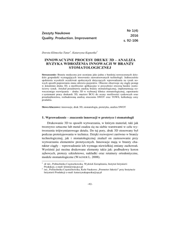 Nr 1(4) Zeszyty Naukowe Quality. Production. Improvement 2016 s. 92-106 Dorota Klimecka-Tatar1, Katarzyna Kapustka2 INNOWACYJNE PROCESY DRUKU 3D – ANALIZA RYZYKA WDROŻENIA INNOWACJI W BRANŻY STOMATOLOGICZNEJ Streszczenie: Branża medyczna jest oceniana jako jedna z bardziej nowoczesnych dziedzin gospodarki wymagających stosowania zaawansowanych technologii. Jednocześnie spełnienia wysokich oczekiwań społecznych dotyczących wprowadzania na rynek nowych sposób poprawiania stanu zdrowia pacjentów. Obecnie obserwuje się ciągły postęp w dziedzinie druku 3D, a możliwości aplikacyjne w przyszłości stworzą bardzo wartościowy rynek. Artykuł przedstawia analizę branży stomatologicznej, implementację nowoczesnego rozwiązania – druku 3D w wybranej klinice stomatologicznej, zapoznanie z systemami pracy drukarek 3D, macierz BCG do oceny możliwości rynkowych oraz przedsiębiorstwa, rozbudowaną analizę otoczenia SWOT oraz TOWS, kalkulację ceny produktu. Słowa kluczowe: innowacje, druk 3D, stomatologia, protetyka, analiza SWOT 1. Wprowadzenie – znaczenie innowacji w protetyce i stomatologii Drukowanie 3D to sposób wytwarzania, w którym materiał, taki jak tworzywo sztuczne lub metal osadza się na siebie warstwami w celu wytworzenia trójwymiarowego detalu. Do tej pory, druk 3D stosowany był podczas prototypowania w technice. Dzięki rozwojowi zarówno w branży technologicznej, jak i stomatologicznej znalazł on zastosowanie przy wytwarzaniu elementów protetycznych. Innowacje mają w branży charakter ciągły – wprowadzanie ich wymaga niewielkiej zmiany zachowań. Wyróżnić już można drukowane elementy takie jak: podbudowy koron zębowych, protezy szkieletowe, nakładki oraz retainery ortodontyczne, modele stomatologiczne (WAGNER L. 2008). 1 2 dr inż., Politechnika Częstochowska, Wydział Zarządzania, Instytut Inżynierii Produkcji, e-mail: [email protected] inż., Politechnika Częstochowska, Koło Naukowe „Promotor Jakości” przy Instytucie Inżynierii Produkcji e-mail: [email protected] -92- Nr 1(4) Zeszyty Naukowe Quality. Production. Improvement 2016 s. 92-106 Druk 3D jest to technologia produkcji obiektów metodą przyrostową polegającą na nakładaniu się kolejnych warstw materiału. Poprzez zastosowanie narzędzi do projektowania przestrzennego 3D obiekt fizyczny zostaje wcześniej opracowany. Innowacja oddziałuje w obszarze marketingu na produkt. Sama istota produkt nie zmienia się, zostają udoskonalone tylko niektóre właściwości użytkowe, które korzystnie wpływają na jakość oraz skrócenie czasu wykonania. Podczas tradycyjnych metod produkcji za pomocą CAD (ComputerAided Design) proces opierał się na cięciu obiektów z większych lub z arkuszy materiału. Stereolitografia tworzy produkty w procesie addytywnej produkcji elementów. Dowiedziono, iż konwencjonalne metody są mniej efektywne, a koszty produkcji dzięki drukowaniu zostają znacznie zmniejszone. Wprowadzenie metod stereolitograficznych do gabinetów stomatologicznych określić można innowacją sprzężoną, gdyż wymaga wspólnego wysiłku większej liczby osób, a nawet zespołu specjalistów – inżynierów stomatologicznych, inżynierów biomateriałów, inżynierów ds. budowy maszyn, stomatologów, techników dentystycznych. Wymóg sprzężenia działań wynika ze złożoności techniki, jej coraz wyższego poziomu, podziału pracy i specjalizacji pracowników. Ze względu na debiutującą technologię w branży stomatologicznej konieczne jest przenikanie się nauki oraz techniki i produkcji. Druk 3D w gabinecie stomatologicznym jest innowacją na światową skalę, gdyż podobne rozwiązania są już stosowanie w stanach zjednoczonych oraz jednostkowo w Anglii, ale wykorzystywane wyłącznie na potrzeby laboratoriów protetycznych. Innowacją staje się wprowadzenie jej do gabinetu stomatologicznego, który uzyskuje możliwość stania się autonomiczną jednostką (BRUNELLO G. 2016). 2. Analiza ryzyka wdrożenia innowacji w gabinecie stomatologicznym Obszar działalności, w ramach którego pojawia się propozycja wdrożenia innowacji obejmuje metody przyrostowe w gabinecie stomatologicznym. Celem pracy jest przedstawienie analizy ryzyka wdrożenia in- -93- Nr 1(4) Zeszyty Naukowe Quality. Production. Improvement 2016 s. 92-106 nowacji w branży stomatologicznej jest, czyli wprowadzenie drukarek 3D wraz z systemami do zastosowania przy produkcji indywidualnej w stomatologii oraz protetyce na przykładzie rynku niemieckiego. Zakres pracy obejmuje analizę rynku niemieckiego w branży stomatologicznej przy wykorzystaniu analizy zasobów materialnych- zapoznanie się z systemami pracy drukarek 3D, macierz BGC, analiza SWOT oraz TOWS otoczenia, kalkulacja ceny produktu. Główna działalność rynkowa kliniki stomatologicznej to utrzymanie wysokiego, profesjonalnego poziomu świadczonych usług w zakresie ochrony zdrowia. Stałe wdrażanie oraz rozwijanie nowych usług w dziedzinie stomatologii. Wykorzystywanie szkoleń pracowników dla podnoszenia standardów udzielanych świadczeń medycznych. Struktura organizacyjna kliniki stomatologicznej opiera się na budowie liniowej- płaskiej. Największe kompetencje posiada właściciel kliniki, będący też głównym lekarzem. Władza jest scentralizowana. Plusem struktury płaskiej jest duża samodzielność pracowników. Obszar w ramach którego zostanie wdrożona proponowana innowacja jest to obszar obejmujący część świadczonych usług medycznych a dokładnie opartych na leczeniu diagnostycznym, protetycznym, implantologicznym oraz zachowawczym. Diagnostyka polega na wydruku modelu diagnostycznego obrazującego uzębienie pacjenta. Model ten jest konieczny do dokonania niezbędnych pomiarów przy leczeniu protetycznym lub ortodontycznym. Za pomocą druku 3D wykonywane będą nakładki wykorzystywane do leczenia starć patologicznych-bruksizmu. Jest to schorzenie występujące równie często jak mi