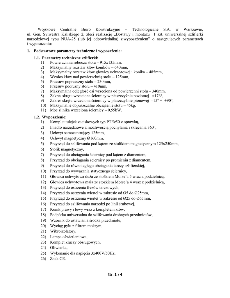Wojskowe Centralne Biuro Konstrukcyjno – Technologiczne S.A. w Warszawie, ul. Gen. Sylwestra Kaliskiego 2, zleci realizację „Dostawy i montażu 1 szt. uniwersalnej szlifierki narzędziowej typu NUA-25 (lub jej odpowiednika) z wyposażeniem” o następujących parametrach i wyposażeniu: 1. Podstawowe parametry techniczne i wyposażenie: 1.1. Parametry techniczne szlifierki: 1) Powierzchnia robocza stołu – 915x135mm, 2) Maksymalny rozstaw kłów koników – 640mm, 3) Maksymalny rozstaw kłów głowicy uchwytowej i konika – 485mm, 4) Wznios kłów nad powierzchnią stołu – 125mm, 5) Przesuw poprzeczny stołu – 230mm, 6) Przesuw podłużny stołu – 410mm, 7) Maksymalna odległość osi wrzeciona od powierzchni stołu – 340mm, 8) Zakres skrętu wrzeciona ściernicy w płaszczyźnie poziomej ±176°, 9) Zakres skrętu wrzeciona ściernicy w płaszczyźnie pionowej –15° ÷ +90°, 10) Maksymalne dopuszczalne obciążenie stołu – 45kg, 11) Moc silnika wrzeciona ściernicy – 0,55kW. 1.2. Wyposażenie: 1) Komplet tulejek zaciskowych typ PTEz50 z oprawką, 2) Imadło narzędziowe z możliwością pochylania i skręcania 360°, 3) Uchwyt samocentrujący 125mm, 4) Uchwyt magnetyczny Ø160mm, 5) Przyrząd do szlifowania pod kątem ze stolikiem magnetycznym 125x250mm, 6) Stolik magnetyczny, 7) Przyrząd do obciągania ściernicy pod kątem z diamentem, 8) Przyrząd do obciągania ściernicy po promieniu z diamentem, 9) Przyrząd do równoległego obciągania tarczy szlifierskiej, 10) Przyrząd do wyważania statycznego ściernicy, 11) Głowica uchwytowa duża ze stożkiem Morse’a 5 wraz z podzielnicą, 12) Głowica uchwytowa mała ze stożkiem Morse’a 4 wraz z podzielnicą, 13) Przyrząd do ostrzenia frezów tarczowych, 14) Przyrząd do ostrzenia wierteł w zakresie od Ø5 do Ø25mm, 15) Przyrząd do ostrzenia wierteł w zakresie od Ø25 do Ø65mm, 16) Przyrząd do szlifowania narzędzi po linii śrubowej, 17) Konik prawy i lewy wraz z kompletem kłów, 18) Podpórka uniwersalna do szlifowania drobnych przedmiotów, 19) Wzornik do ustawiania środka przedmiotu, 20) Wyciąg pyłu z filtrem mokrym, 21) Wibroizolatory, 22) Lampa oświetleniowa, 23) Komplet kluczy obsługowych, 24) Oliwiarka, 25) Wykonanie dla napięcia 3x400V/50Hz, 26) Znak CE. Str. 1 z 4 1.3. Dokumentacja: 1) Instrukcja obsługi i konserwacji maszyny w j. polskim (DTR). 2. Cena dostawy obejmować będzie: dostarczenie 1 szt. szlifierki w kompletacji jak w pkt. 1, loco WCBKT S.A., instalację szlifierki, montaż i uruchomienie, przeprowadzenie testów sprawdzających poprawność działania (odbiór) oraz szkolenie. 3. Oferty należy składać w terminie do 31.07.2014 r. do godz. 14:00 na „Formularzu ofertowym” dostępnym na stronie internetowej www.wcbkt.pl na adres: Wojskowe Centralne Biuro Konstrukcyjno – Technologiczne S.A. 00-908 Warszawa ul. Gen. Sylwestra Kaliskiego 2 Na wejście na teren Spółki wymagane jest uzyskanie zgody pracownika kancelarii tel. 22 683 72 14 4. Dostawca zamieszcza ofertę w zewnętrznej i wewnętrznej kopercie z tym, że: a) zewnętrzna koperta powinna być oznaczona w następujący sposób: „Dostawa i montaż 1 szt. uniwersalnej szlifierki narzędziowej typu NUA-25 (lub jej odpowiednika) z wyposażeniem” „Do rąk własnych Szefa Komisji – nie otwierać przed dniem otwarcia ofert tj. 04.08.2014 r. godz. 12:15” , bez nazwy i pieczątki Dostawcy b) koperta wewnętrzna powinna zawierać ofertę i być zaadresowana na Dostawcę, tak aby można było odesłać ofertę w przypadku jej złożenia po terminie. 5. Oferta musi być sporządzona według wzoru „Formularza ofertowego” stanowiącym załącznik nr 1 do niniejszego ogłoszenia. 6. Dostawca musi przedstawić treść oferty odpowiadającą treści niniejszego ogłoszenia oraz „Formularza ofertowego” pod warunkiem wykluczenia z dalszego udziału w prowadzonym postępowaniu. 7. Dostawca ma prawo złożyć tylko jedną ofertę. 8. Oferta ma być napisana w języku polskim, na komputerze lub inną trwałą i czytelną techniką oraz podpisana przez osobę upoważnioną do reprezentowania firmy na zewnątrz i zaciągania zobowiązań w wysokości odpowiadającej cenie oferty. 9. Upoważnienie do podpisania oferty powinno być dołączone do oferty, o ile upoważnienie nie wynika z innych dokumentów dołączonych do oferty. Upoważnienie (pełnomocnictwo) powinno być przedstawione w formie oryginału lub poświadczonej notarialnie kopii. 10. Dokumenty załączone do oferty powinny być przedstawione w formie oryginału lub kserokopii potwierdzonej za zgodność z oryginałem przez Dostawcę (podpisuje osoba upoważniona do podpisywania oferty). 11. Każda zapisana strona oferty oraz załączonych oświadczeń i dokumentów powinna być ponumerowana kolejnymi numerami a wszystkie kartki oferty należy spiąć w sposób trwały. 12. Wszelkie poprawki lub zmiany w tekście oferty muszą być parafowane własnoręcznie przez osobę podpisującą ofertę. Str. 2 z 4 13. Dostawca może wprowadzić zmiany lub wycofać złożoną przez siebie ofertę pod warunkiem, że Zamawiający otrzyma pisemne powiadomienie o wprowadzeniu zmian lub wycofaniu oferty przed upływem terminu składania ofert. Powiadomienie o wprowadzeniu zmian lub wycofaniu musi być złożone wg takich samych zasad jak składana oferta. Koperta powinna zostać dodatkowo oznaczona napisem „Zmiana" lub „Wycofanie". Dostawca nie może wycofać oferty ani wprowadzić jakichkolwiek zmian treści oferty po upływie terminu składania ofert. 14. Od Dostawcy wymagane jest bardzo szczegółowe zapoznanie się z przedmiotem zamówienia, a także sprawdzenie warunków wykonania zamówienia. 15. Cena oferty powinna uwzględniać wszystkie koszty związane z wykonaniem przedmiotu zamówienia – zgodnie z przedstawioną wyżej specyfikacją. 16. Cena oferty stanowić będzie ryczałtowe i ostateczne wynagrodzenie Dostawcy za wykonanie przedmiotu zamówien