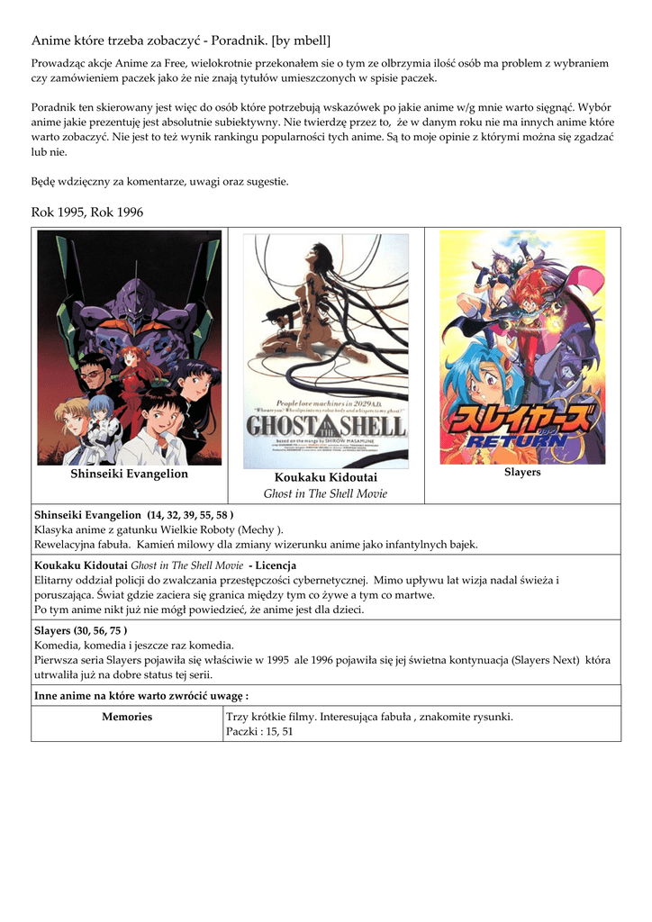 Anime które trzeba zobaczyć - Poradnik. [by mbell] Prowadząc akcje Anime za Free, wielokrotnie przekonałem sie o tym ze olbrzymia ilość osób ma problem z wybraniem czy zamówieniem paczek jako że nie znają tytułów umieszczonych w spisie paczek. Poradnik ten skierowany jest więc do osób które potrzebują wskazówek po jakie anime w/g mnie warto sięgnąć. Wybór anime jakie prezentuję jest absolutnie subiektywny. Nie twierdzę przez to, że w danym roku nie ma innych anime które warto zobaczyć. Nie jest to też wynik rankingu popularności tych anime. Są to moje opinie z którymi można się zgadzać lub nie. Będę wdzięczny za komentarze, uwagi oraz sugestie. Rok 1995, Rok 1996 Shinseiki Evangelion Koukaku Kidoutai Ghost in The Shell Movie Slayers Shinseiki Evangelion (14, 32, 39, 55, 58 ) Klasyka anime z gatunku Wielkie Roboty (Mechy ). Rewelacyjna fabuła. Kamień milowy dla zmiany wizerunku anime jako infantylnych bajek. Koukaku Kidoutai Ghost in The Shell Movie - Licencja Elitarny oddział policji do zwalczania przestępczości cybernetycznej. Mimo upływu lat wizja nadal świeża i poruszająca. Świat gdzie zaciera się granica między tym co żywe a tym co martwe. Po tym anime nikt już nie mógł powiedzieć, że anime jest dla dzieci. Slayers (30, 56, 75 ) Komedia, komedia i jeszcze raz komedia. Pierwsza seria Slayers pojawiła się właściwie w 1995 ale 1996 pojawiła się jej świetna kontynuacja (Slayers Next) która utrwaliła już na dobre status tej serii. Inne anime na które warto zwrócić uwagę : Memories Trzy krótkie filmy. Interesująca fabuła , znakomite rysunki. Paczki : 15, 51 Rok 1997 Rok 1998 Mononoke Hime Cowboy Bebop Yokohama Kaidashi Kikou Mononoke Hime - LICENCJA Po wielu miesiącach kiedy naprawdę nie było nic wartego obejrzenia pojawia się ona : Rewelacja. Wielki powrót studia Ghibli Alegoryczna opowieść o przemijaniu. O dokonywaniu wyborów O odwadze i odpowiedzialności. A wszystko bez kropli dydaktyki czy moralizatorstwa. Niesamowite. Cowboy Bebop - LICENCJA Daleka Przyszłość. Dość niezwykła grupa osób pracuje jako łowcy nagród ( łapią przestępców za których wyznaczono nagrody ) Świetne kino akcji. Rewelacyjne postacie. Ogląda sie to jednym tchem. Klimat ma coś z kryminałów Raymonda Chandlera. Yokohama Kaidashi Kikou ( 6, 15 ) Opowieści o kawiarni w małym miasteczku.. W miarę jak rozwija sie historia dostrzegamy coraz więcej dziwnych i niepokojących rzeczy które bohaterom jakby wydają się oczywiste. Powoli zaczynamy odkrywać elementy układanki. To dwie kameralne opowieści, niesłychanie melancholijne i piękne Serial Experiments Lain Kareshi Kanojo no Jijou Serial Experiments Lain ( 2, 32 ) Jedno z najlepszych anime S-F. Stawiające widzowi filozoficzne pytania: kim jest Bóg , czy istniejemy czy tez to tylko nasze złudzenie itd. Wciska w fotel. Kareshi Kanojo no Jijou (1) Jedno z moich ulubionych anime. Niedościgniony wzór w swoim gatunku a mianowicie Romans + Szkoła. Historia nieoczekiwanego uczucia między dwojgiem "najlepszych" uczniów w szkole. Prosta historia ale jak narysowana i opowiedziana. Inne anime na które warto zwrócić uwagę : Photon Całkiem sympatyczna komedyjka. Paczki: 49, 55 Trigun Western w stylu S-F. Duża doza humoru. Kreska pozostawia wiele do życzenia ale ma swoich zwolenników. Paczki :23, 27, 46, 61, 98 Yume de Aetara Anime uznawane za jeden z lepszych romansów Paczki 4, 60, Ao no 6-gou Blue Submarine No. 6 Fantastyczna wizja świata gdzie oceany zalewają lądy a w morzach pojawia się nowa agresywna rasa morskich istot. Paczki: 5, 37, 60 Rok 1999 Rurouni Kenshin: Meiji Kenkaku Romantan - Tsuiokuhen Great Teacher Onizuka One Piece Rurouni Kenshin: Meiji Kenkaku Romantan - Tsuiokuhen (46, 61, 114) Absolutny hit. Od wielu lat nieustające pierwsze miejsce na różnych rankingach. Okrutna, krwawa a zarazem niezwykle wzruszająca saga samurajska. Opinia tu wygłoszona dotyczy 4 częściowej serii OAV .Na historię o Kenshinie składa się jeszcze serial TV i Film i druga OAV. Serial jest skierowany do młodszej widowni i może zawieść osoby które oczekiwały czegoś więcej. Film i druga OAV to już kompletna porażka. Great Teacher Onizuka - LICENCJA Szef gangu motocyklistów nieoczekiwanie jako świetny nauczyciel w liceum. Daje popalić zarówno uczniom jak i gronu pedagogicznemu. Seria naprawdę niezła choć pod koniec daje się odczuć pewną monotonię. One Piece ( 33, 53, 117, 118, 119) Młody pirat wyrusza na morze aby zdobyć legendarny skarb. Seria moloch trwająca nieprzerwanie aż do dzisiaj. (290 odcinków do tej pory) Opowieść niezwykła. Wciągająca. Pokochasz ją lub znienawidzisz. Coś jakby Piraci z Karaibów w odcinkach. Rewelacja. Inne anime na które warto zwrócić uwagę : Mugen no Rywius Niezłe anime z gatunku Mechy. Wiele osób mi je zachwalało niemniej nadal nie znalazłam czasu żeby je zobaczyć. Paczki : 60, 71, 99 Ima, Soko ni Iru Boku Now and Then, Here and There Pierwsze wrażenie może zniechęcić. I kreska jakaś taka nijaka , i postacie ... ale w sumie wyszło to całkiem nieźle. Dzielny młodzian rusza na ratunek dziewczynie z innego świata. Paczki : 42, Seikai no Monshou Crest of the stars Space Opera. Na całość, podobnie jak w Slayers składa się kilka serii. Kiedyś bardzo popularna, obecnie trąci myszką. Paczki 21, Rok 2000 Jin-Roh Furi Curi Furi Curi (3, 32, 101) Mini serial, 6 odcinków. Arcydzieło humoru ale i zarazem inteligentna zabawa z widzem. Pastisz najrozmaitszych gatunków. Eksperymenty wizualne. Osoby nieprzygotowani na taka jazdę często doznają bólu głowy z natłoku wrażeń. Anime do którego się wraca. Jin-Roh (15, 39, 66) Mroczna wizja totalitarnego świata przyszłości. Komandos reżimu próbuje przeciwstawić się systemowi. Trochę przewrotnie, tę historię można odczytać jako adaptację Czerwonego Kapturka braci Grimm ale w oryginalnej okrutnej wersji. Nie umniejsza to jak